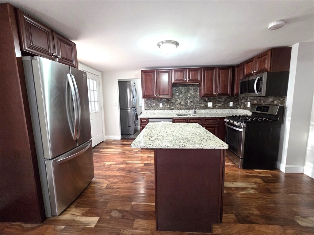 Beautifully Renovated! Spacious 2-3 Bedroom Townhouse style apartment. The entire unit has been completely renovated and features a brand new cherry kitchen with granite counters, stainless steel appliances, and center island. GLEAMING hardwood floors throughout, formal dining, 2 FULL renovated bathrooms, washer/dryer and laundry included as well as a large shared yard. Spacious master suite features a master bath with soaking tub, walk in closet, and adjoining room that could be used as a 3rd bedroom or office/den. Minutes to highway & shopping. Non-Smoking Property. Good Credit, Rental History, References Required.