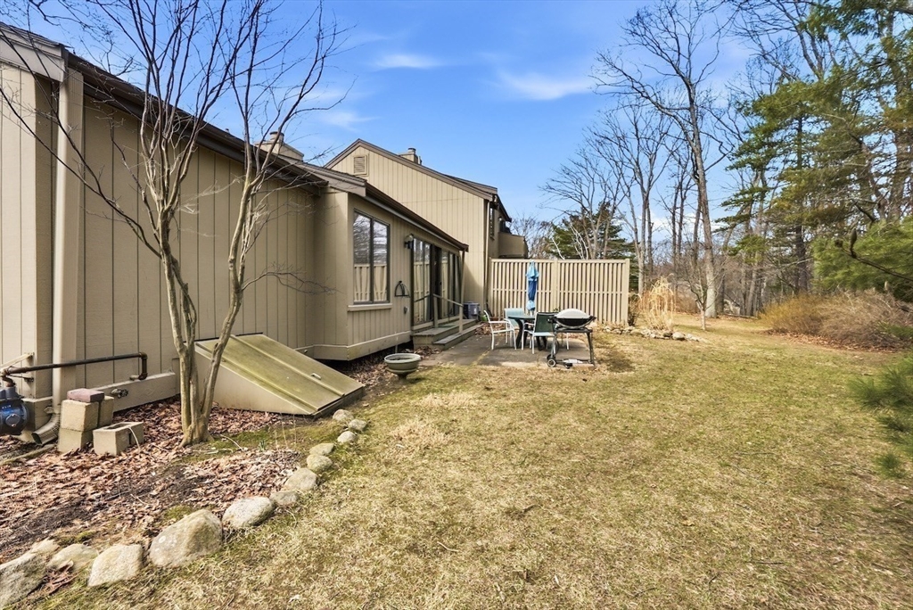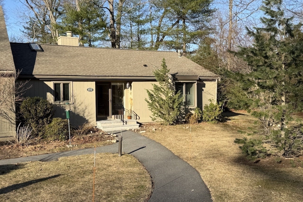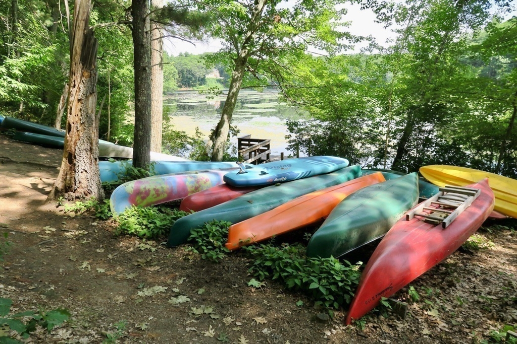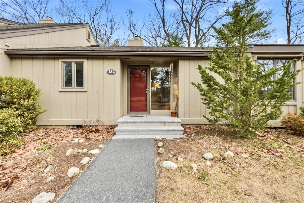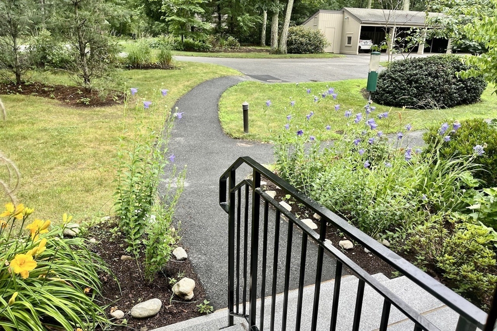 Rare one-level end unit townhouse surrounded by nature. Farrar Pond Village amenities include common gardens, playground, canoe landing, dock, walking trails and extensive conservation land. Gracious entry foyer welcomes you. Fully updated kitchen adjoins an open concept skylit dining room and expansive living area with wood fireplace, hardwood floors, and a wall of sliding doors. Landscaped back yard with patio and side yard provide a sense of privacy for relaxation and entertaining. Entry hall leads to a full bath, front corner bed, laundry closet, and spacious primary bed suite with bath. Large full height unfinished basement is ready to be developed into added living space. Recent upgrades include carpets in both bedrooms, washer & dryer, hot water tank, gas furnace & central AC. Deeded carport plus outdoor parking space. Professionally managed care-free living just minutes to Walden Pond, Lincoln commuter rail and markets. Easy access to Rt.2 for Cambridge, Boston and points west.