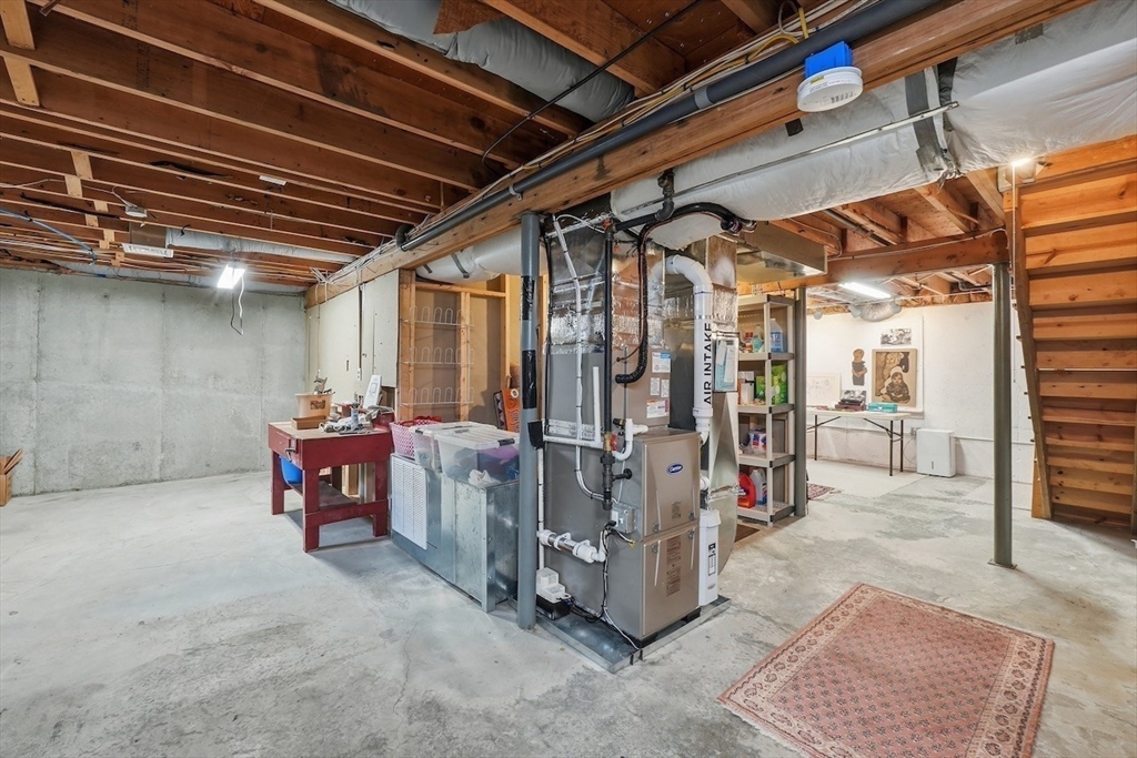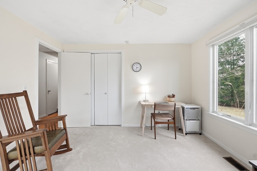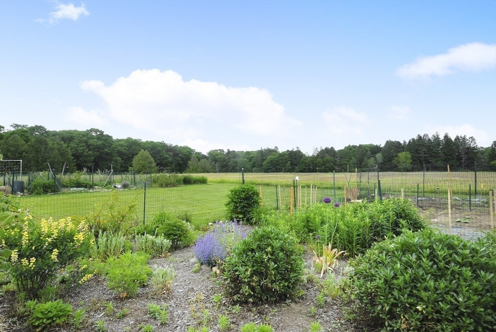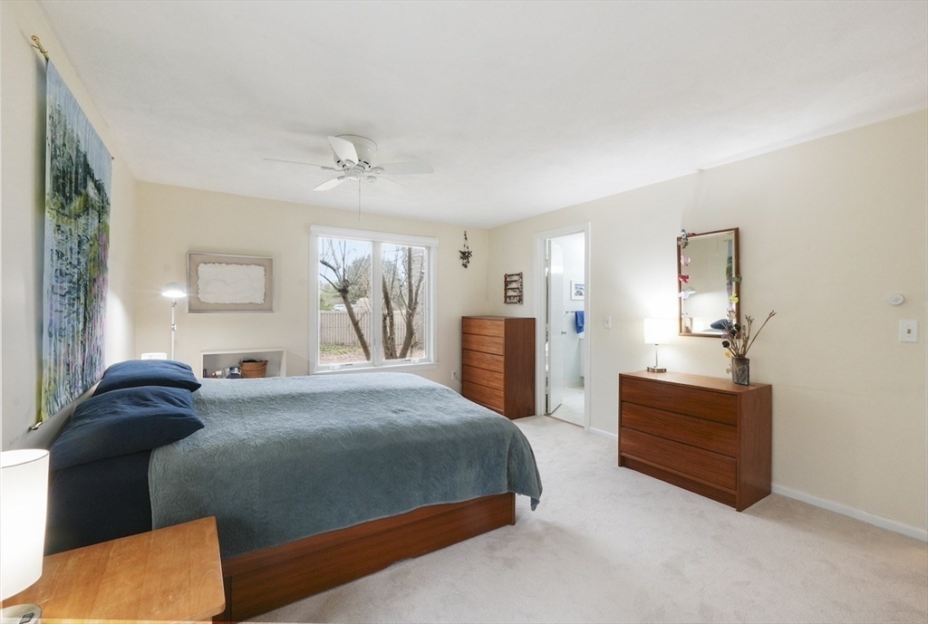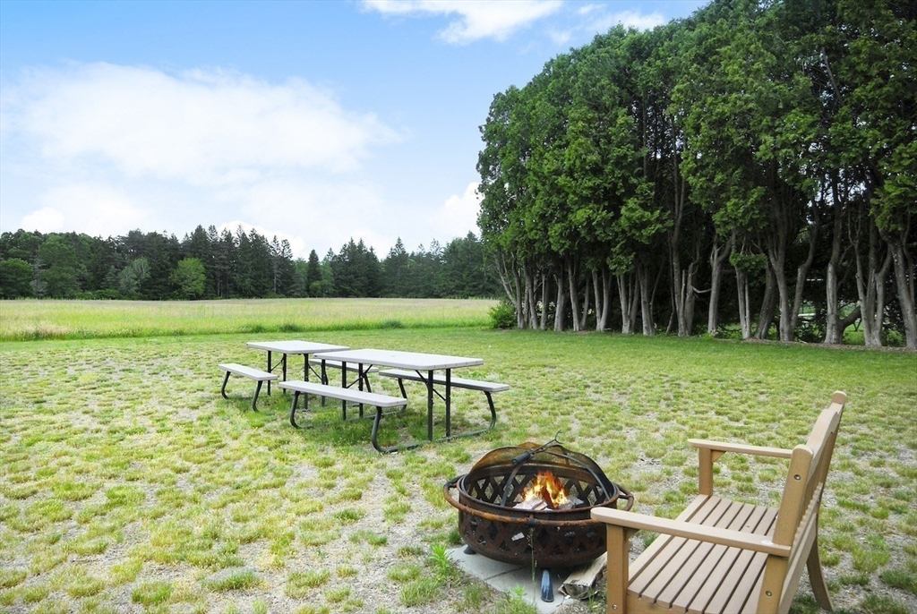Rare one-level end unit townhouse surrounded by nature. Farrar Pond Village amenities include common gardens, playground, canoe landing, dock, walking trails and extensive conservation land. Gracious entry foyer welcomes you. Fully updated kitchen adjoins an open concept skylit dining room and expansive living area with wood fireplace, hardwood floors, and a wall of sliding doors. Landscaped back yard with patio and side yard provide a sense of privacy for relaxation and entertaining. Entry hall leads to a full bath, front corner bed, laundry closet, and spacious primary bed suite with bath. Large full height unfinished basement is ready to be developed into added living space. Recent upgrades include carpets in both bedrooms, washer & dryer, hot water tank, gas furnace & central AC. Deeded carport plus outdoor parking space. Professionally managed care-free living just minutes to Walden Pond, Lincoln commuter rail and markets. Easy access to Rt.2 for Cambridge, Boston and points west.