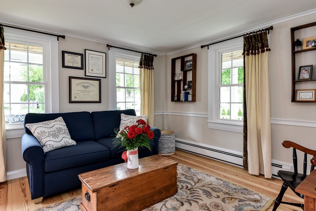 This welcoming antique has been beautifully renovated and restored! The property includes a large level lot, spacious patio, and porch all perfect for relaxing and entertaining. The wrap around farmer's porch welcomes guests to this in town home which seamlessly blends the character and charm of the circa 1860 home with modern conveniences. Gorgeous 9" wide hardwood throughout most of the first floor. Recently refinished hardwood on the second floor. The remodeled kitchen is bright and functional with eating area, stainless appliances, farmhouse sink, quartz countertops. Large step down family room has rustic beamed ceiling and gorgeous stone feature wall. The office/gym/flex room has sliders to the private patio. Three bedrooms and remodeled bath with tiled shower and new vanity complete the second floor. Recent updates include new furnace, updated electrical, (200 amp) and new windows. Fabulous location so close to schools, town common, and library!
