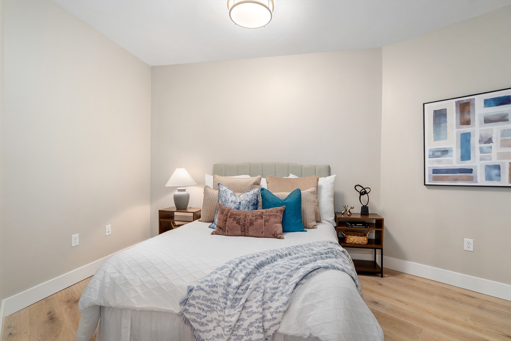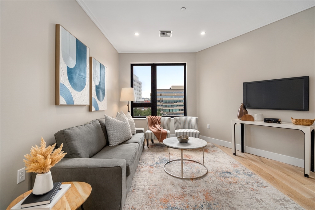 This refined condo showcases exceptional design, upscale finishes, and a truly turnkey unit. The thoughtfully designed open floor plan features engineered hardwood floors that flow seamlessly throughout and abundant natural light, creating an elegant and inviting living space. The kitchen is a standout, featuring stone countertops, a tiled backsplash, sleek shaker cabinetry, and a full suite of stainless steel Bosch appliances. A generously sized island with seating adds flexibility for dining, entertaining, or everyday living. The "junior 1 bedroom" is comfortably proportioned with ample closet space, while the spa-inspired bath features refined tilework and matte black fixtures. Full-size In-unit laundry adds convenience. Building amenities include concierge services, intercoms, elevator, fitness center, clubroom, and an amazing shared roof deck & outdoor spaces. Prime location in Brighton w/ easy access to dining, shopping, commuter options. Nothing to do but unpack and enjoy!