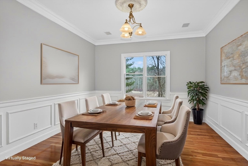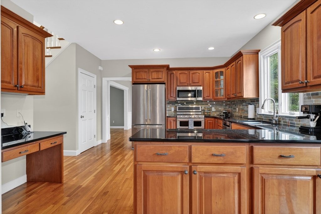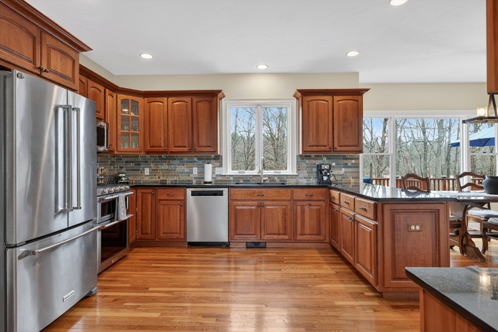 This beautifully maintained home features hardwood flooring throughout & a spacious, well-designed layout ideal for today’s lifestyle. The custom eat-in cherry kitchen with granite countertops is both stylish & functional. The main level offers an inviting family room with a marble fireplace, solid cherry mantel, & custom built-ins, along with a formal dining room & formal living room. A first-floor office provides the perfect space for working from home. Upstairs, you’ll find three generously sized bedrooms plus a large bonus room over the garage, offering flexible space for a playroom, media room, or guest suite. The finished lower level game room adds additional living space, featuring separate wine cellar, and a striking stone fireplace with bluestone mantel and hearth. New roof 2025, electric vehicle charger, manual transfer switch w/generator hookup, new hot water heater. Enjoy the outdoors in a private setting w/scenic views overlooking the Assabet River!