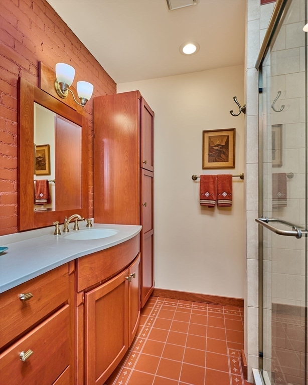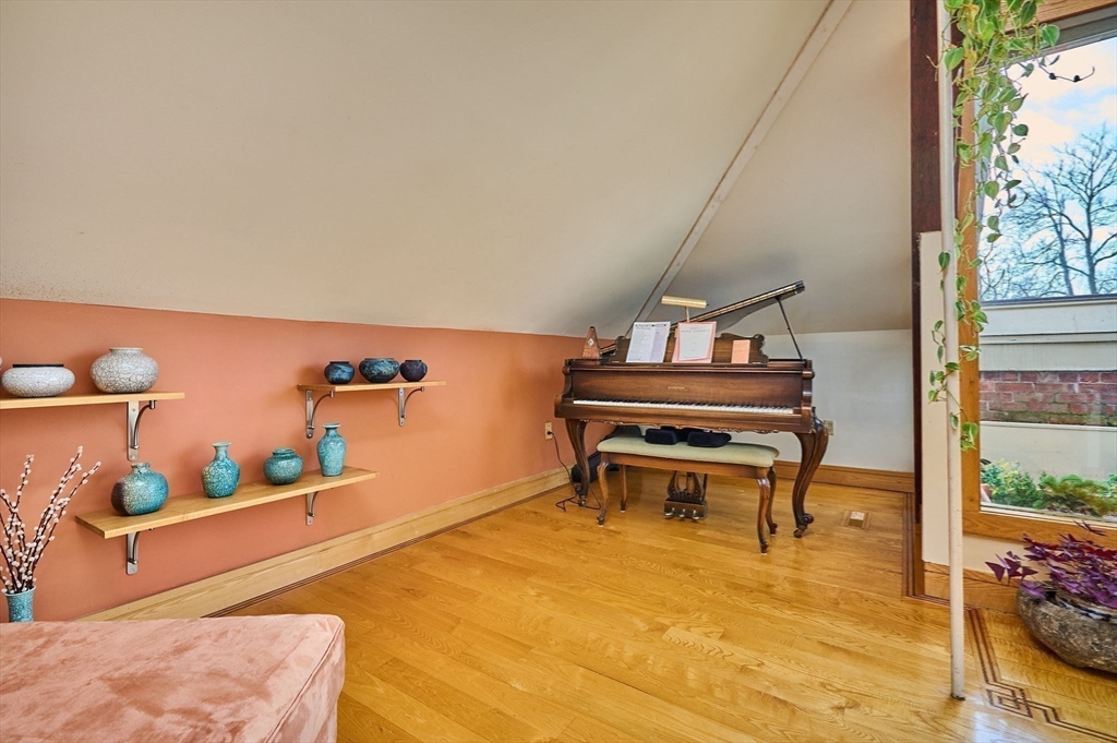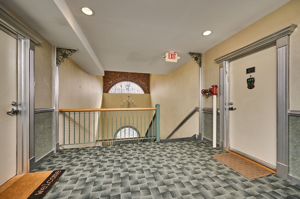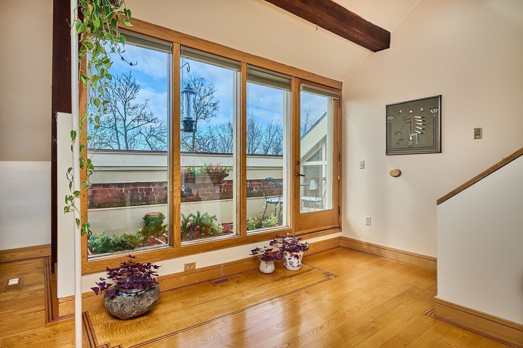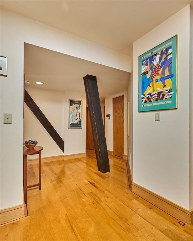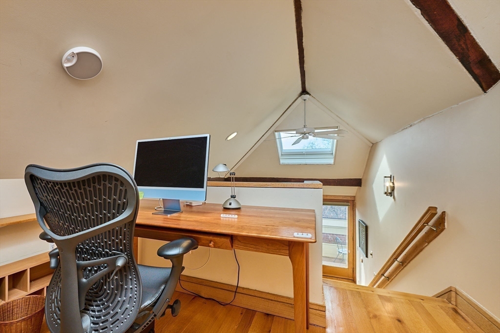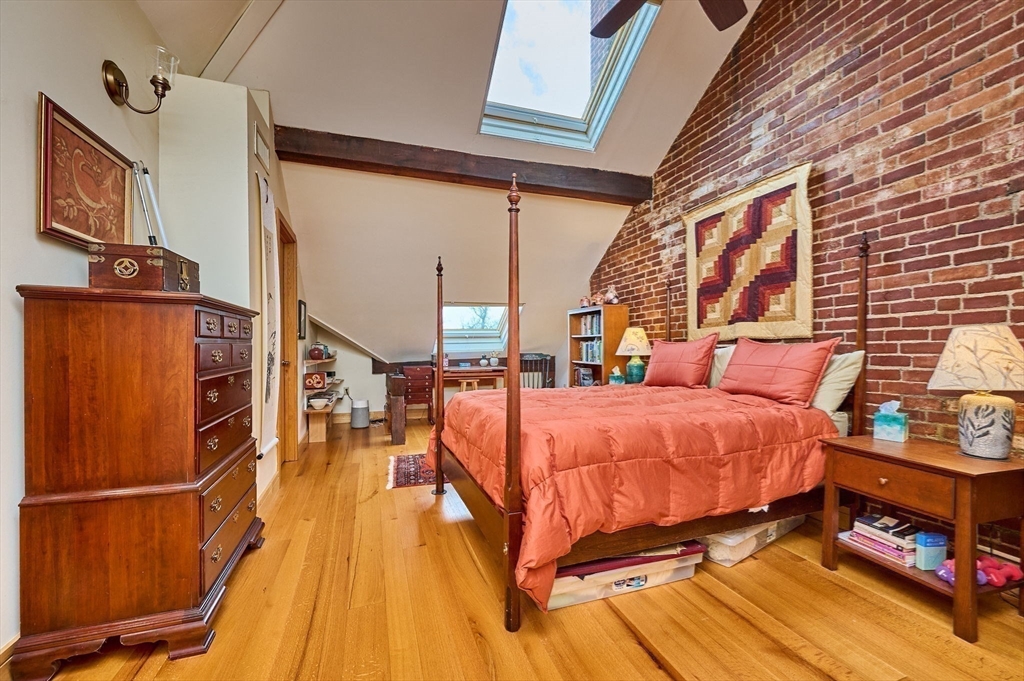 Penthouse end-unit at Old School Commons! Exceptional condominium ideally located next to Smith College + Pulaski Park in downtown Northampton. From your top-floor private deck, enjoy expansive south-facing windows w/sweeping, seasonal long range mountain views. Natural sunlight adorns this distinctive post-and-beam home! The building itself + common areas are equally impressive: keyed entry, elevator + exclusive parking. Inside, the open floor plan showcases Ash floors w/Australian Lacewood inlay. Charming kitchen + dining room offers honed slate counters, induction stove, travertine tile backsplash, walk-in pantry. Sun-filled living room is both spacious + stylish. Enjoy 2 thoughtfully renovated baths w/tiled showers as well as the cleverest closet + storage space imaginable! Top level boasts skylit primary suite w/oak floors, lofted office overlooking living room. PLUS, New central AC + water heater (2023), in-unit washer/dryer, welcoming entryway, Hunter Douglas shades and more!