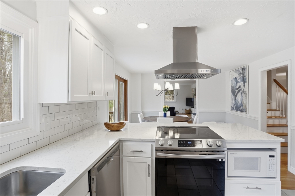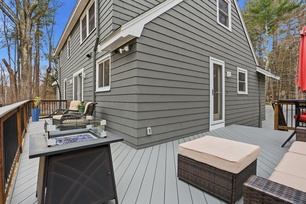 Appealing contemporary cape with 3 bays of garage ( new 2 car detached ) set on 1.41 a. over looking conservation land and just .8 miles to Acton train! Desirable white cabinet kitchen with ss appliances and quartz counter breakfast bar opens to the dining area which overlooks the newer upper composite deck.This unique floor plan offers 2 bedrooms and a full bath on 1st level plus a living room with a wood burning fireplace . The second floor houses 2 more bedrooms , including a full bath plus a walk in attic for extra storage. Desirable hardwood floors grace the main rooms, with tile in all the baths. A lower level family room is cozy with a fireplace and room for crafts and display shelves, plus a half bath. There are 6 minisplits for AC or Heat! The exterior includes a shed, wrap around composite deck ,patio and loads of privacy. Acton boasts multiple supermarkets,excellent shopping, top rated schools. Drive down High St to RT.62 and avoid rotary traffic !