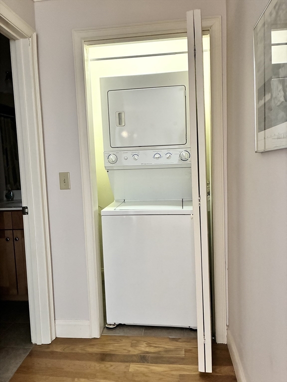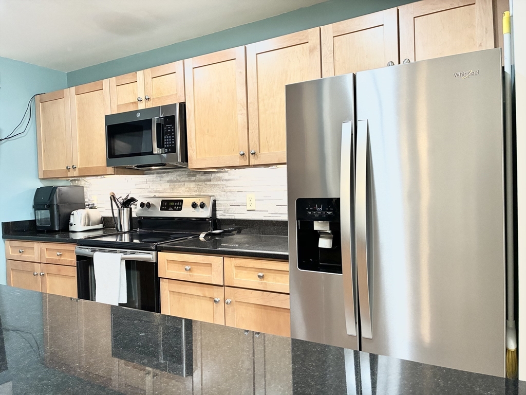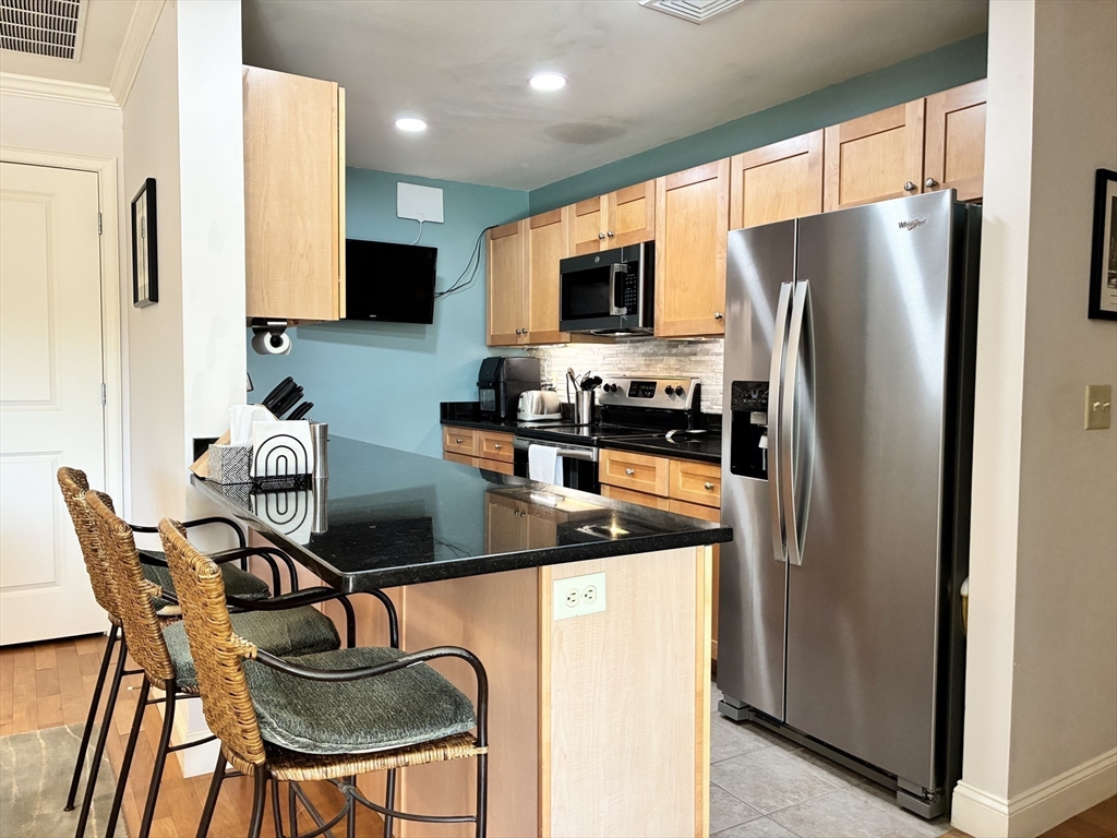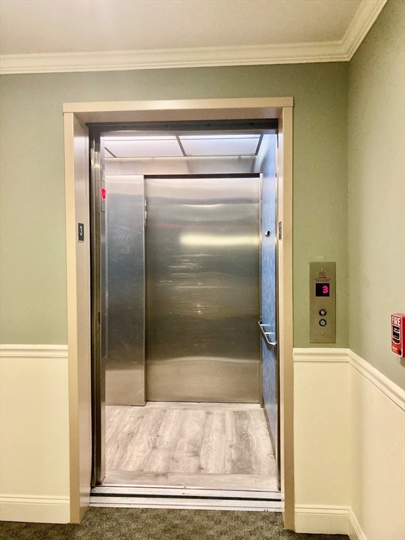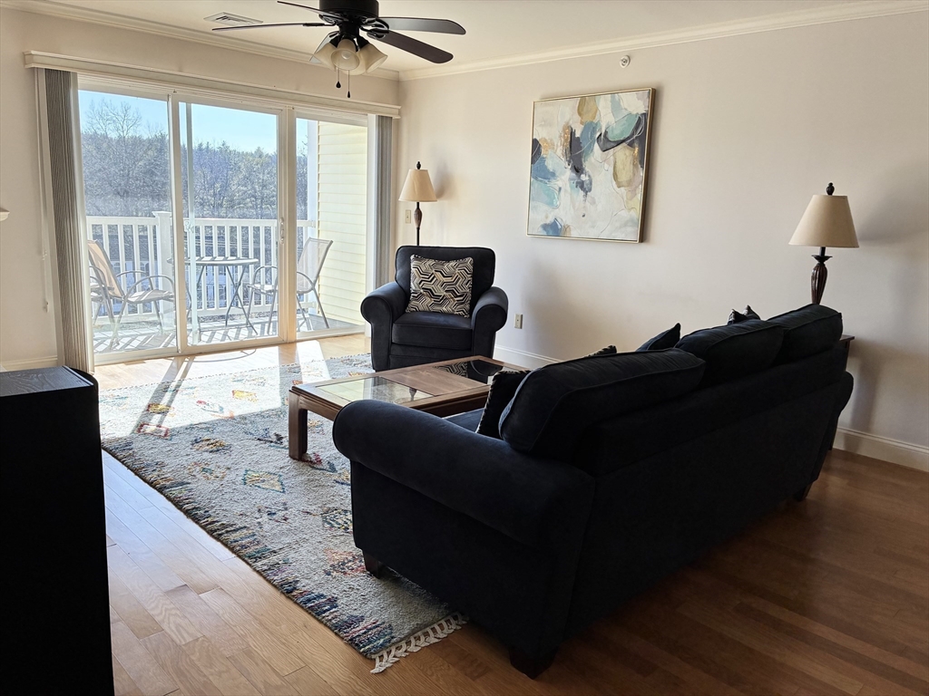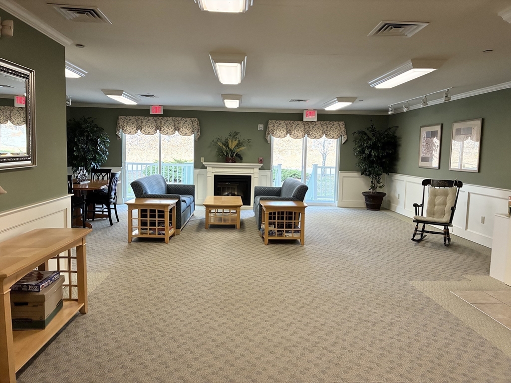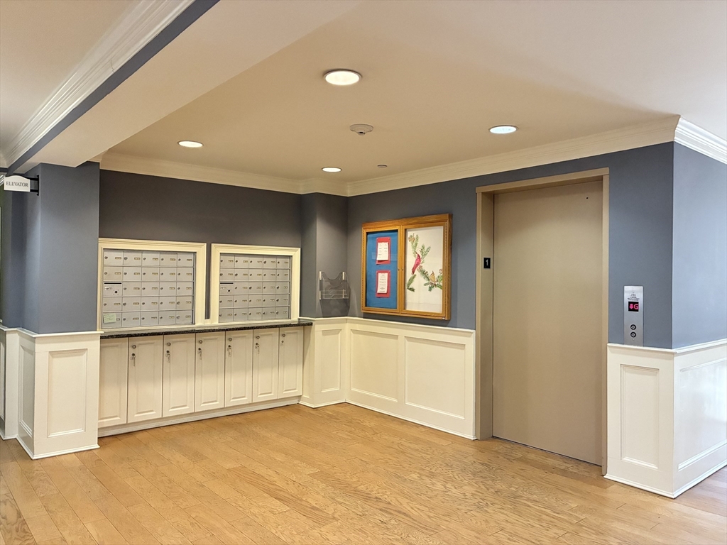 NEW LIST! Top floor, two bedrm & two bath condo in excellent condition for sale. Combo living /dining rm w/ hardwood floors, corner electric fp, two coat closets & slider to private balcony. Cabinet packed maple kitchen is fully applianced w/ granite countertops, tile floors, tile backsplash, under cabinet lighting, recessed lights & breakfast bar w/ counter seating. Master suite is spacious & has pond view, walk-in closet, & full bath with shower. Second bedroom & full bath on opposite side of unit. Affordable Gas heat, central air, top flr, hardwood floors thruout, 2026 microwave & cable ready. Condo includes washer & dryer combo unit. Building has an elevator that goes to all flrs, EZ access trash chute, plus parking garage under building. Sale includes one deeded parking space in garage w/ additional parking lot in front of the building. Condo building has intercom system for easy visitor access, mailroom, PLUS event room w/kitchen, half bath, fireplace & room for you to entertain.