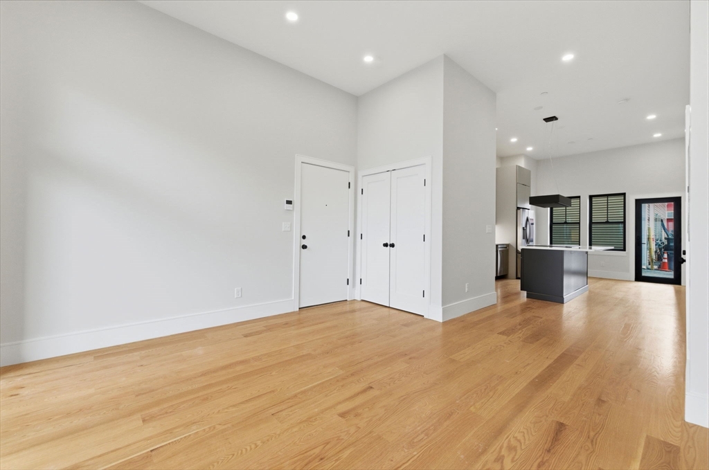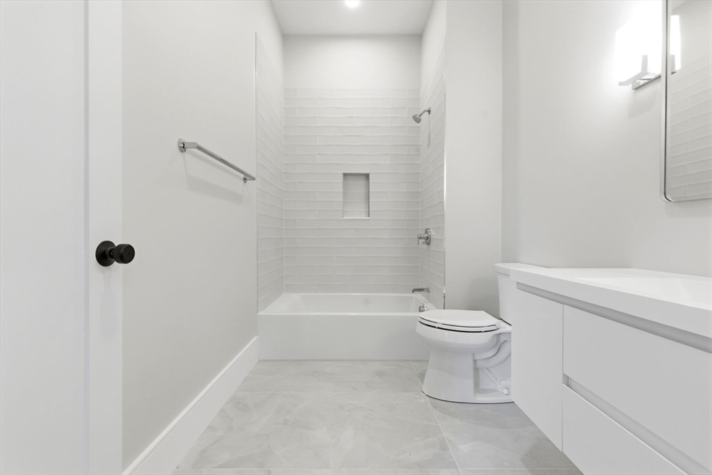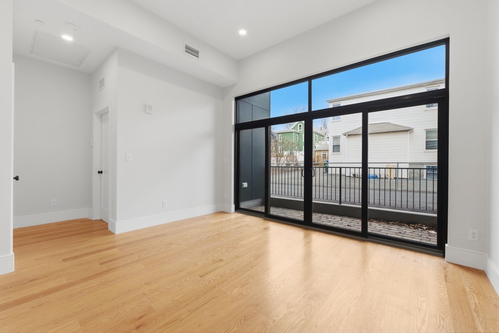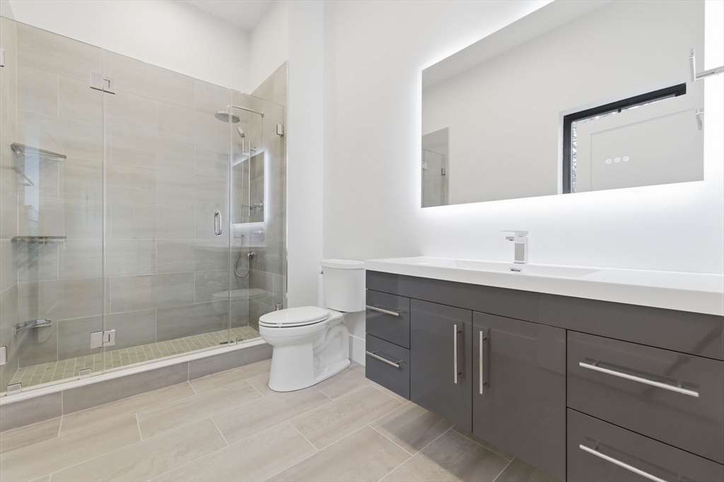 Welcome to The Doherty West Medford, where contemporary design meets modern convenience. This boutique 9-unit condominium complex offers thoughtfully designed residences with stylish finishes throughout. This exceptional ground-level 2-bedroom, 2-bath home features a private patio and its own private exterior entrance leading directly to one deeded parking space. The sleek kitchen is outfitted with gray cabinetry, an elegant hexagon tile backsplash, Samsung appliances including a touchscreen refrigerator, and a center island with an induction cooktop and sophisticated hanging hood. A ground-level café adds everyday convenience right outside your door. Ideally located just 0.1 miles from the West Medford MBTA station, this home offers easy access to public transportation, local restaurants, shops, and parks. With major routes nearby, commuting to Boston and surrounding communities is simple. Nearby amenities also include the Middlesex Fells Reservation and Tufts University.