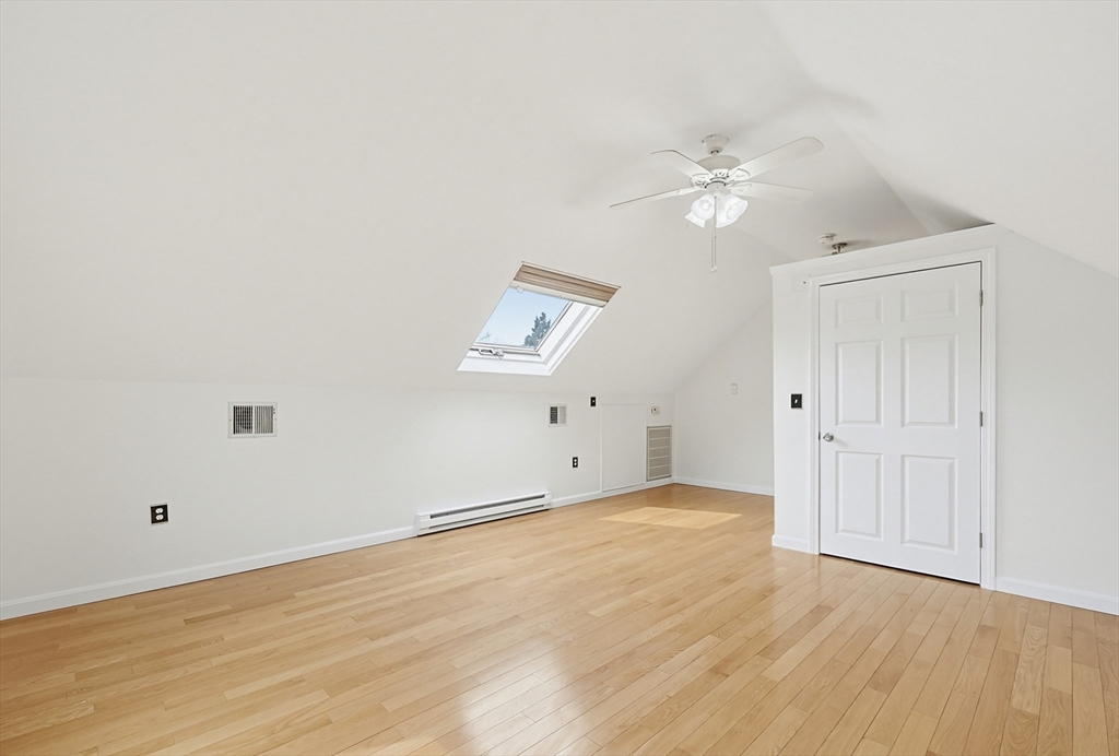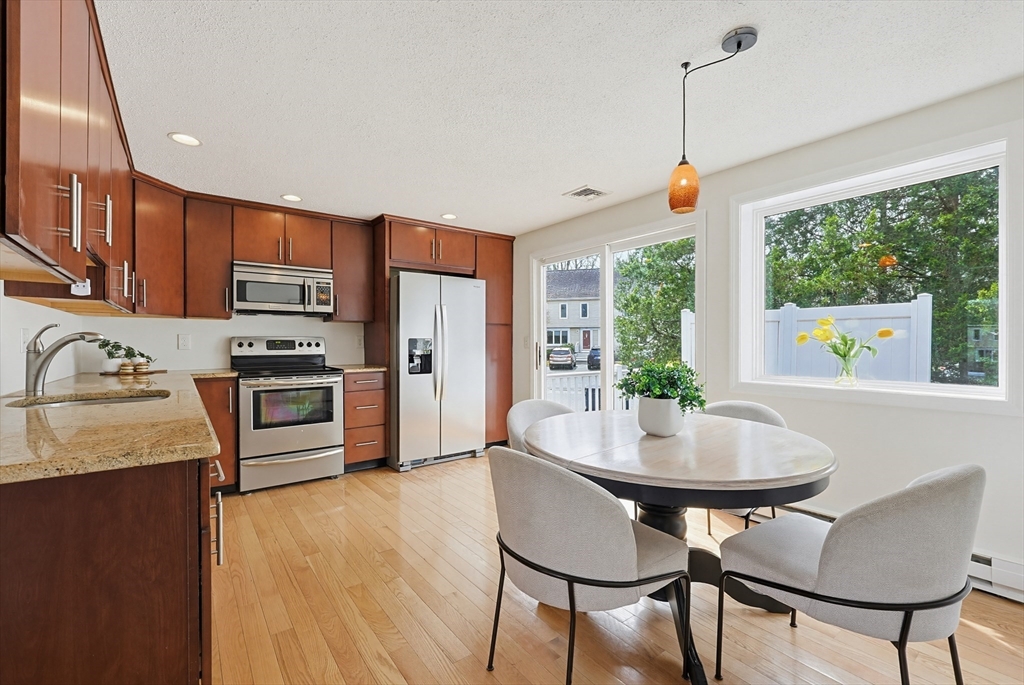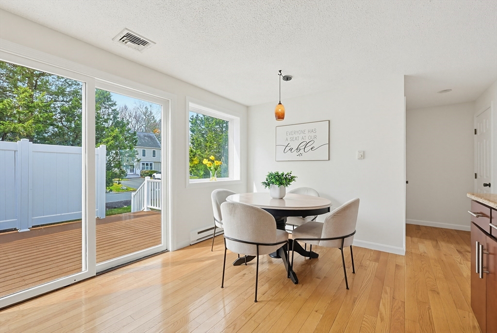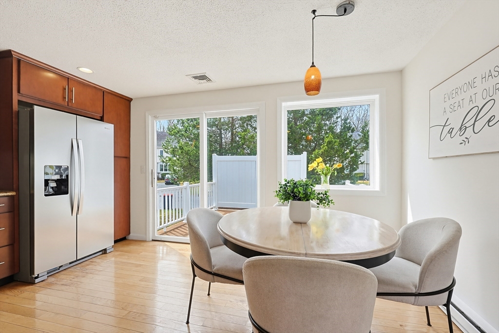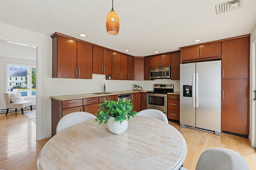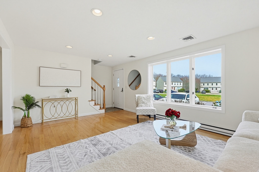 Welcome to The Ledges, a highly sought-after community surrounded by acres of serene land and mature trees. This beautiful 2–3 bedroom end-unit condo offers privacy and space with hardwood floors throughout. The updated kitchen features modern finishes and a slider leading to a trex deck. The main level also includes a convenient half bath and a generously sized living room filled with natural light. Upstairs, you’ll find two spacious bedrooms and a full bath with beautiful tile work. The third-floor loft provides a versatile bonus space with hardwood flooring, closet, window, and skylight, ideal for a home office, guest room or playroom. Additional features include an unfinished basement with laundry, central air, and efficient electric heat with individual room zones, serviced by the amazing North Attleboro Electric. OPEN HOUSE FRIDAY 4/3 12-1 AND SATURDAY 4/4 12-1:30.