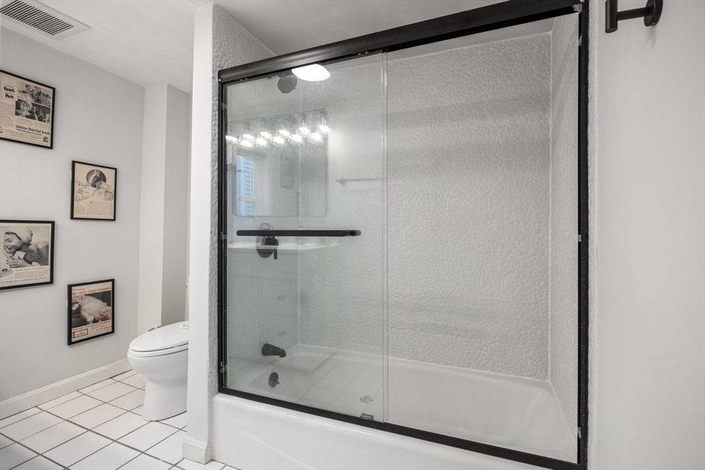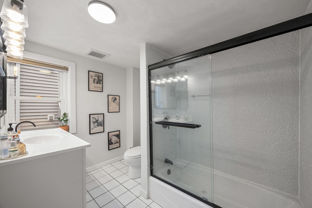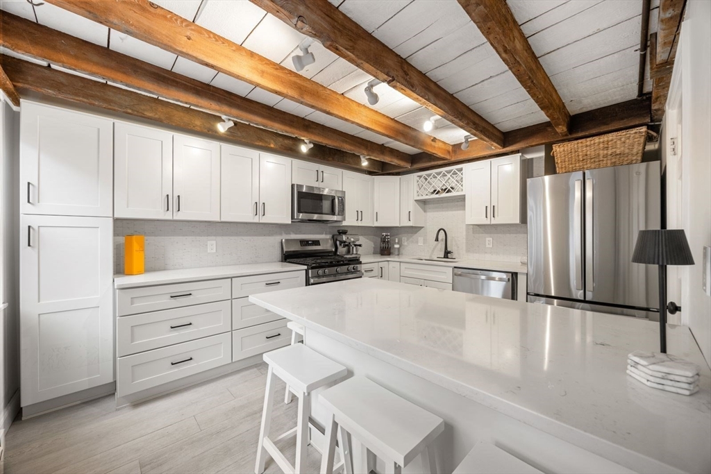 Distinctive single-family set behind a private gateway along a secluded pathway, featuring a beautifully landscaped courtyard garden with mature perennials and over 1,000 bulbs and a cute garden shed—recognized as a Boston Garden Contest finalist. A compelling alternative to condo living, blending modern updates with old world charm.The kitchen redesigned to maximize space and functionality, offering a central island, exposed wood beams, granite countertops, and stainless steel appliances. A reimagined full bath and laundry area complete this level.Upstairs, the sun-filled living room showcases original wide pumpkin pine floors and a wood-burning fireplace, along with an updated full bathroom. The top floor is devoted to two cathedral-ceiling bedrooms, including a light-filled primary with skylight and additional hallway storage complete this level. A rare blend of timeless charm, excellent walkability to downtown, the waterfront, and local dining.