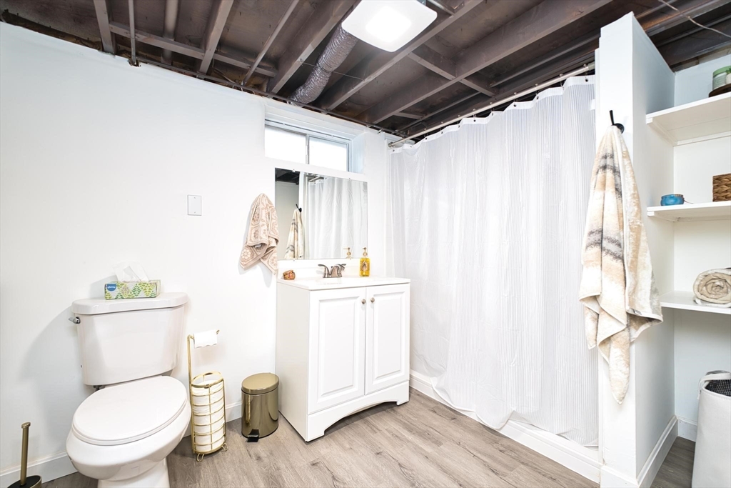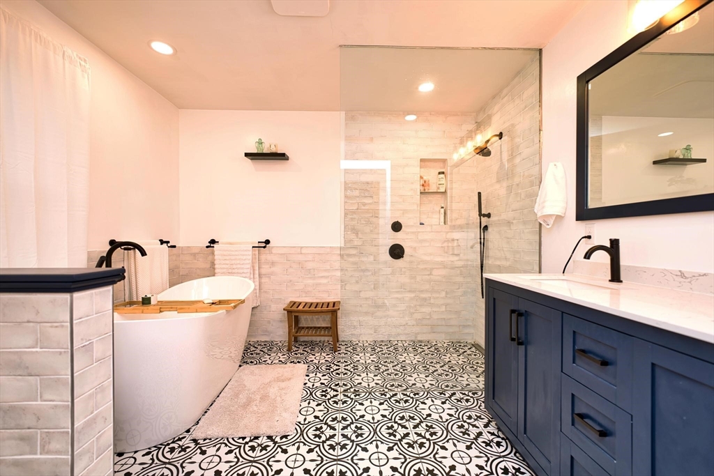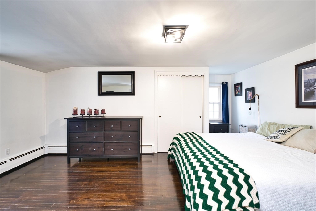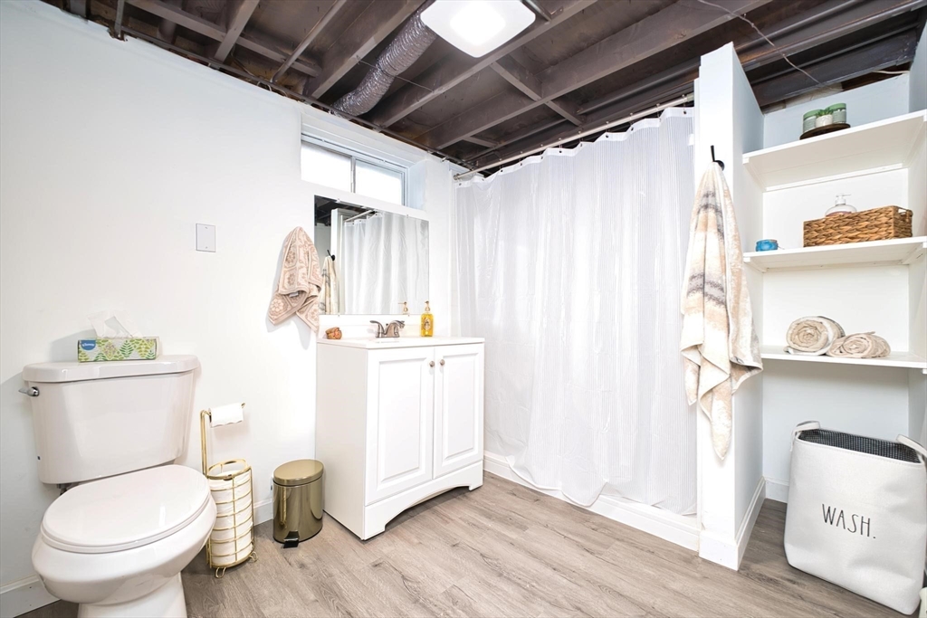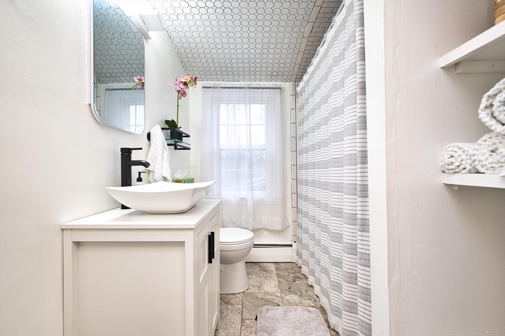 Fully updated 3-bedroom, 3.5-bath Cape style home. Featuring a first-floor primary suite with heated floors, soaking tub, and stand-up shower. Bright, spacious kitchen with island, stainless appliances, and abundant natural light opens to a cozy living area with a working wood-burning fireplace. Large mudroom with access to one car detached garage. First-floor laundry for convenience. Upstairs offers two additional spacious bedrooms and a full bath. Finished basement offers three additional rooms, a full bathroom, a storage area, and walk-out access to the fenced backyard. Step outside and Enjoy the low maintenance Trex deck, large shed, and well-maintained fenced yard. Updates include newer boiler and hot water tank, plus French drains. Close to shopping and highway access. Solar panels are leased and to be assumed by new owner.
