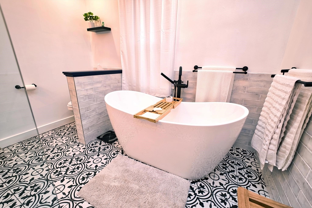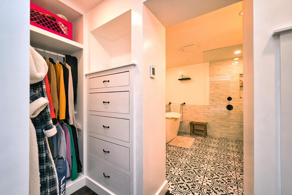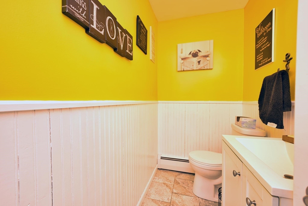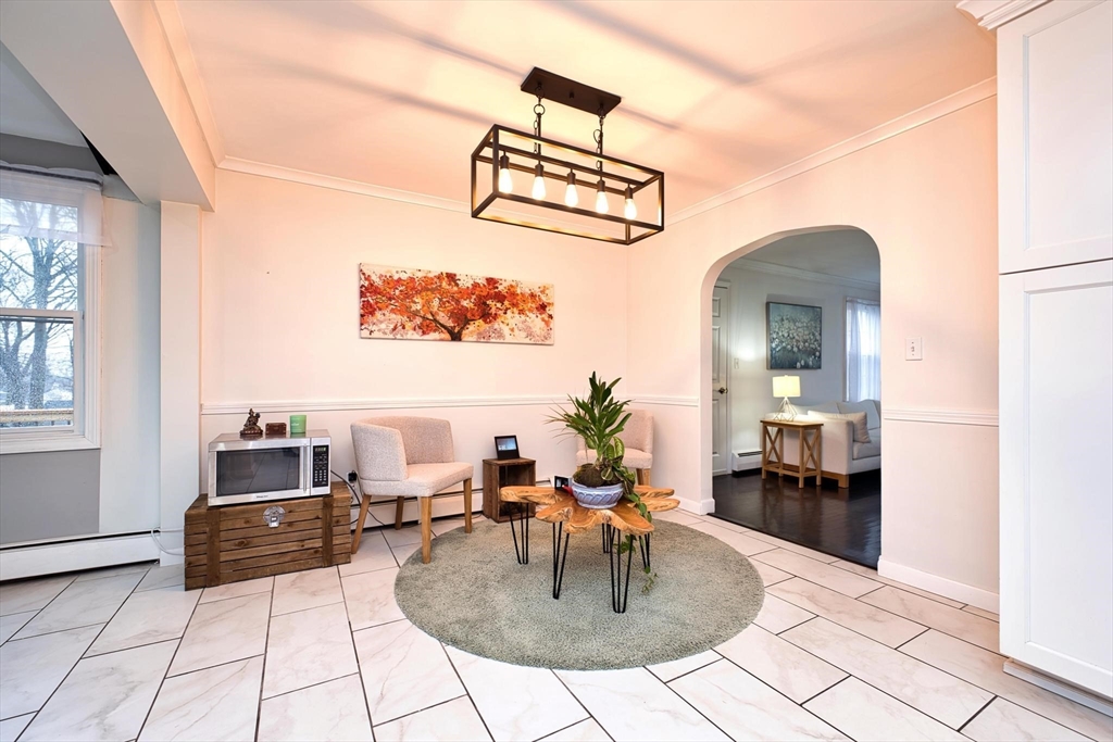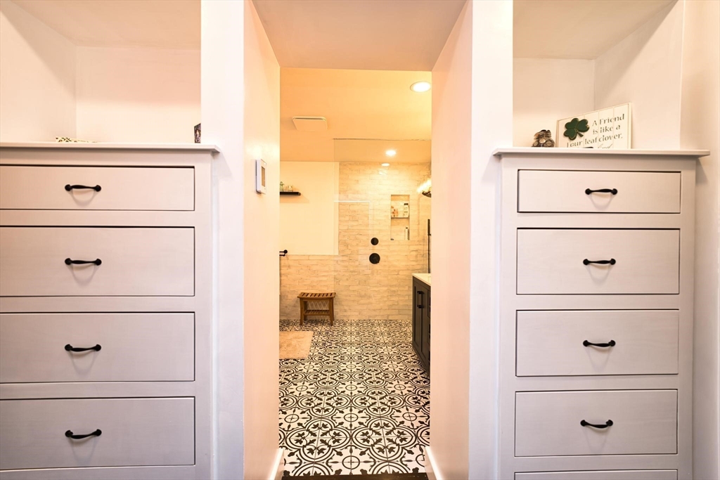Fully updated 3-bedroom, 3.5-bath Cape style home. Featuring a first-floor primary suite with heated floors, soaking tub, and stand-up shower. Bright, spacious kitchen with island, stainless appliances, and abundant natural light opens to a cozy living area with a working wood-burning fireplace. Large mudroom with access to one car detached garage. First-floor laundry for convenience. Upstairs offers two additional spacious bedrooms and a full bath. Finished basement offers three additional rooms, a full bathroom, a storage area, and walk-out access to the fenced backyard. Step outside and Enjoy the low maintenance Trex deck, large shed, and well-maintained fenced yard. Updates include newer boiler and hot water tank, plus French drains. Close to shopping and highway access. Solar panels are leased and to be assumed by new owner.