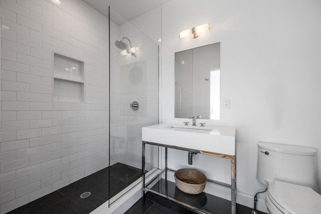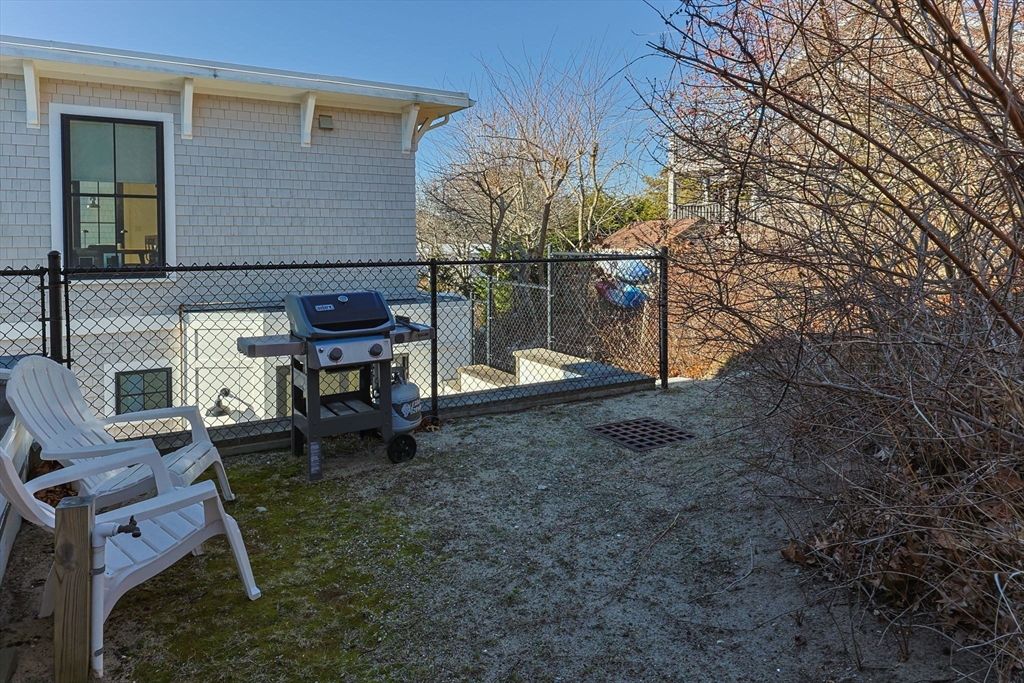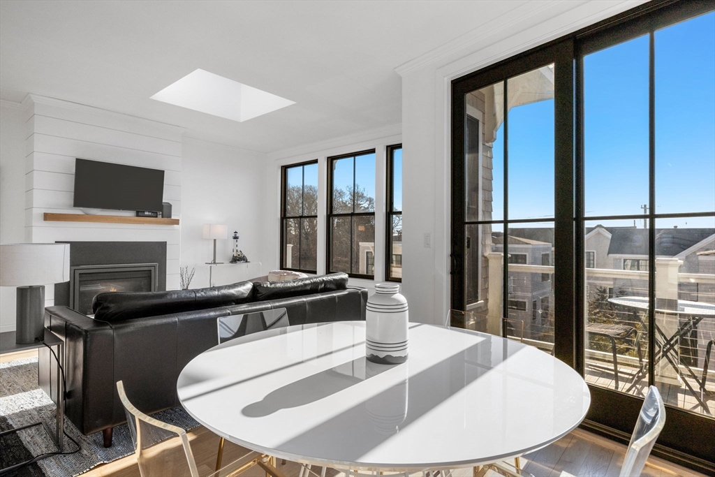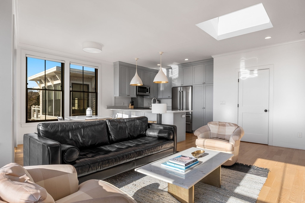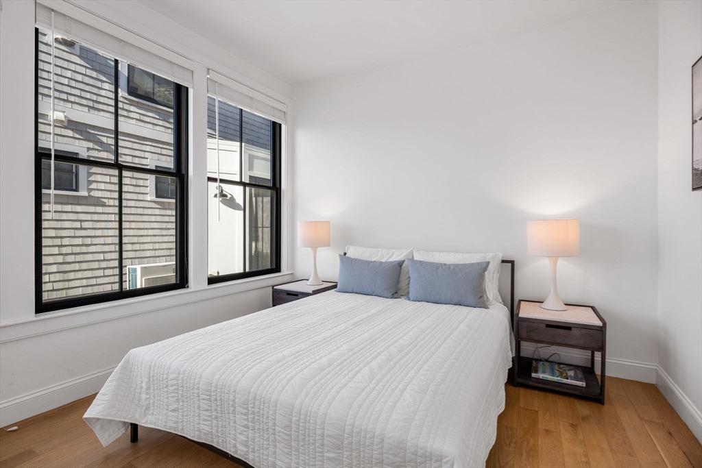 Welcome to 350 Bradford Street, a stunning townhome in Provincetown's East End offering refined, low-maintenance living. This 2BR, 2.5BA home includes 1,274 sq ft of living space, plus an additional 414 sq ft for a private two-car garage and ample storage. The top-level living area overlooks the property toward the bay and features a Thermador appliance package, quartz countertops, custom cabinetry, oak floors, 8'9'' ceilings, oversized windows, and a convenient half bath. A southwesterly deck captures warm afternoon light, while a northerly yard area adds rare outdoor flexibility. The middle level includes a spacious primary suite with walk-in closet and en suite bath, a well-appointed guest bedroom, full hall bath, and stackable laundry. Central A/C and a fireplace add year-round comfort. Parking is exceptional with a private two-car garage plus an additional outdoor space. Beach access nearby. Rentals permitted; pets for owners. Professionally managed by Cape Associates.