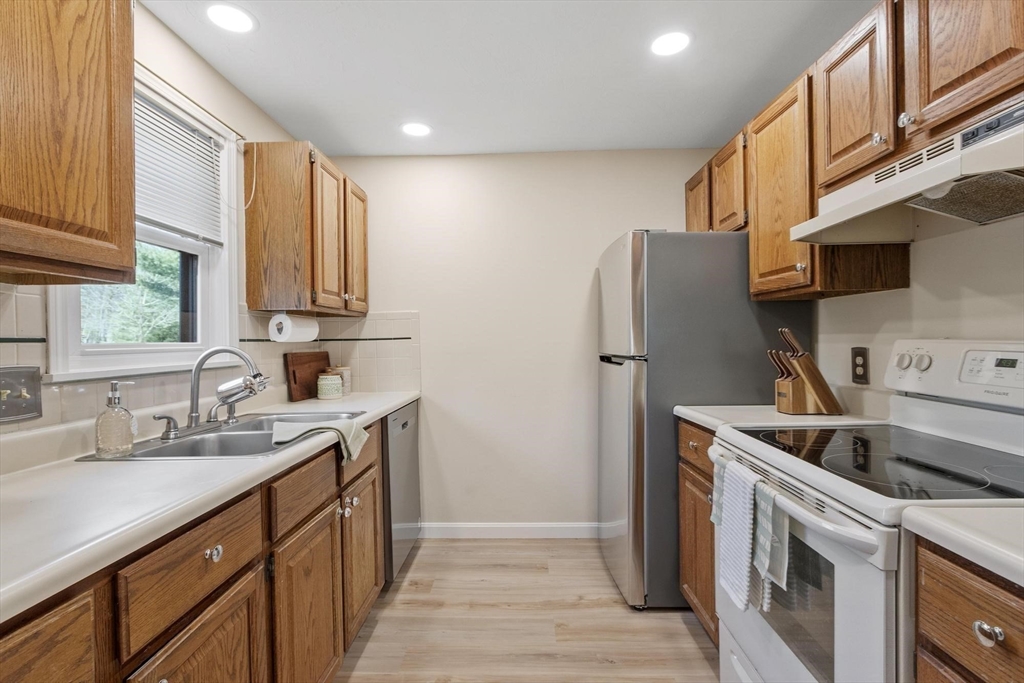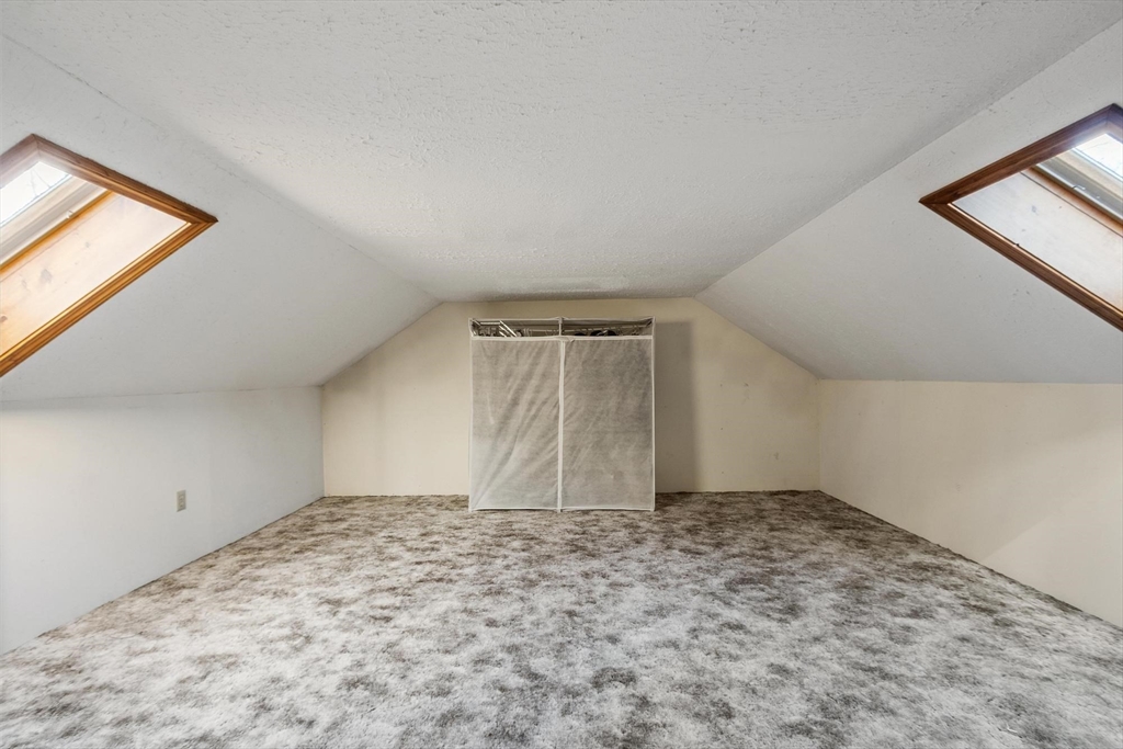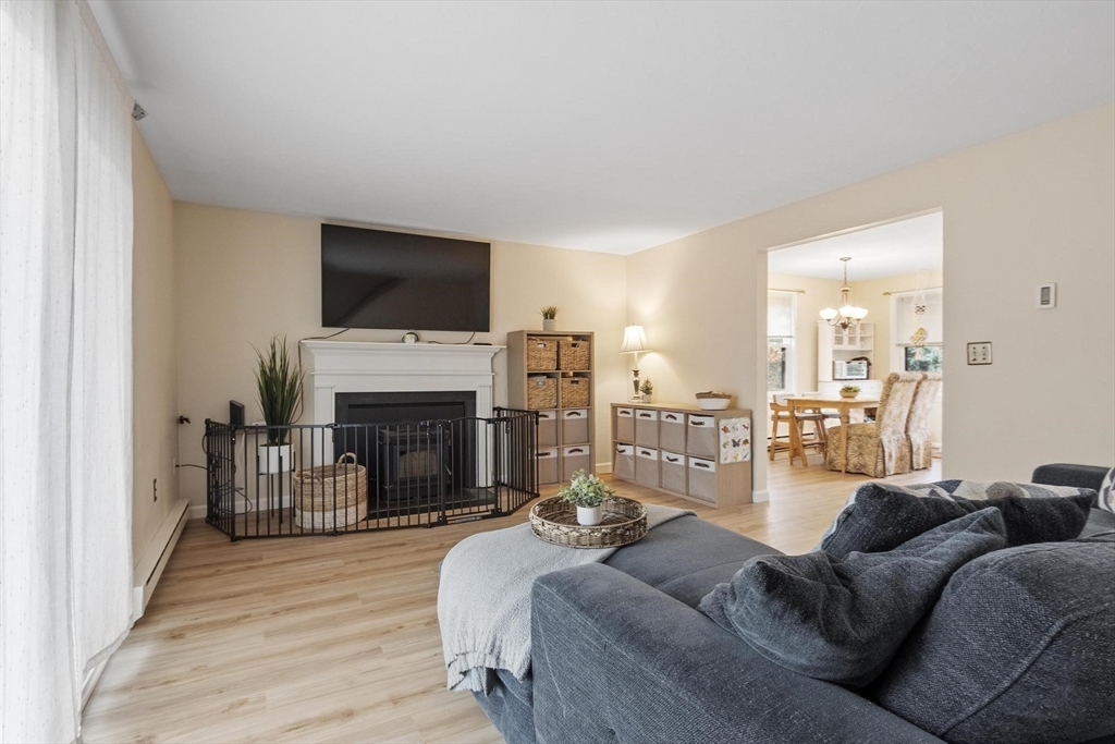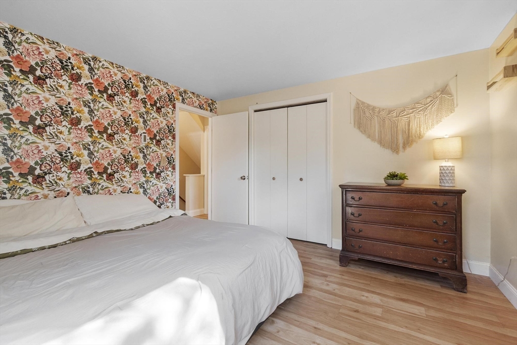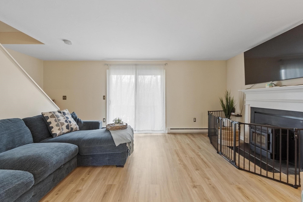 Welcome to Coggshall Crossing! This bright and well-maintained 2-bedroom, 2-bath end-unit condominium offers 1,306 square feet of comfortable living space in a highly desirable commuter-friendly location. The main living area features updated flooring, recessed lighting, and a cozy fireplace with pellet stove, creating a warm and inviting space perfect for relaxing or entertaining. A sliding glass door provides great natural light and easy access to outdoor space, enhancing the home's open and airy feel. Upstairs, you'll find two comfortable bedrooms and a full bath, along with a walk-up attic/bonus room featuring skylights—ideal for a home office, guest space, hobby room, or additional storage. Ideally situated near Coggshall Park, scenic walking trails, and major commuter routes, this property offers the perfect balance of comfort and convenience. Whether you're commuting to work or enjoying nearby recreation, this location is hard to beat.