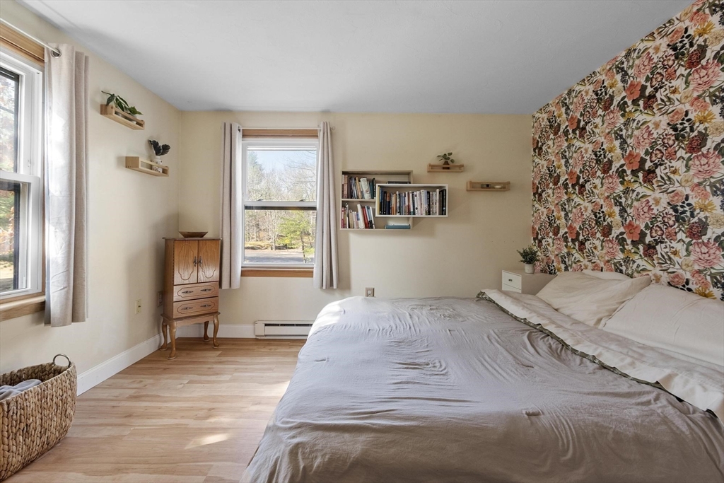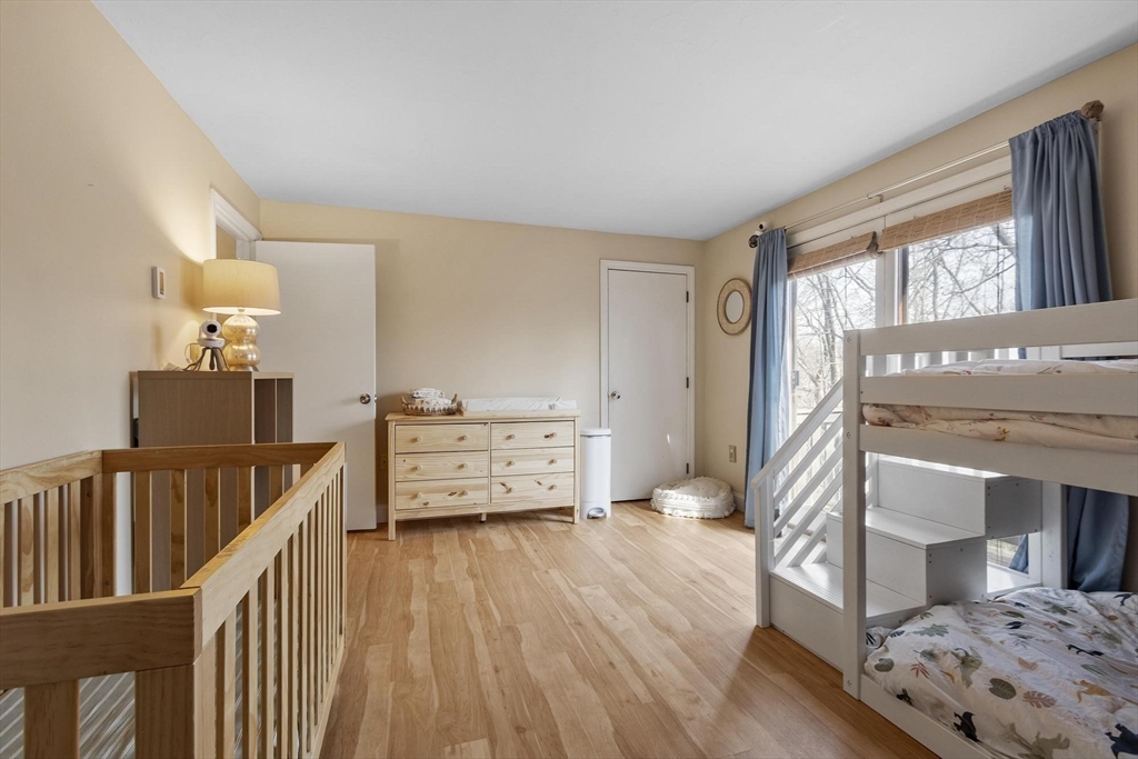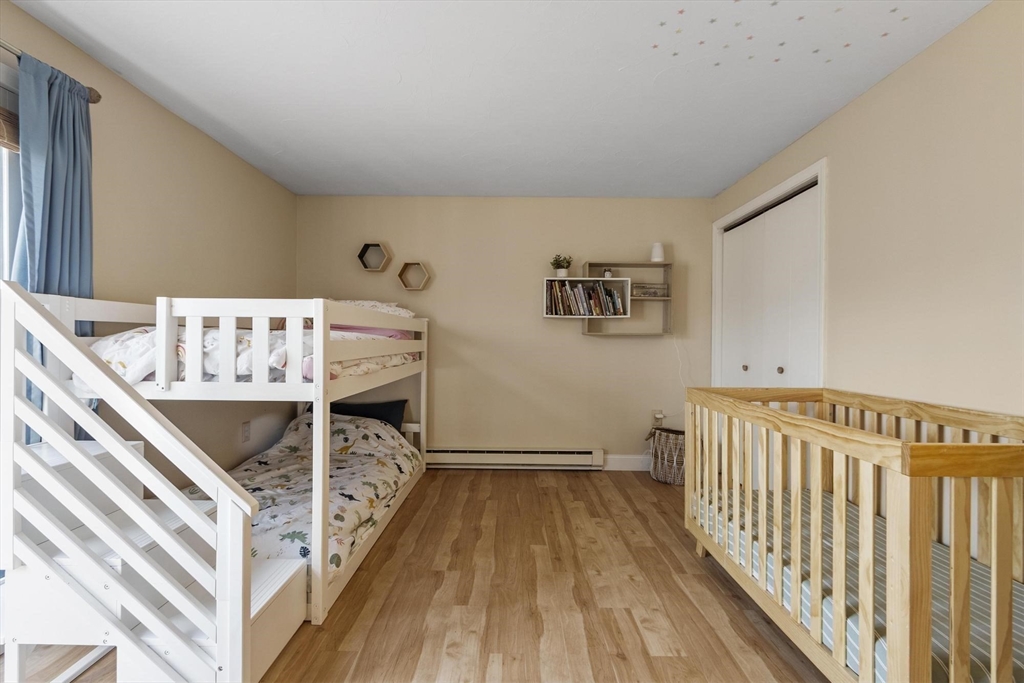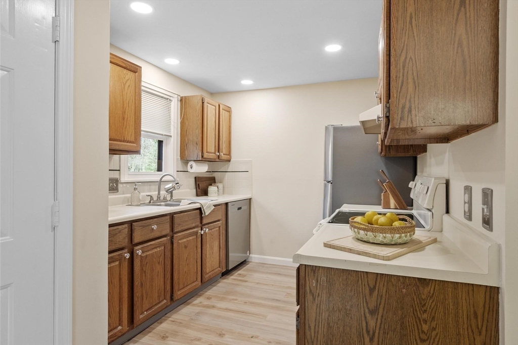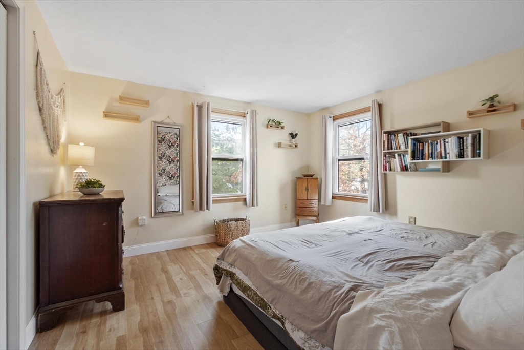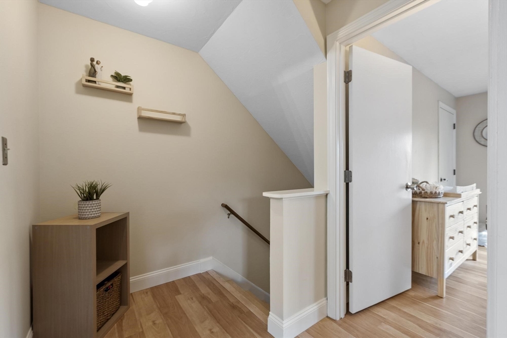 Welcome to Coggshall Crossing! This bright and well-maintained 2-bedroom, 2-bath end-unit condominium offers 1,306 square feet of comfortable living space in a highly desirable commuter-friendly location. The main living area features updated flooring, recessed lighting, and a cozy fireplace with pellet stove, creating a warm and inviting space perfect for relaxing or entertaining. A sliding glass door provides great natural light and easy access to outdoor space, enhancing the home's open and airy feel. Upstairs, you'll find two comfortable bedrooms and a full bath, along with a walk-up attic/bonus room featuring skylights—ideal for a home office, guest space, hobby room, or additional storage. Ideally situated near Coggshall Park, scenic walking trails, and major commuter routes, this property offers the perfect balance of comfort and convenience. Whether you're commuting to work or enjoying nearby recreation, this location is hard to beat.