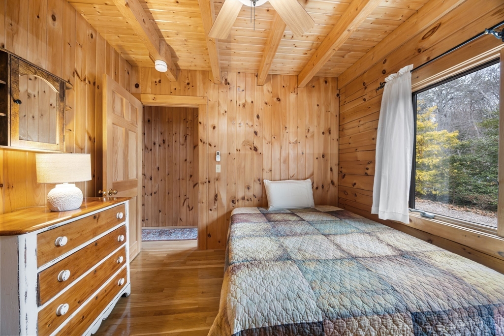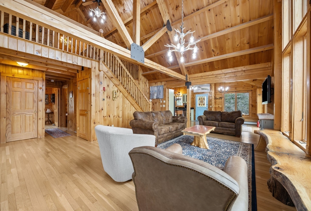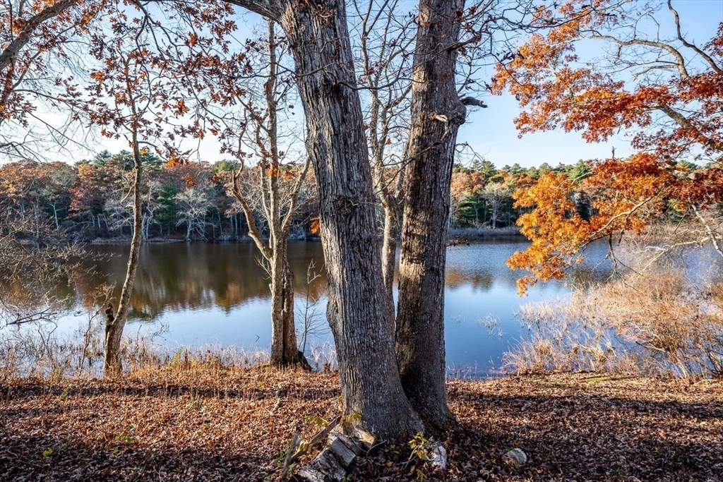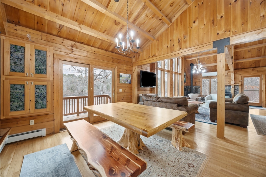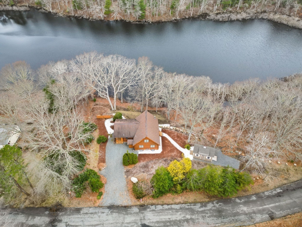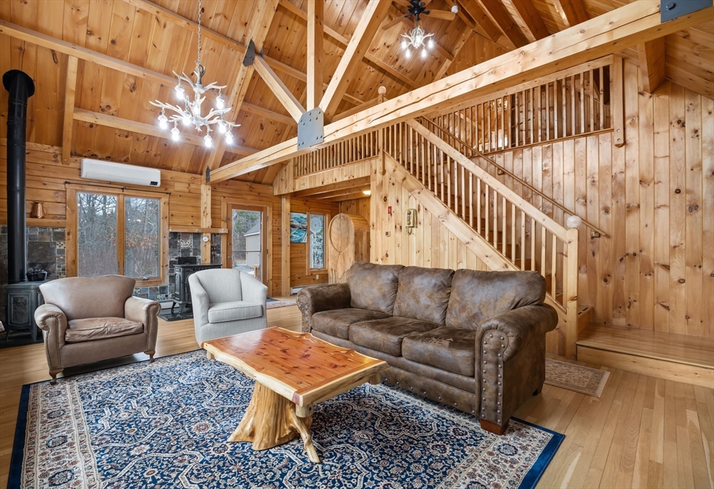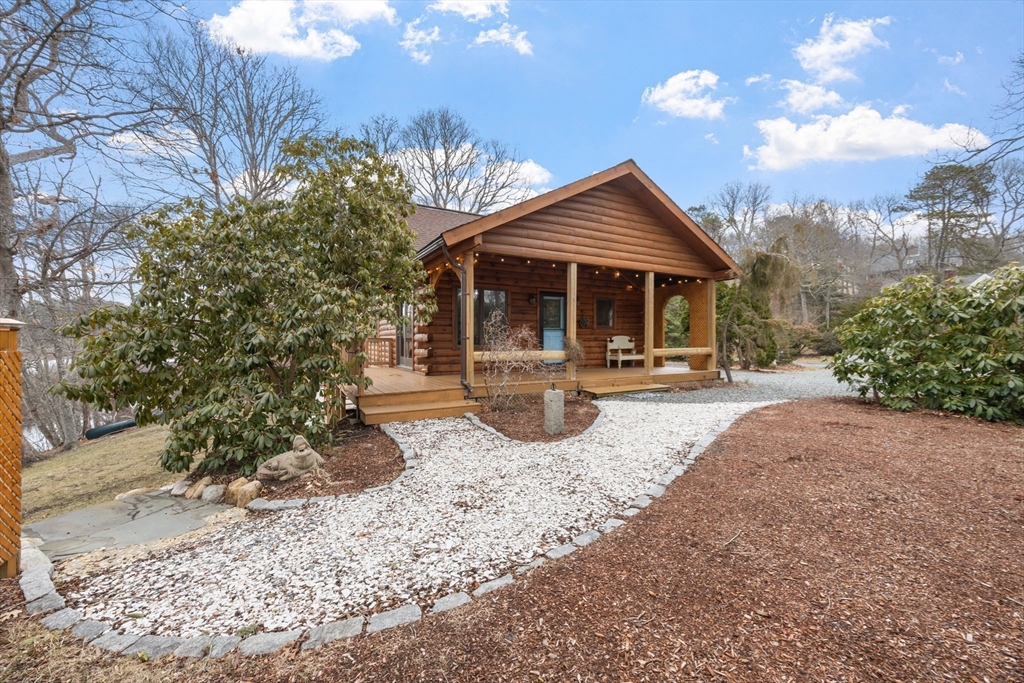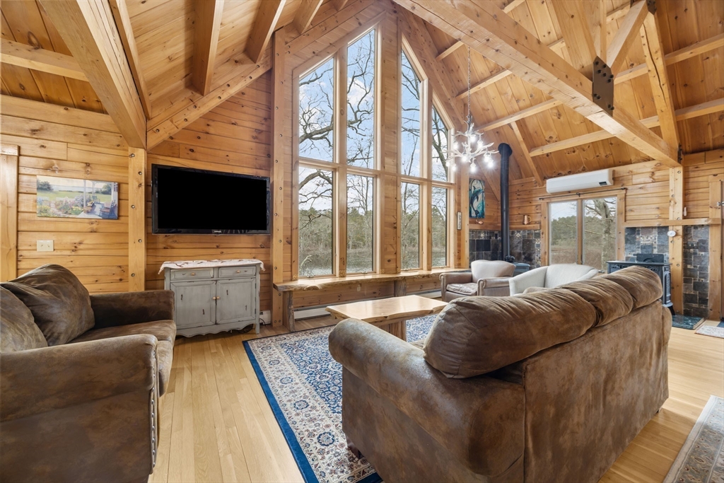 Situated on over two acres with 427 feet of private waterfront on Clay Pond, this meticulously maintained log cabin in Monument Beach presents a tranquil, picturesque Cape Cod sanctuary. A touch of Vermont with outstanding wildlife in the area great for viewing and photography. The welcoming open-concept interior boasts rustic elegance, serene pond vistas, and a thoughtfully renovated kitchen featuring a Bertazzoni range and Labradorite countertops. The comfortable living space is equipped with both gas and pellet stoves. The upper level includes a loft bedroom, while the finished lower level provides versatile accommodations with a full bathroom. The property includes a large shed and offers the convenience of kayaking from the yard, in addition to being a brief drive from Monument Beach, marina, and dining establishments. Five minute drive to Bourne bridge for easy on and off Cape Cod.