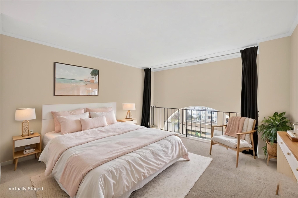 Presenting this rarely offered loft-style condo in "Old Medford High School". This complex was added to the National Register of Historic Places in 1983 and subsequently converted to 111 residential units. There are 2 levels of bright open living, with a central view over looking the American flag. The main level features an airy kitchen and living area with a dramatic Palladian window. A modern half bath is located in the foyer along with a spiral staircase leading to the penthouse-style bedroom suite. BR suite has dual closets, skylit primary bath, and a vast walk in closet. Custom California Closets throughout maximize organization. Additional highlights include central heat and air conditioning, deeded garage parking, and private storage locker. Enjoy resort-style amenities including a heated indoor pool, sauna, and tennis court. Ideally located one block from Medford Square with easy access to highways, public transportation, and an express bus to Boston.