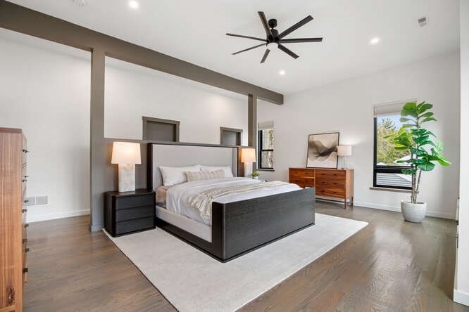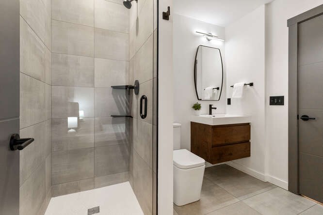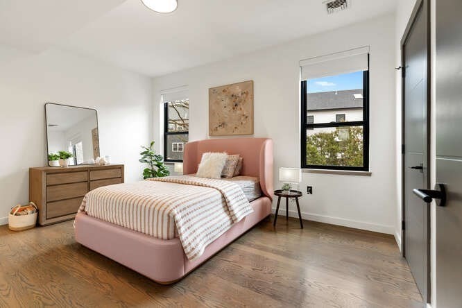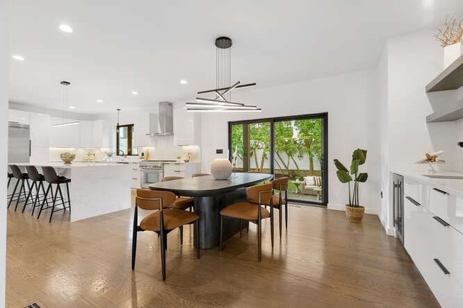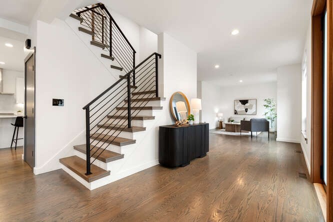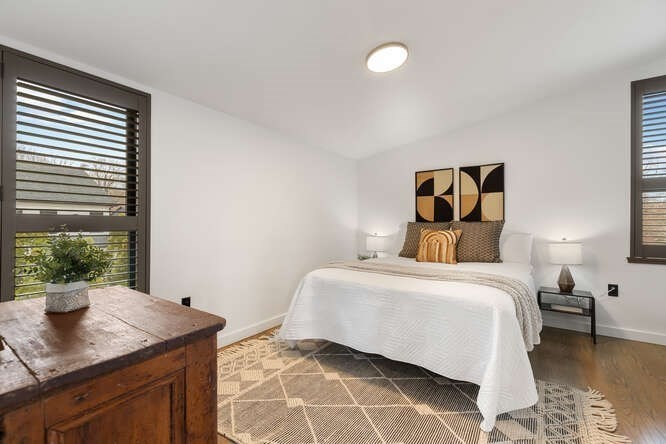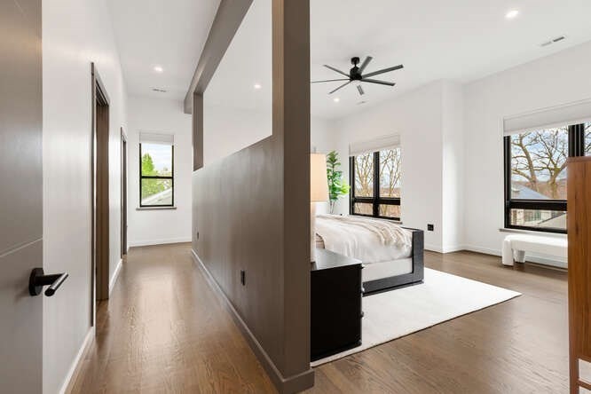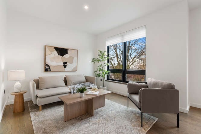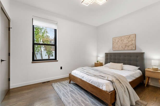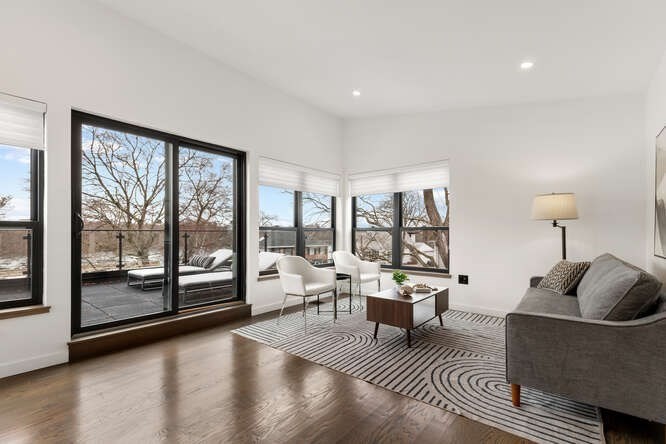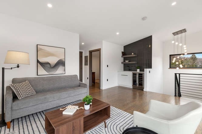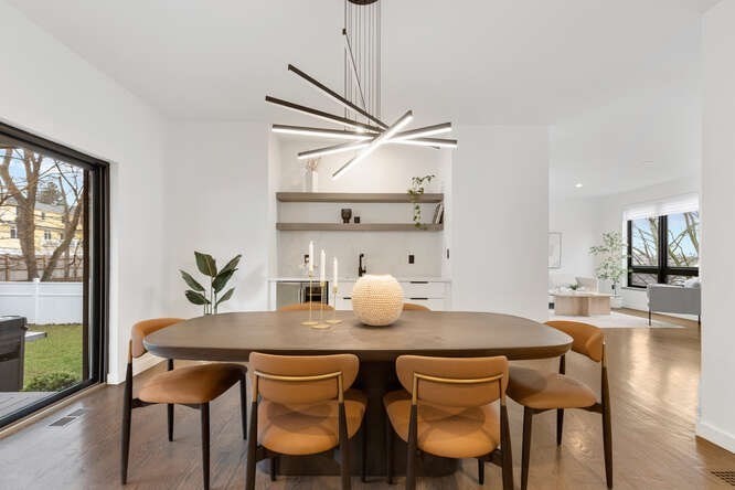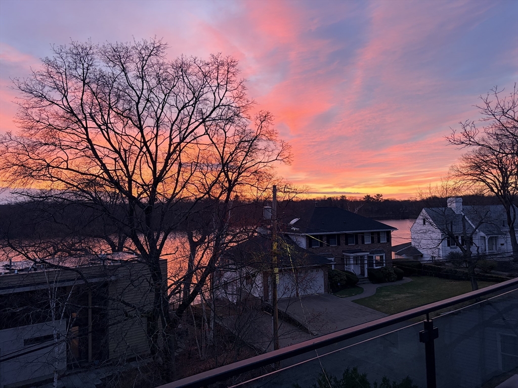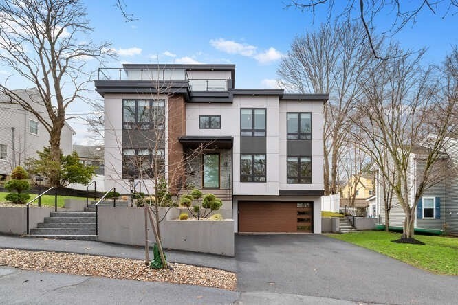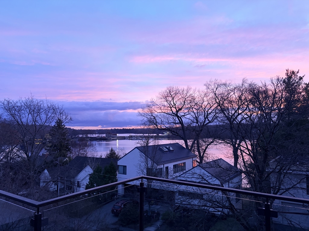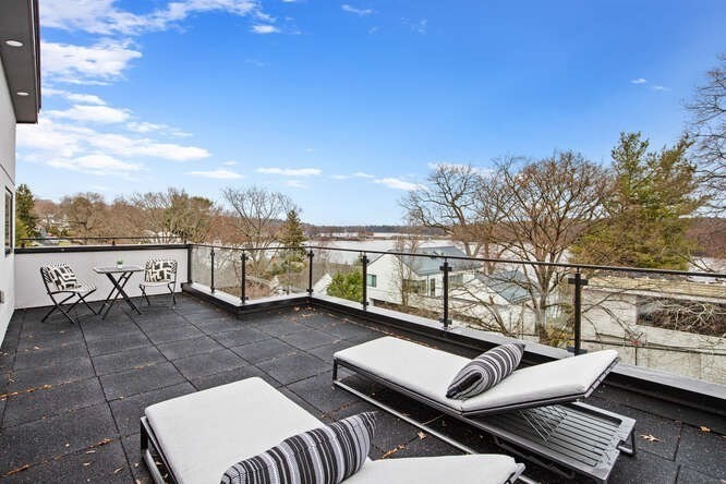 Rare water views on one of Arlington’s most sought after streets! Built in 2022 by respected developer, this contemporary home offers over 4,500sf of living space including a 300sf roof deck with views of Lower Mystic Lake. Open layout blends spacious entertaining areas with private retreats. Every bedroom is en suite, including a first floor guest suite. Sun filled chef’s kitchen w/ waterfall quartz island and Thermador appliances flows into a fireplace family room, dining with built ins and out to a back porch, paved patio and flat fenced yard. Primary suite has lake views, luxury bath with heated floors, office and walk in closet. Third floor adds rec room, wet bar, fifth bedroom/bath and roof deck access. Finished lower level provides play/exercise room, custom mudroom and storage. Highlights: 2 car EV ready garage, high ceilings, oversized windows with custom treatments. Less than a mile from Arlington Center and close to the Alewife bus (Rt 3). Modern quality and a rare setting.