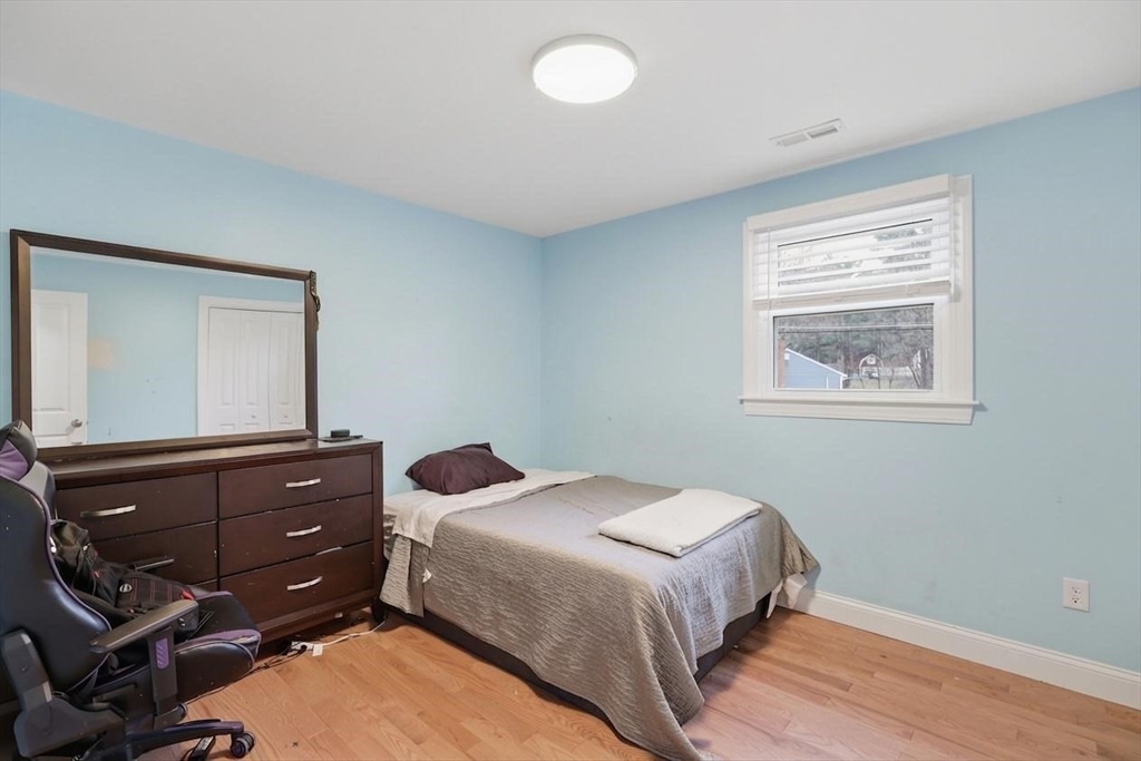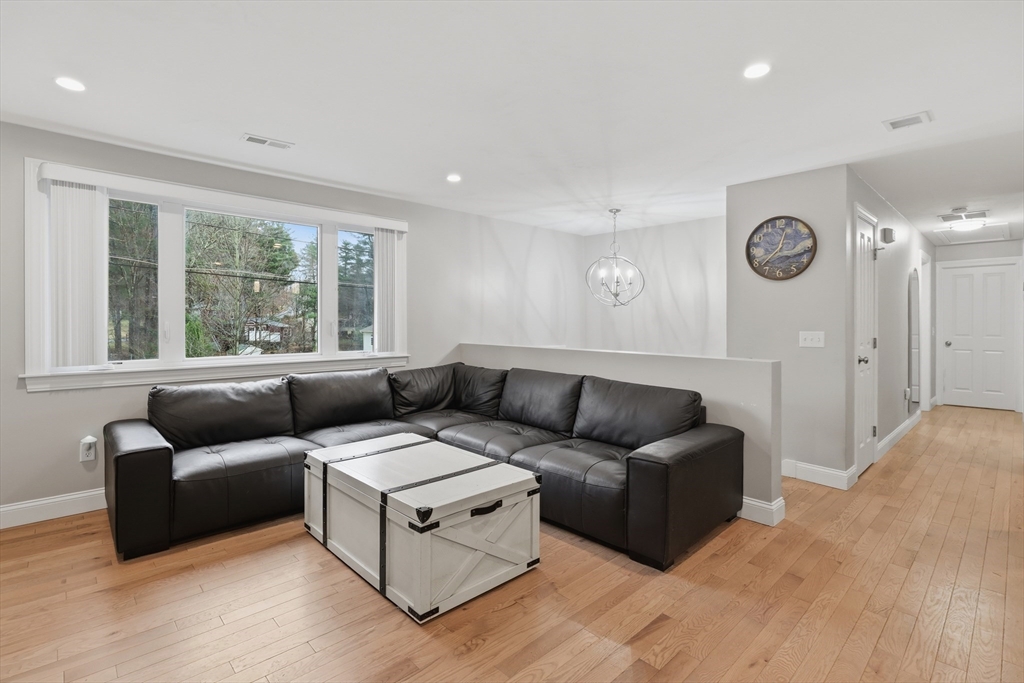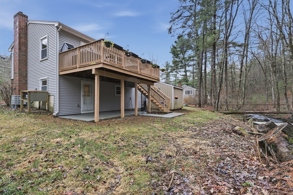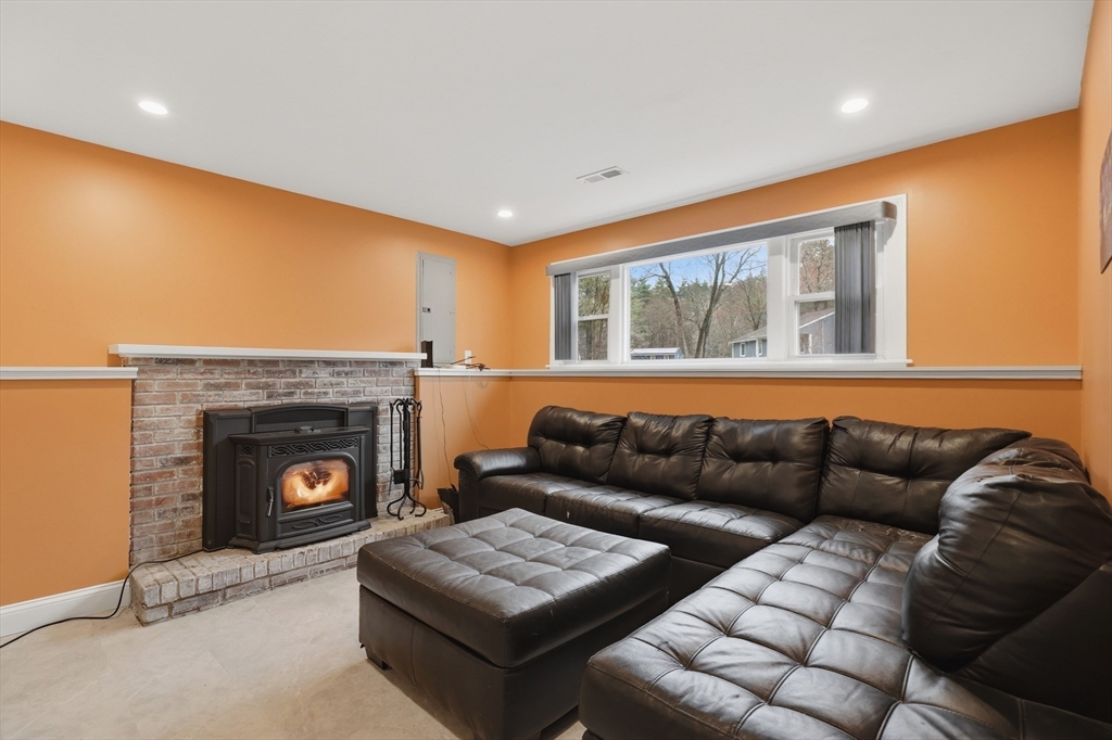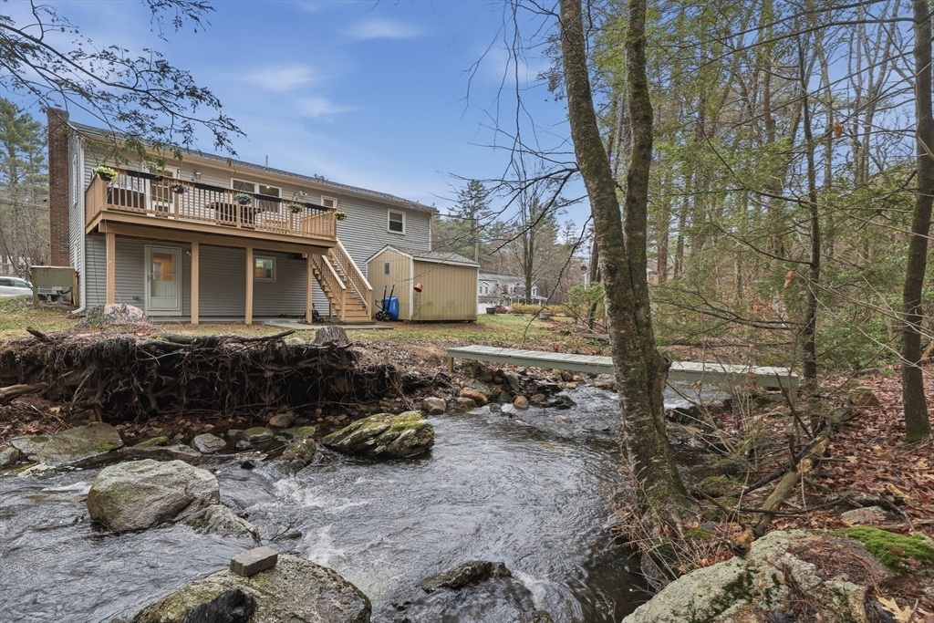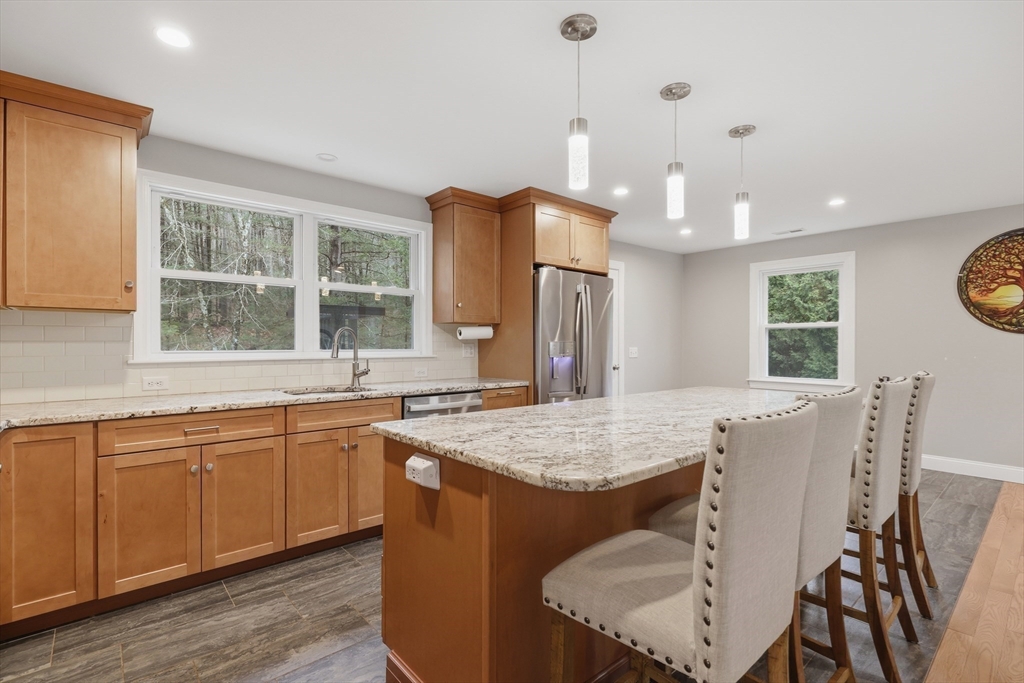 Tucked away on a dead-end street in a highly sought-after Sturbridge neighborhood, this inviting raised ranch offers the perfect blend of comfort & style. The main level features a sleek, open kitchen w/ stainless steel appliances, granite countertops, abundant cabinet space, a center island with pendant lighting and breakfast bar, classic subway tile backsplash, and access to the back deck—ideal for entertaining. A bright living room with hardwood floors and a picture window fills the space with natural light, while three good-sized bedrooms offer ample closet space. The finished lower level expands your living area with a cozy family room complete with a pellet stove and a private home office or fourth bedroom. Outside, enjoy a picturesque setting with a bubbling brook and charming bridge, along with a back deck, storage shed, attached garage, and plenty of off-street parking. New roof (2023), new furnace, water heater, and central A/C (2023), new kitchen (2023), & many more updates.