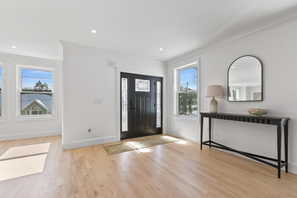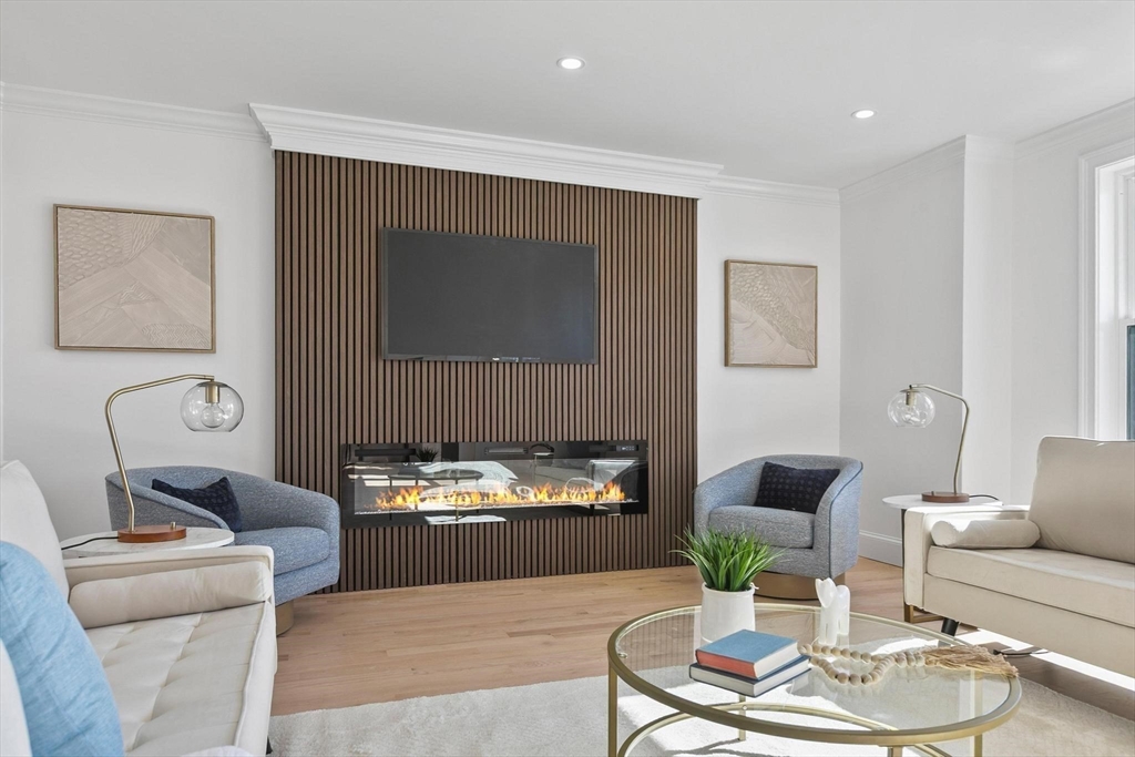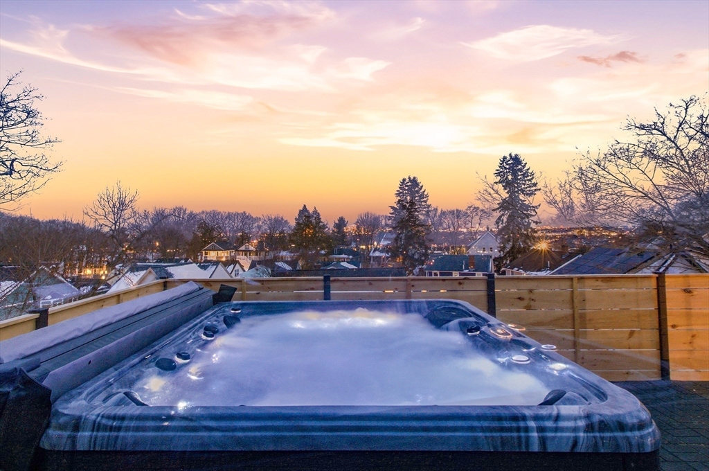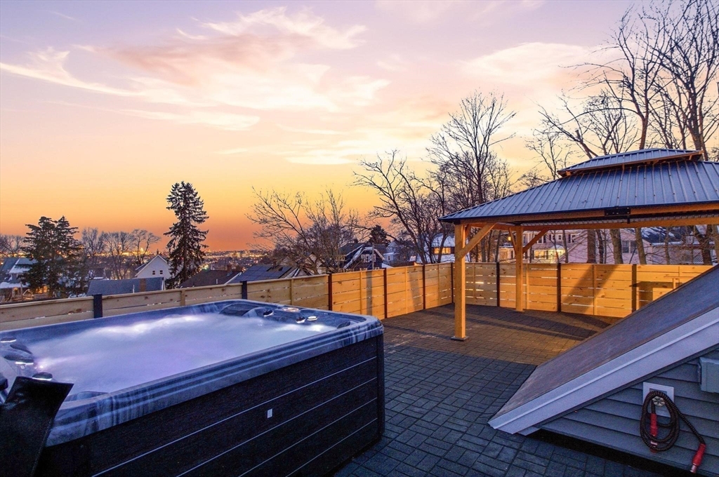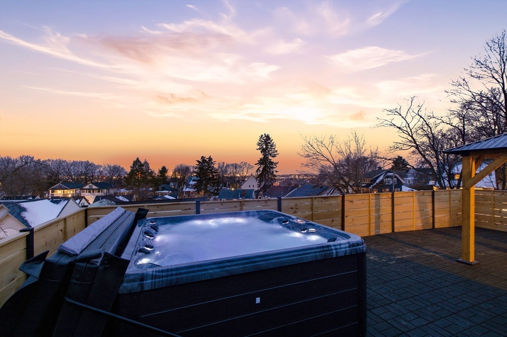 This architectural masterpiece delivers a rare trifecta of modern utility, high-end systems, and a premier rooftop experience. Spanning ~3,000 SF, the sophisticated 4BR/3.5BA layout features dual primary suites with spa-inspired baths and radiant heat flooring. A sprawling lower-level mudroom serves as a "command center," keeping the main living spaces pristine. The epicurean kitchen is a showpiece of performance, boasting a walk-in pantry, wet bar, quartz counters, and LG smart appliances. Elevating the lifestyle is the signature ~850 SF roof deck, complete with a custom pergola and 6-person jetted spa tub, all set against the breathtaking Boston skyline. Future-ready tech includes wall-mounted iPad hubs, all-electric mini-split HVAC, solar pre-wiring, and EV capacity. The exterior features artisan stonework and a paver driveway, framed by dramatic 25' natural ledge walls for unparalleled privacy. Prime location with easy access to 93, 95, MBTA buses, orange and green line.
