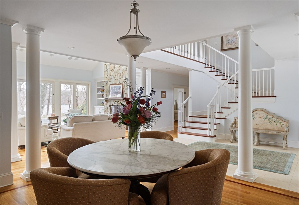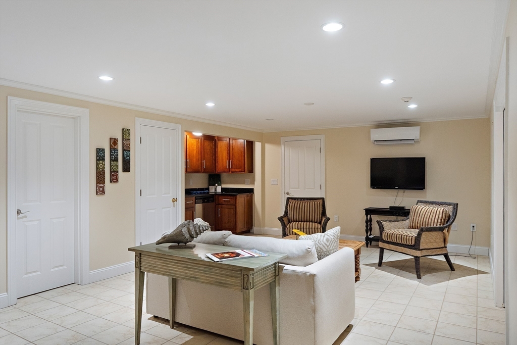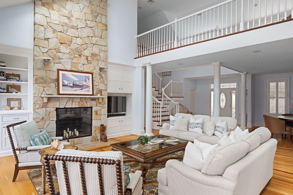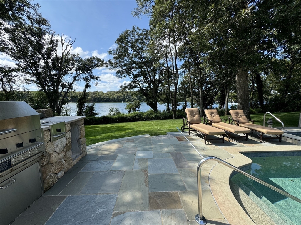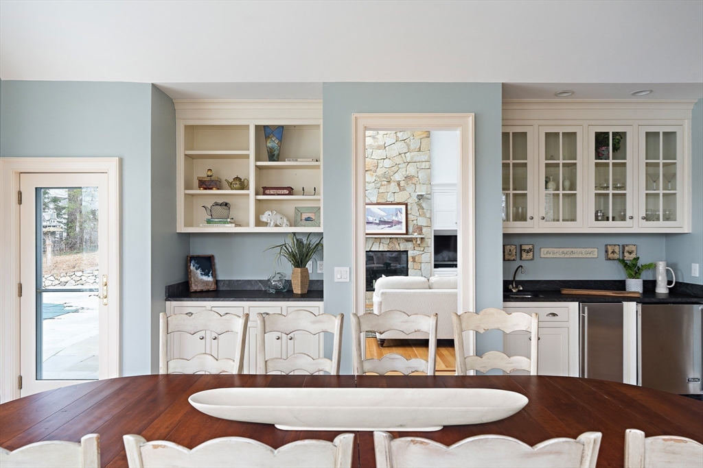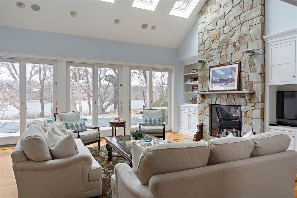 Set along 125 feet of private Lagoon frontage, this beautifully designed home offers over 5,400 sq. ft. of light-filled living space across three levels. High ceilings, skylights, and walls of glass capture sweeping water views, while a decorative stone fireplace anchors the main living area. The chef’s kitchen features stainless appliances, stone counters, custom cabinetry, and a large island, complemented by a wet bar and casual dining area. Three ensuite bedrooms include a primary suite with water views, a sitting area, walk-in closet, pool access, and a spa-like bath. The walk-out lower level offers a game room, media area, kitchenette, wine storage, and bonus room. Outdoors, enjoy a heated pool, spa, bluestone terrace, and direct access to calm waters for swimming, boating, and some of the best steamers, littleneck, and cherry stones on the Island. Offered furnished with strong rental history.