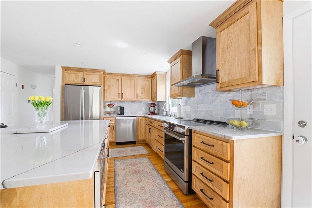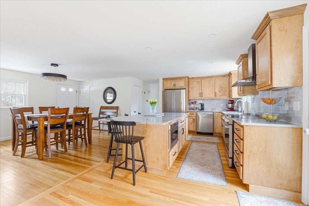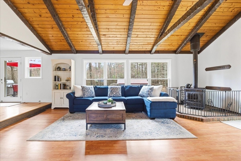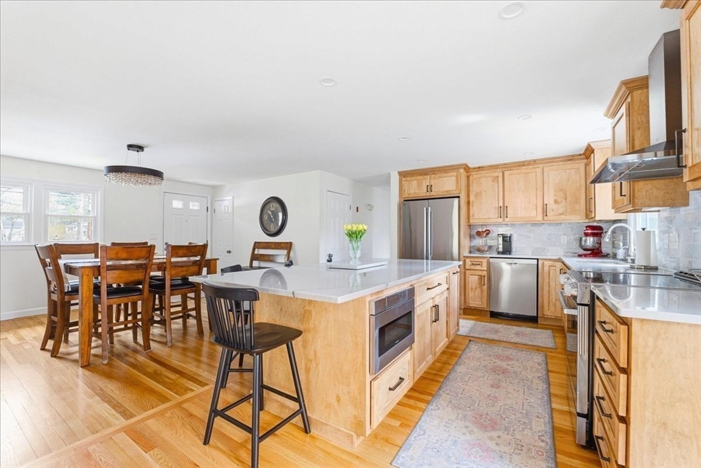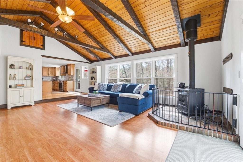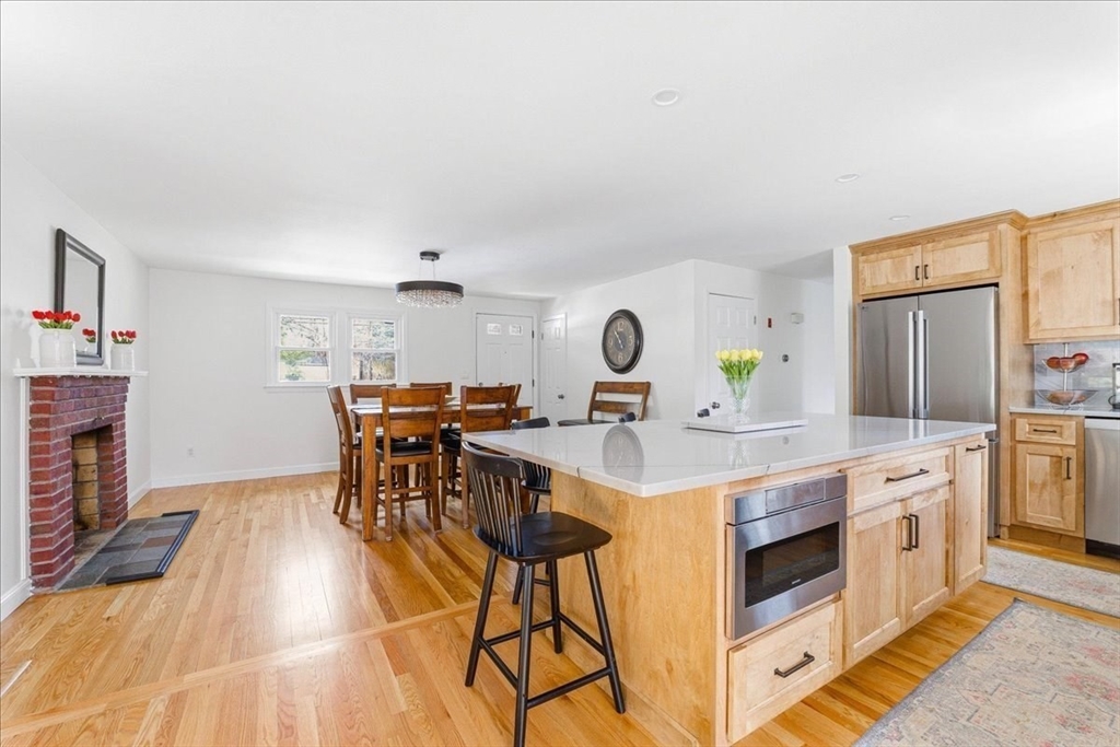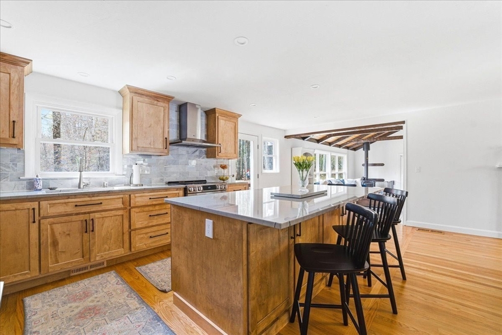 Turn-key home with a stunning custom gourmet kitchen featuring premium quartzite countertops, stainless steel appliances, drawer microwave, and center island with seating, open to a fireside dining room. The great room showcases a beamed vaulted ceiling, oversized windows, and slider leading to a patio overlooking 200 acres of serene conservation land. Updated baths with tiled flooring and new vanity in the first floor bathroom. Three bedrooms offer refinished hardwood floors and fresh interior paint. Walk-out lower level includes a spacious family room (currently used as a gym), office, and kitchenette, ideal for flexible living. Major updates include roof, windows, and doors (2016), furnace (2013), tankless water heater (2023), and new circular driveway (2025). Please see extensive list of home improvements on MLS paperclip. ~4 miles to Commuter Rail, award winning school system, and in immaculate pristine condition!