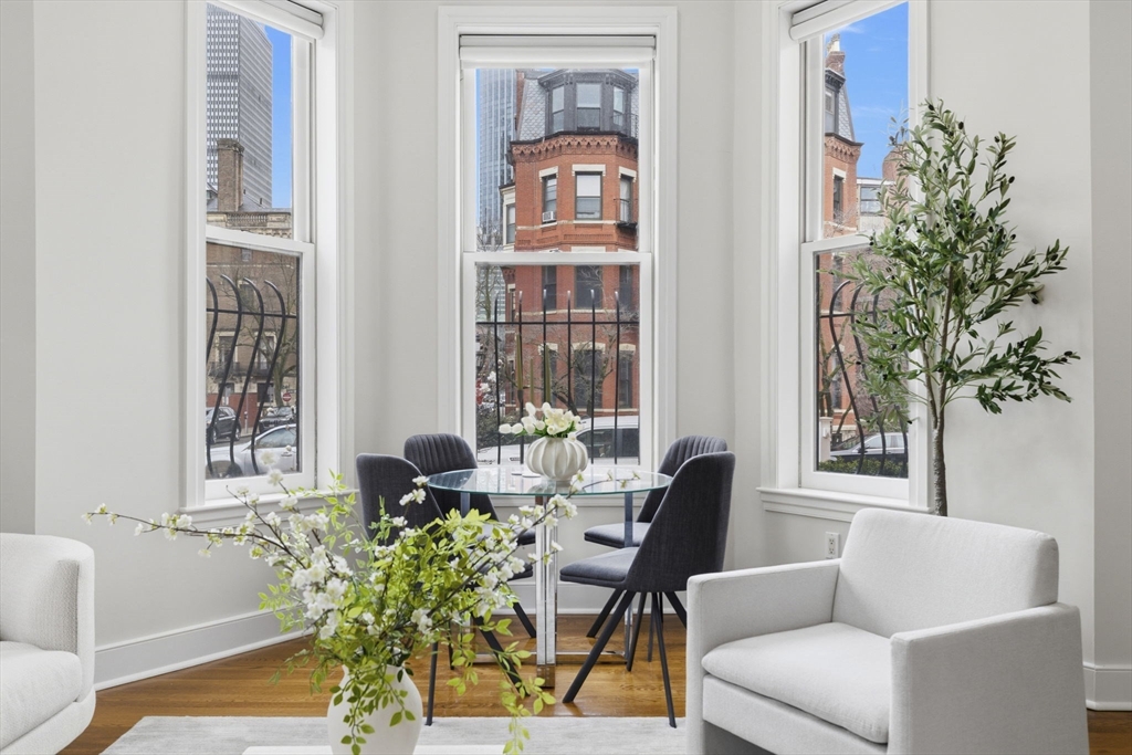 Beautiful 1 bed + office parlor duplex on the sunny side of Marlborough St! Set within a wide building, this home boasts a smart and efficient floor plan that lives larger than its stated sq footage and features 11.5-ft ceilings on the main level and a rare corner exposure that floods the space with natural light. The main level comprises a living and dining area with large windows, an open kitchen with new appliances and breakfast bar, and a coat closet. Downstairs, a king-sized primary bedroom offers large double closets, while a bonus office/den adds versatility. A full bath and combo in-unit washer/dryer completes the home. Nearly every window on the parlor level frames boulevard-style views of Marlborough St and the Back Bay skyline. Other features include central air, motorized blinds, and hardwood floors. Located in a professionally-managed, pet-friendly association, this home offers ideal Back Bay living just moments from Newbury St, Esplanade, and Prudential Center.