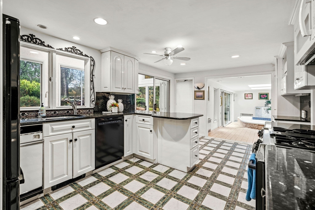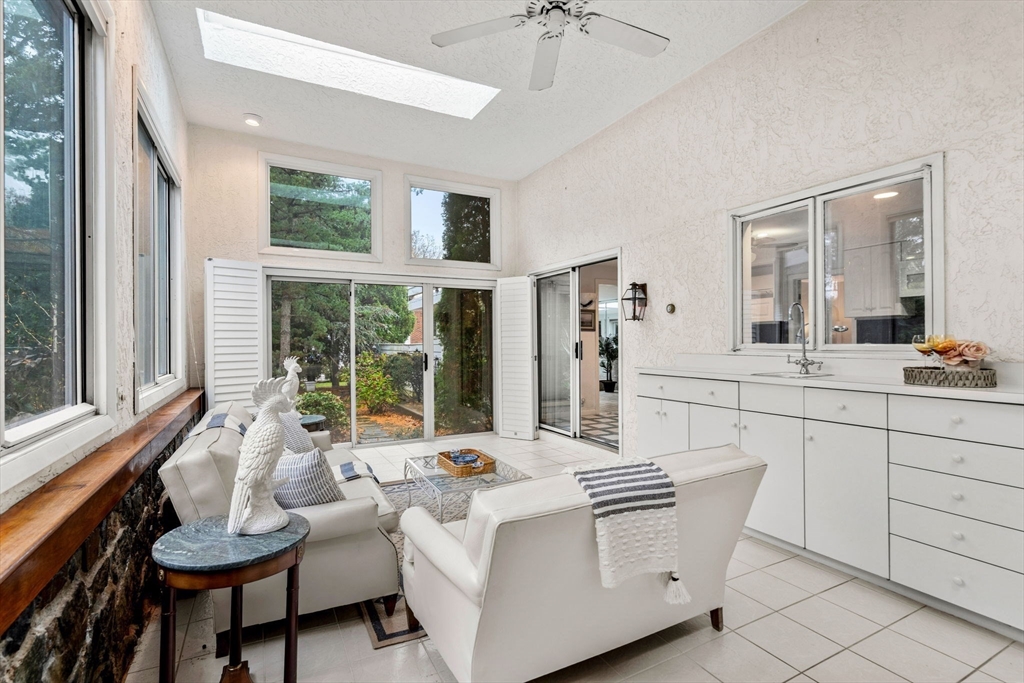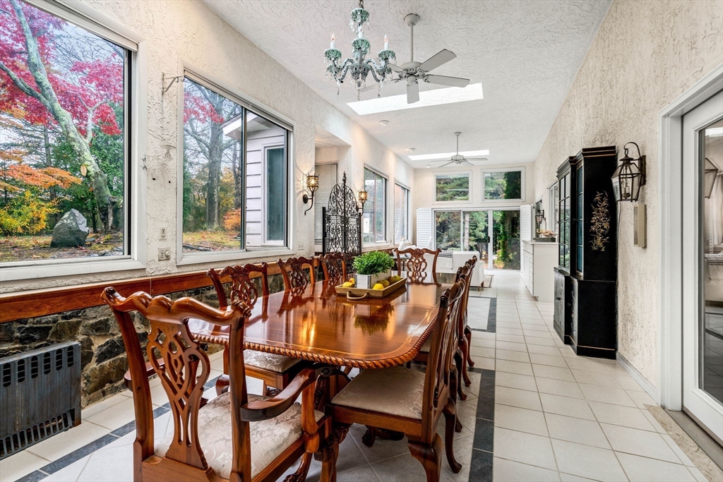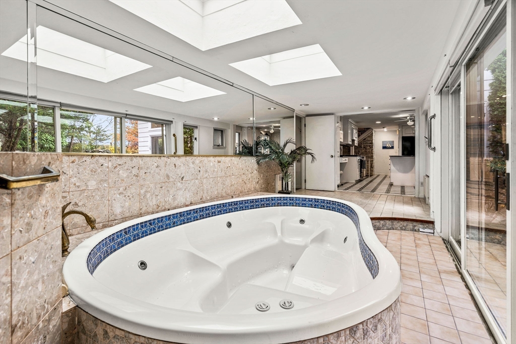Large mid-century modern home on an oversized lot at the end of a quiet dead-end street in desirable South Salem. Enter through double doors into a foyer featuring an open-riser staircase and striking exposed stone wall. The oversized living room with hardwood floors and fireplace flows into a bright sunroom with dining and seating areas, highlighted by expansive windows and skylights overlooking the landscaped yard. The central kitchen connects to the sunroom, a cozy den, half bath, and solarium with hot tub and skylights. Upstairs offers a spacious primary suite with cathedral ceilings and ensuite bath, plus two additional large bedrooms, full bath, and laundry. Finished lower level includes a family room with fireplace and workshop. Make this distinctive modern home in a sought-after setting your own.