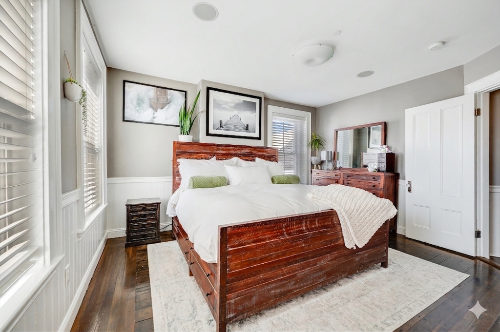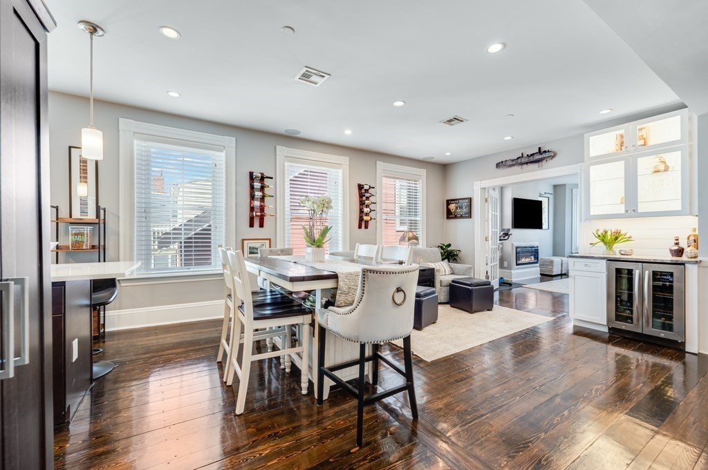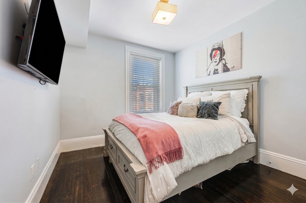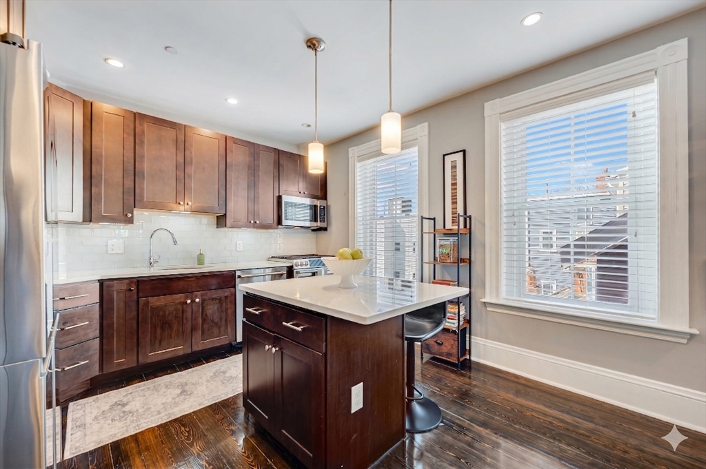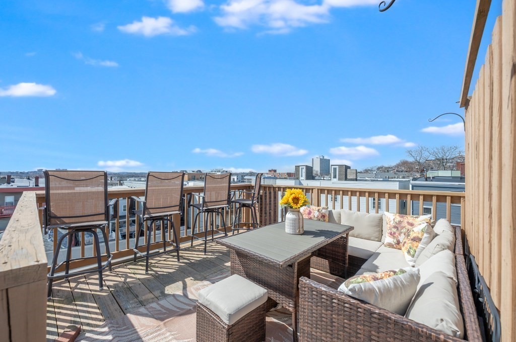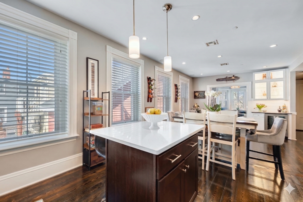 Exceptional East Side three-bed penthouse in a classic brick rowhouse with historic character, moments from the beach, shops, restaurants, and public transportation. This sun-filled residence features a private roof deck with southern water views and an open layout ideal for everyday living and entertaining. Configured as a two-bedroom plus den, the home blends original character with modern updates, including central air, a custom dry bar with wine fridge, electric fireplace, ebony hardwood floors, French glass doors, and in-ceiling audio throughout. The kitchen features 2025 GE Café stainless appliances, gas cooking, quartz countertops, a glass tile backsplash, custom cabinetry, and a center island. The primary suite accommodates a king-size bed and includes a walk-in closet and en-suite bath with double vanity. A large second bedroom and full guest bath complete the layout. Additional features include 2024 in-unit laundry, basement storage, & rental parking.