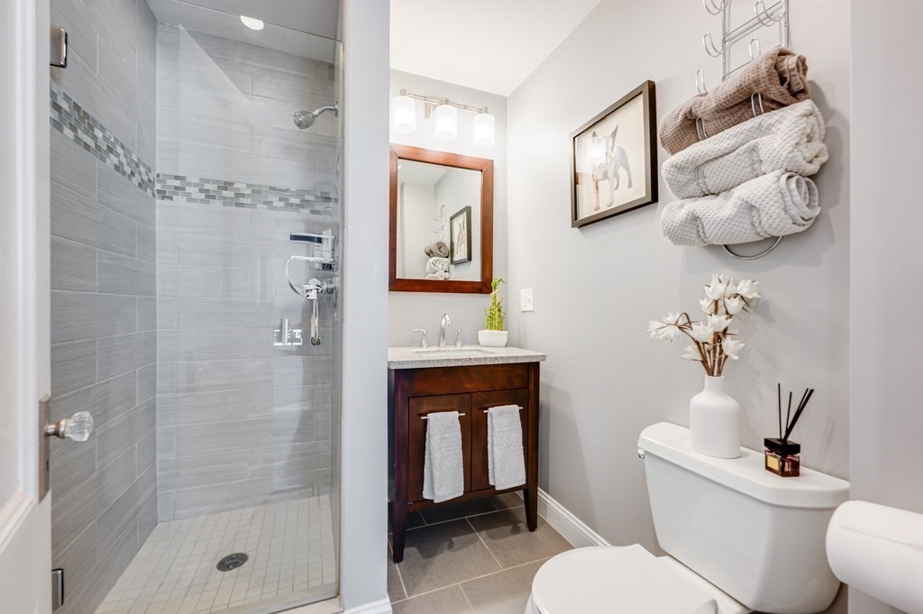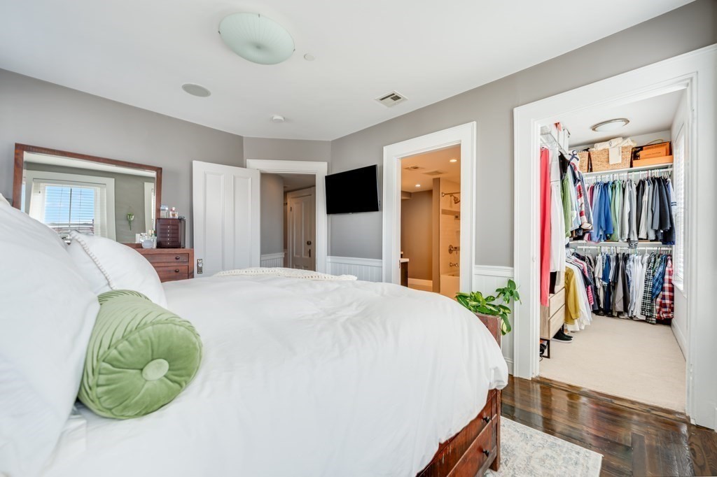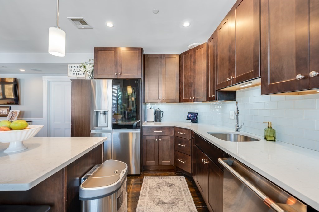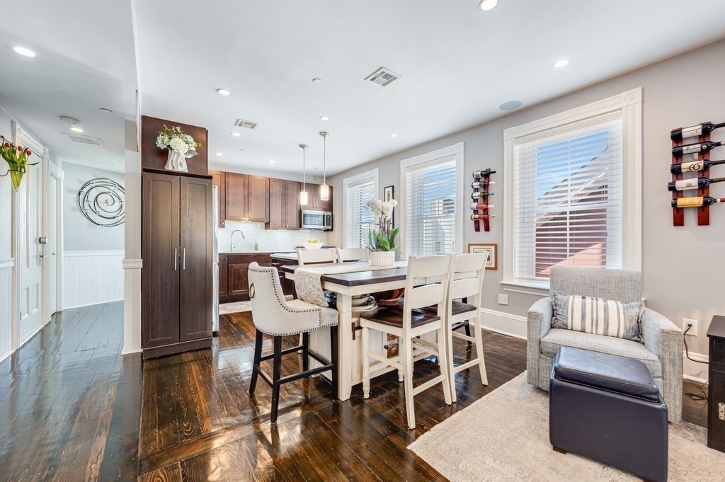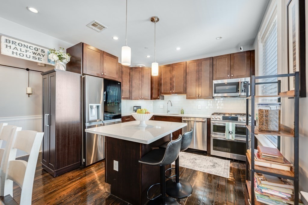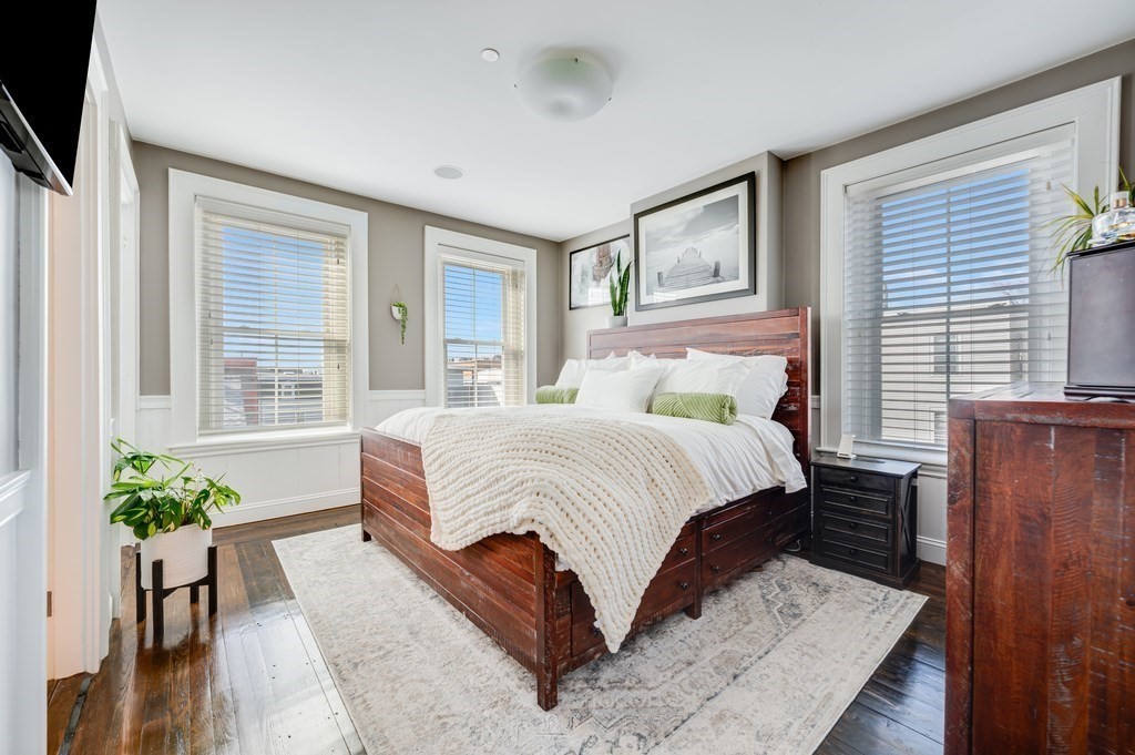 Exceptional East Side three-bed penthouse in a classic brick rowhouse with historic character, moments from the beach, shops, restaurants, and public transportation. This sun-filled residence features a private roof deck with southern water views and an open layout ideal for everyday living and entertaining. Configured as a two-bedroom plus den, the home blends original character with modern updates, including central air, a custom dry bar with wine fridge, electric fireplace, ebony hardwood floors, French glass doors, and in-ceiling audio throughout. The kitchen features 2025 GE Café stainless appliances, gas cooking, quartz countertops, a glass tile backsplash, custom cabinetry, and a center island. The primary suite accommodates a king-size bed and includes a walk-in closet and en-suite bath with double vanity. A large second bedroom and full guest bath complete the layout. Additional features include 2024 in-unit laundry, basement storage, & rental parking.