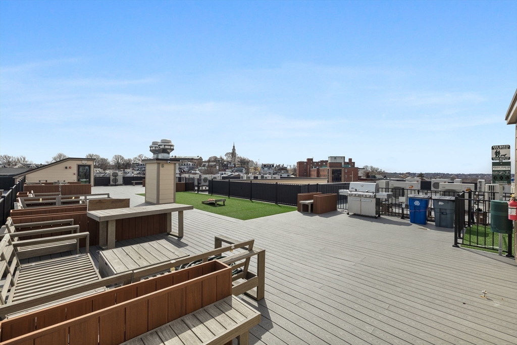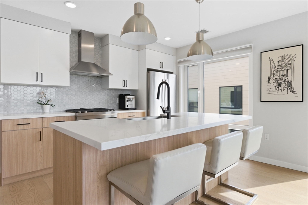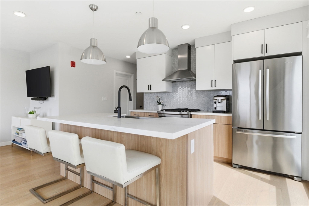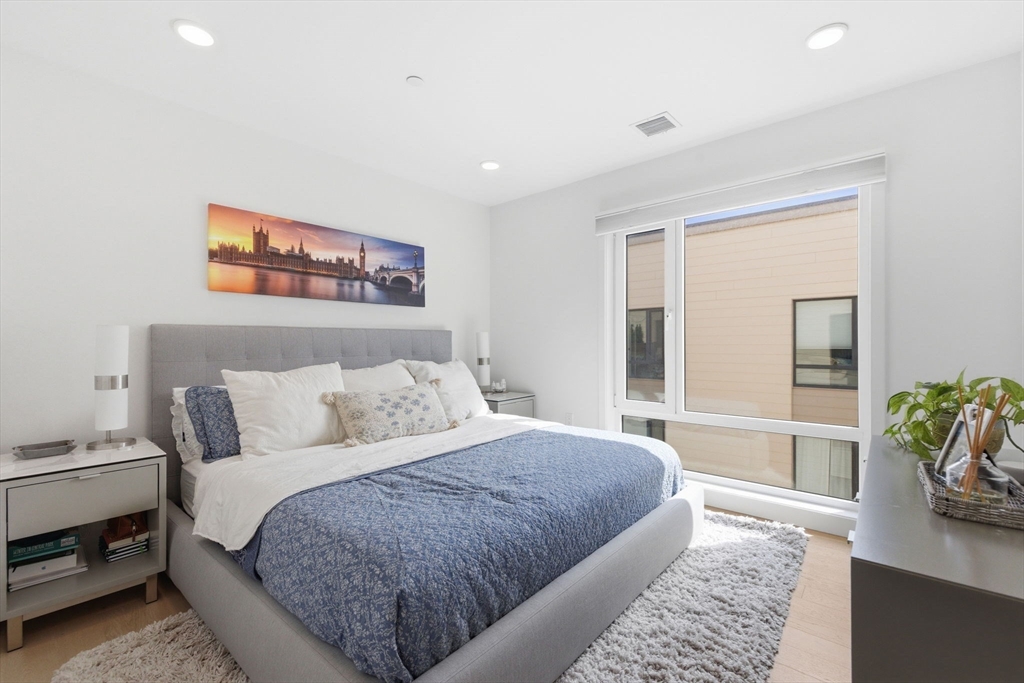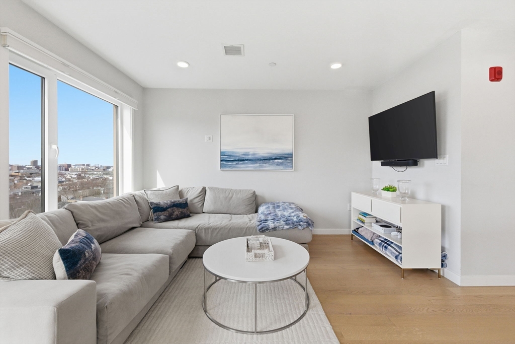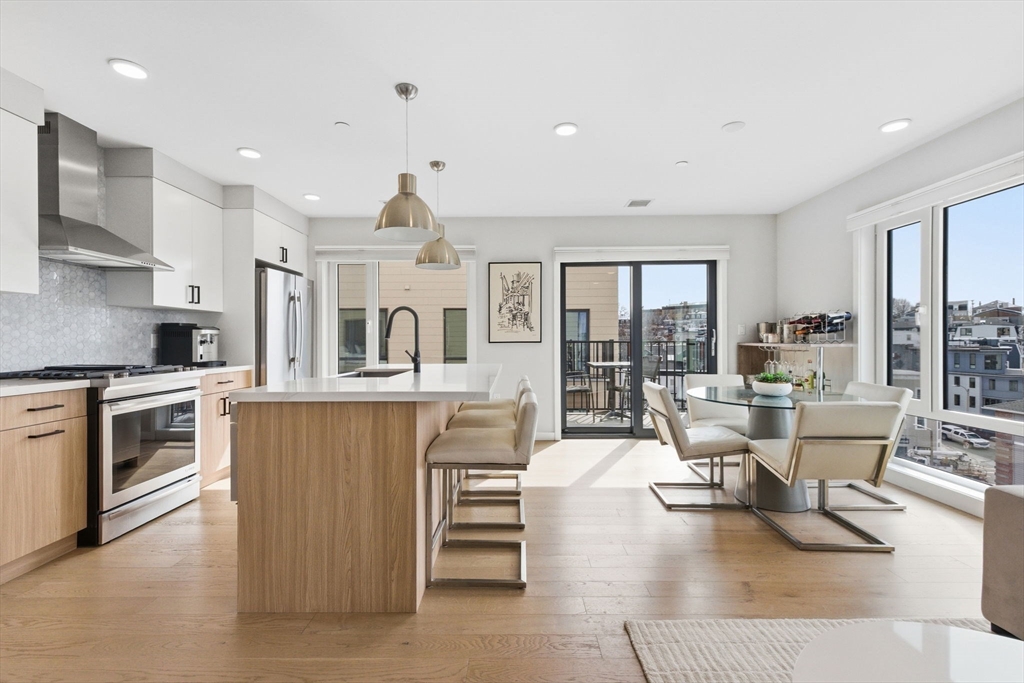 Penthouse 2 bed, 1 bath residence with garage parking, and roof deck at The Blake South Boston, a boutique 44 unit luxury building completed in 2022. This home features a private deck and sweeping Boston skyline views from the living area. Thoughtfully designed with oversized windows, light oak flooring, JennAir appliances, quartz countertops, and a geometric tile backsplash. Residents enjoy premium amenities including a fitness center and a landscaped roof deck with grills, dining, lounge areas, and a dedicated pet space. Ideally located at the corner of West and East Broadway, just moments from Lincoln, Capo, Loco, Ana’s, Playa Bowl, the Broadway MBTA Station and Carson Beach.