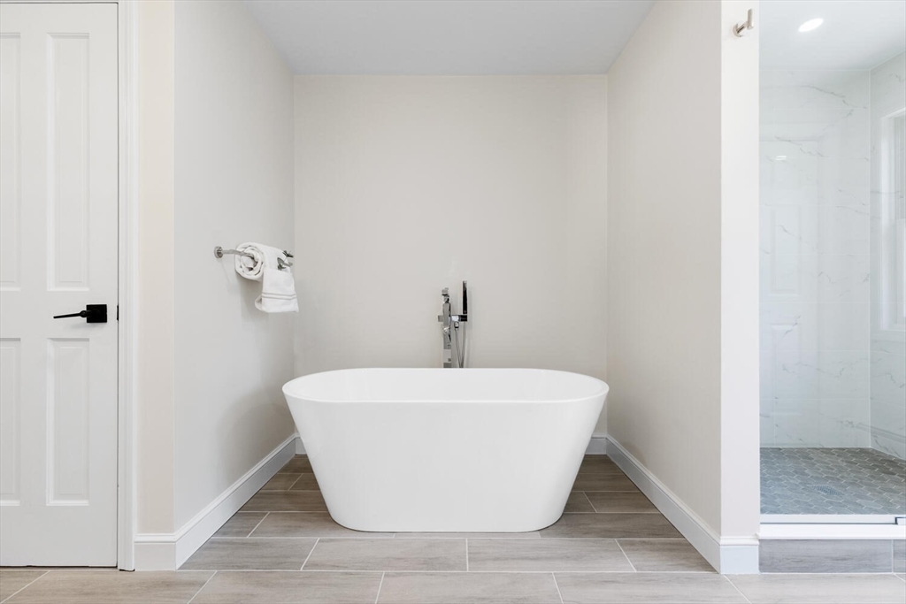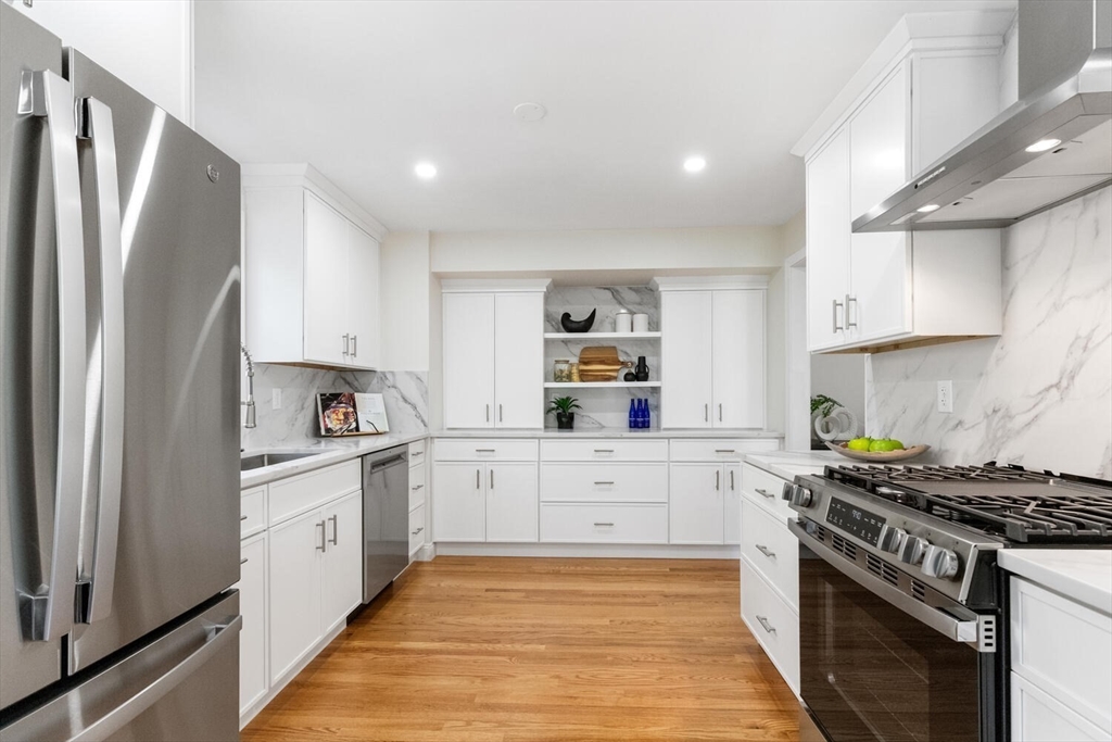 Newly renovated and expanded townhouse in Newton Upper Falls offering a seamless blend of modern design and everyday functionality. This spacious 3BR/3.5BA home features a well-designed layout with a sleek kitchen showcasing quartz countertops, gas cooking with vented hood, GE stainless appliances, and a beverage/serving station, opening to a long private deck. Generous living room with fireplace and a separate dining area offer comfortable space for everyday living and entertaining. All bedrooms include en-suite baths, including a bright top-floor suite with skylights - ideal as a third bedroom, office or family room. Red oak hardwood floors throughout, central AC, second-floor laundry, and ample storage. Flexible finished lower level room for office, gym, or bonus space. 2-car garage plus off-street parking. Tucked away from traffic, yet minutes to Eliot T, Routes 9 & 95, Needham St shops, dining, and parks - a move-in ready single-family alternative.