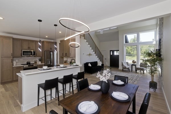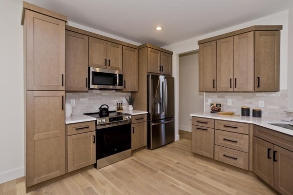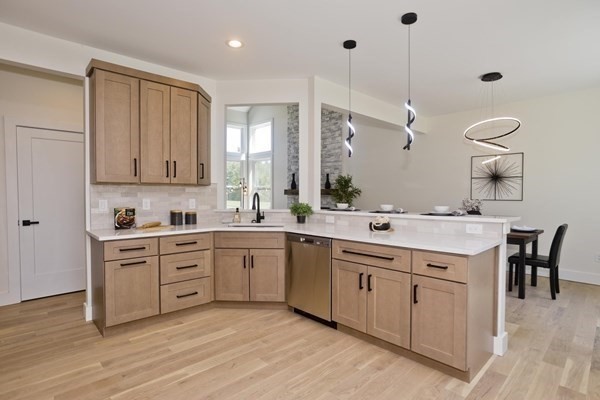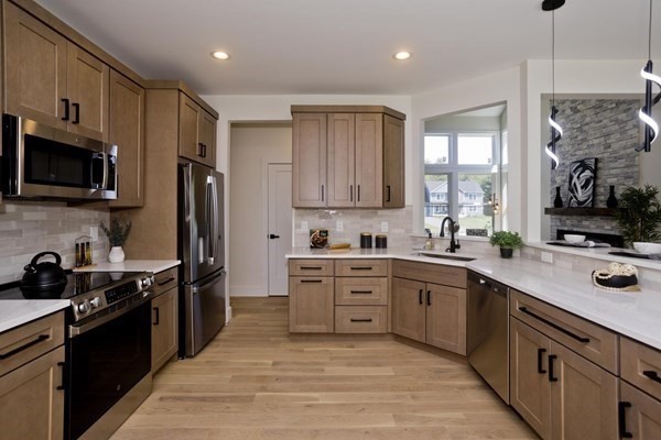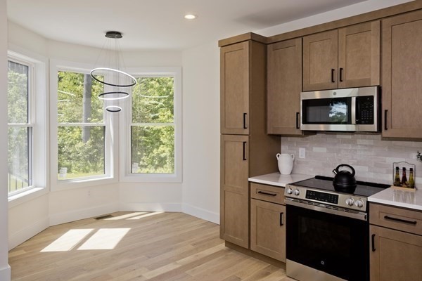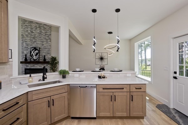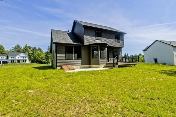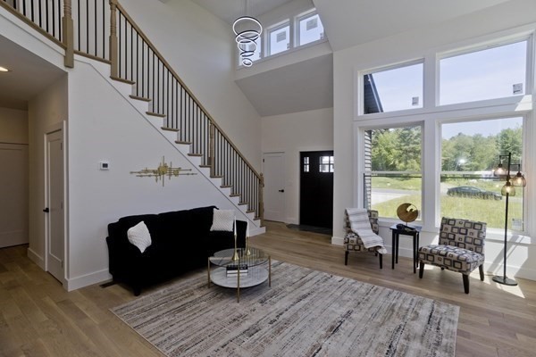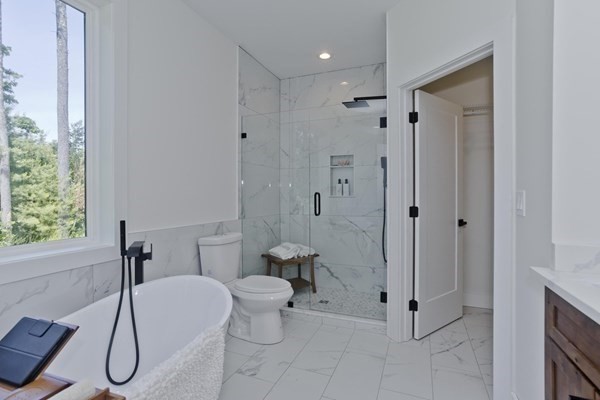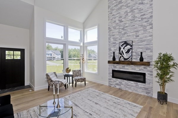 Experience refined living in a neighborhood setting in Belchertown, where this single family new construction stands as an attractive property and a great place to call home. The heart of this residence, the kitchen, is thoughtfully designed with a stylish backsplash, robust stone countertops, and classic shaker cabinets, all beautifully complemented by a practical kitchen peninsula, creating an environment perfect for culinary pursuits and gatherings. Within the living room, a welcoming fireplace invites relaxation and warmth, while the soaring high ceiling, enhanced by a vaulted design and distinctive beamed ceiling, creates an expansive and airy atmosphere for comfortable repose. Indulge in moments of personal rejuvenation within the well-appointed bathroom, offering both a spacious walk in shower for invigorating starts and a luxurious soaking tub for serene unwinding.