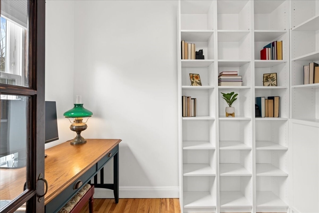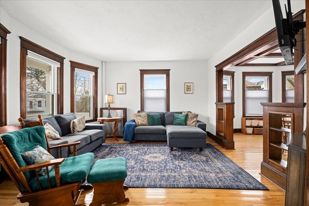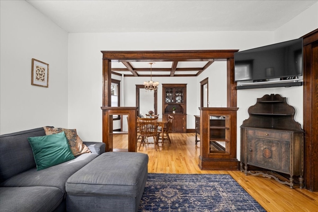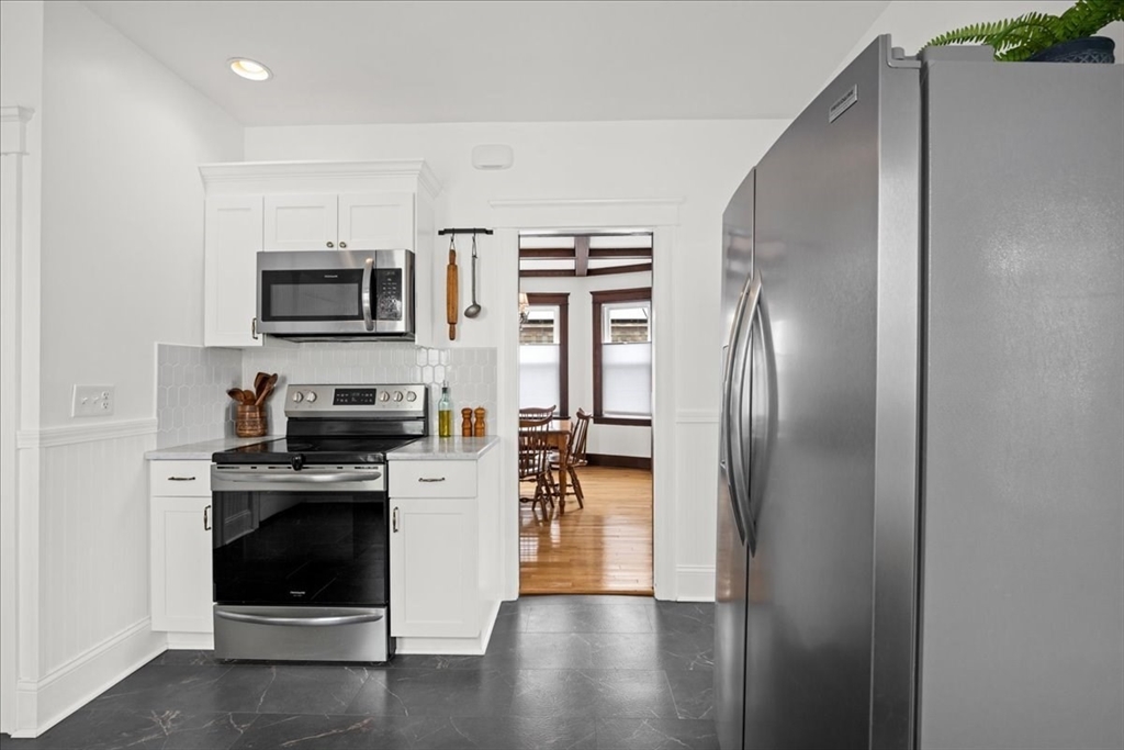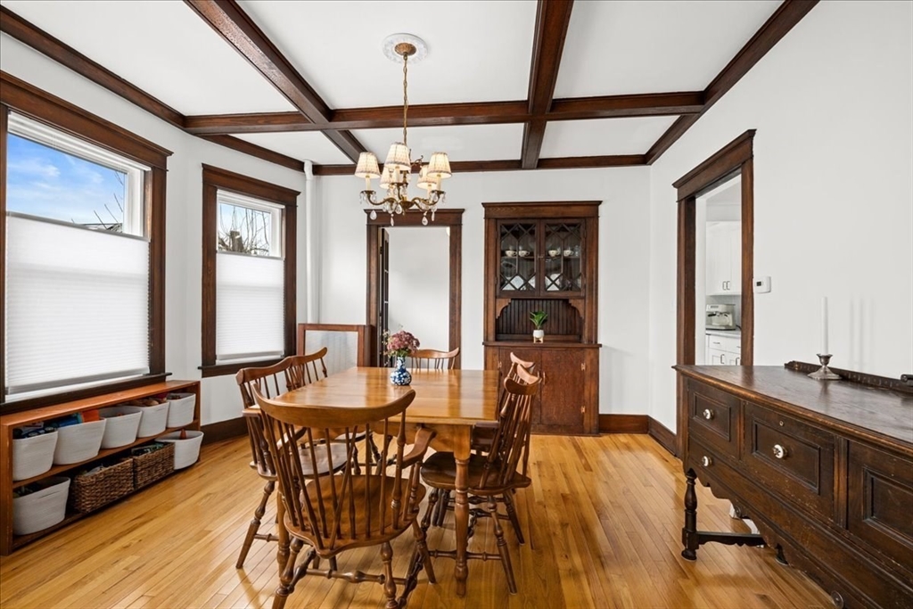 Charming 3-bedroom, 1-bath home blending timeless character with thoughtful updates! Rich hardwood floors and stunning period woodwork shine throughout, highlighted by a beautiful coffered ceiling and built-in hutch in the formal dining room. The bright, updated kitchen features stone countertops, stainless steel appliances, a stylish backsplash, and a separate pantry with sink for added functionality. Enjoy casual dining at the breakfast bar and the convenience of a mudroom entry. A welcoming foyer and classic front porch add to the home’s appeal, while a newer back deck/patio overlooks a spacious, level yard—perfect for entertaining or play. Upstairs offers a renovated bath, walk-in closets, and great natural light. Additional features include a first-floor office and a warm, inviting living room with abundant windows. A perfect blend of charm, space, and modern comfort!
