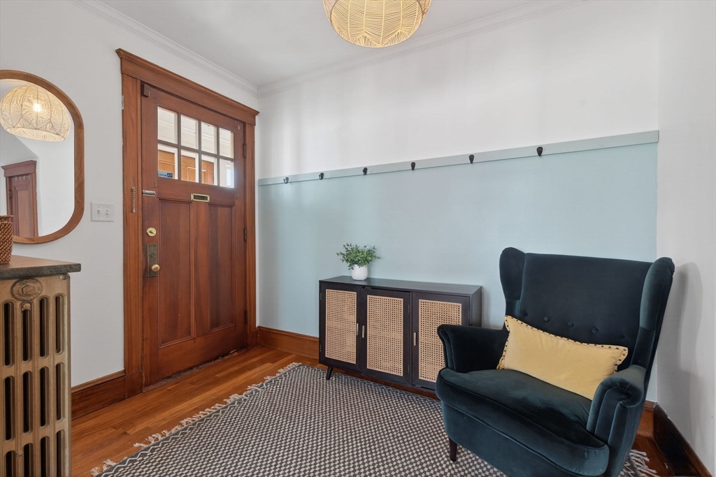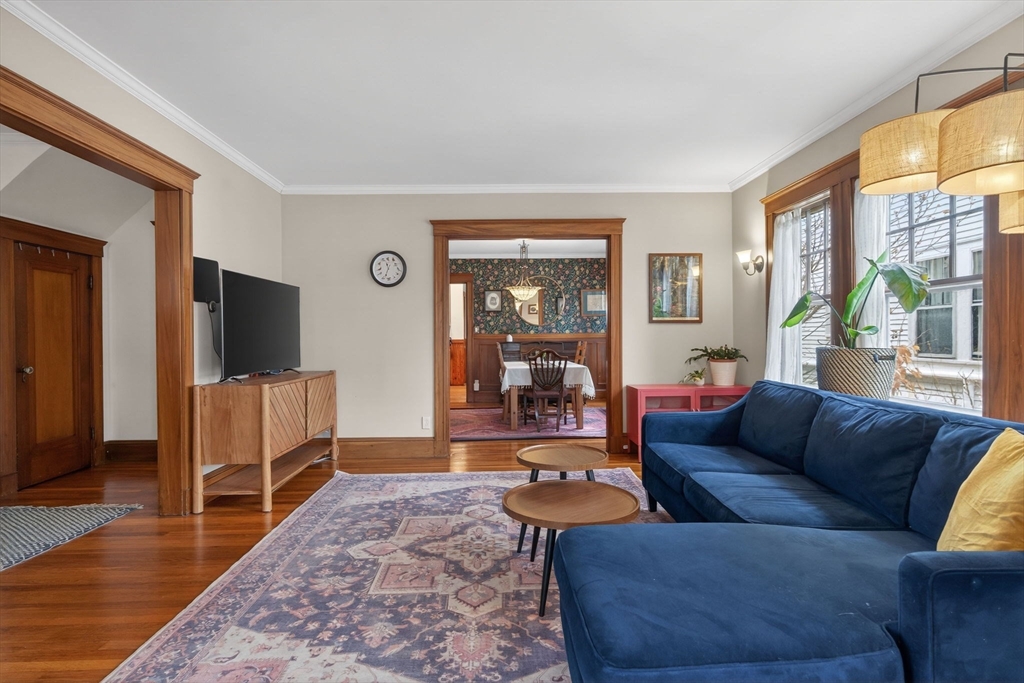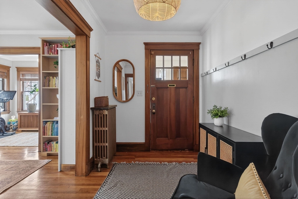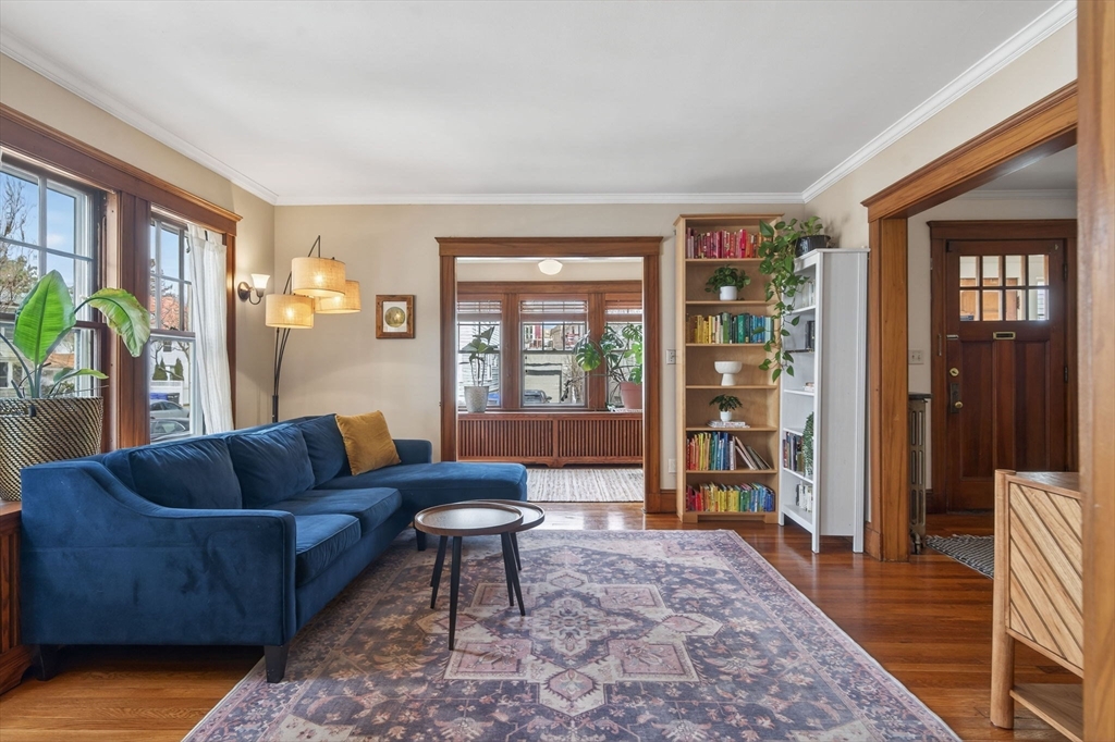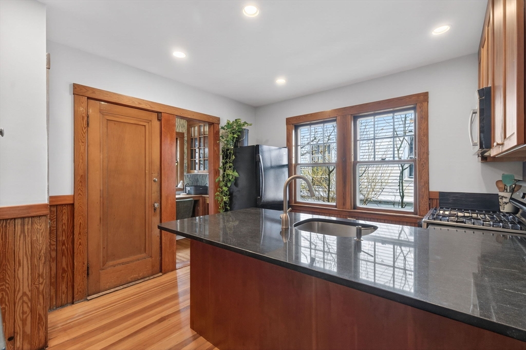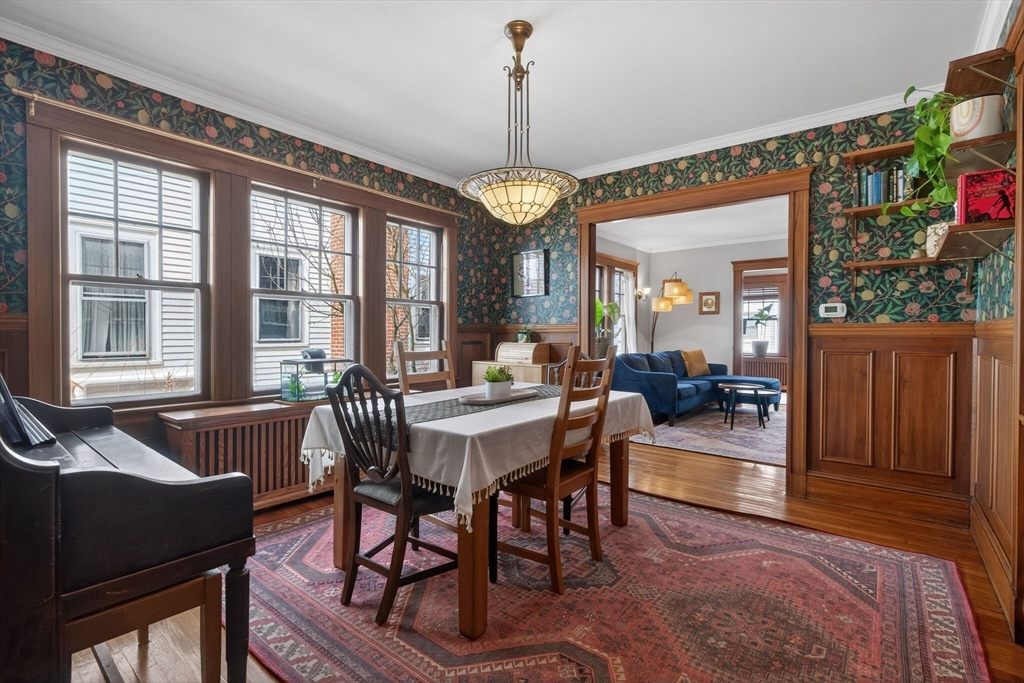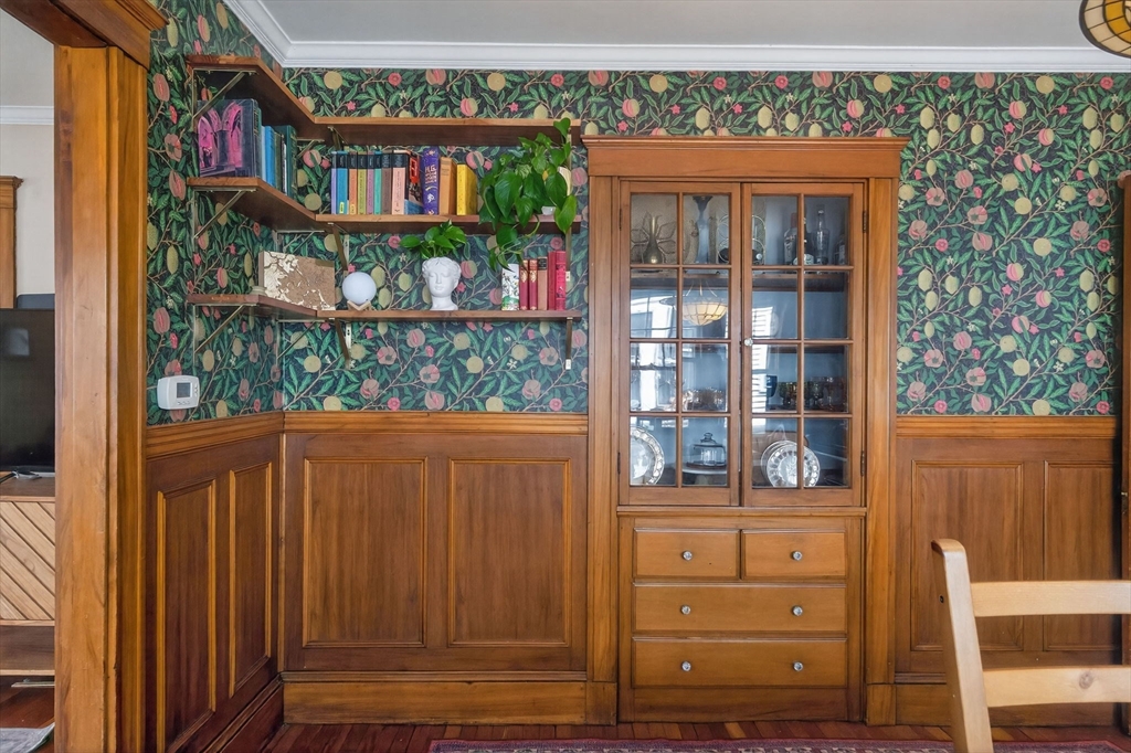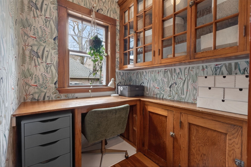 Timeless Pondside charm w/ garage parking! This 2-bedroom plus is rich in original detail, featuring beautiful gumwood trim throughout. A welcoming entry with coat closet opens to the living room with adjacent sunroom—perfect for a work out area, office, or play space. The dining room showcases classic character with wall paneling, vibrant wallpaper, & built-in hutch. The kitchen offers cherry cabinetry, granite countertops, counter seating peninsula, & a breakfast bar, while a butler’s pantry provides additional storage or flexible workspace. The primary bedroom features armoire cabinets & the period bathroom is finished with a pedestal sink & mosaic tile floor. The second bedroom offers versatility with two separate entrances. Enjoy a covered back deck overlooking a small garden. Detached garage parking for one car, exclusive laundry, ample basement storage inc. cedar closet. Located on a coveted neighborhood street known for its block parties, next to Pond, convenient to Longwood.