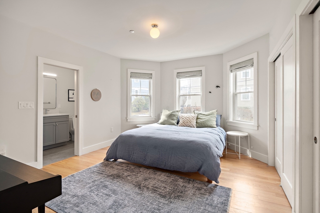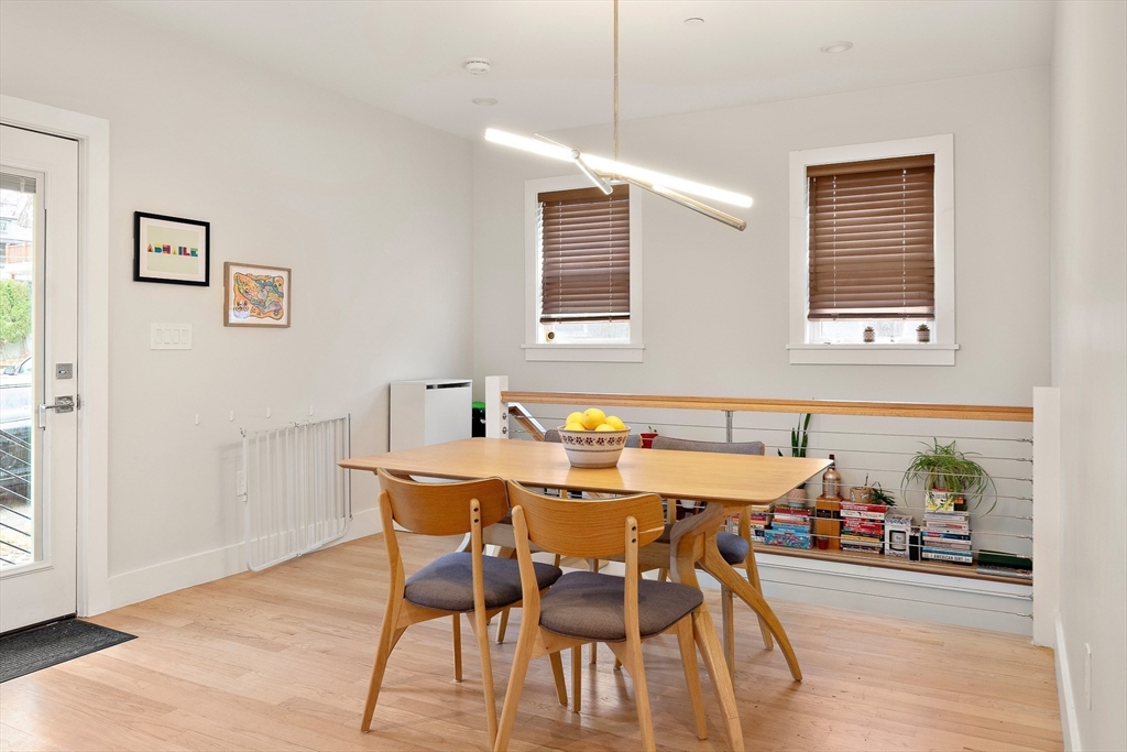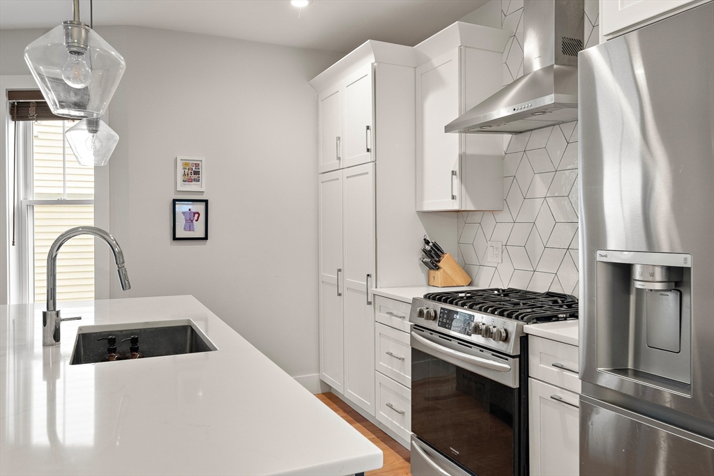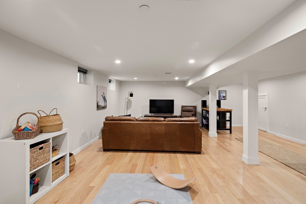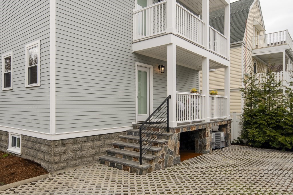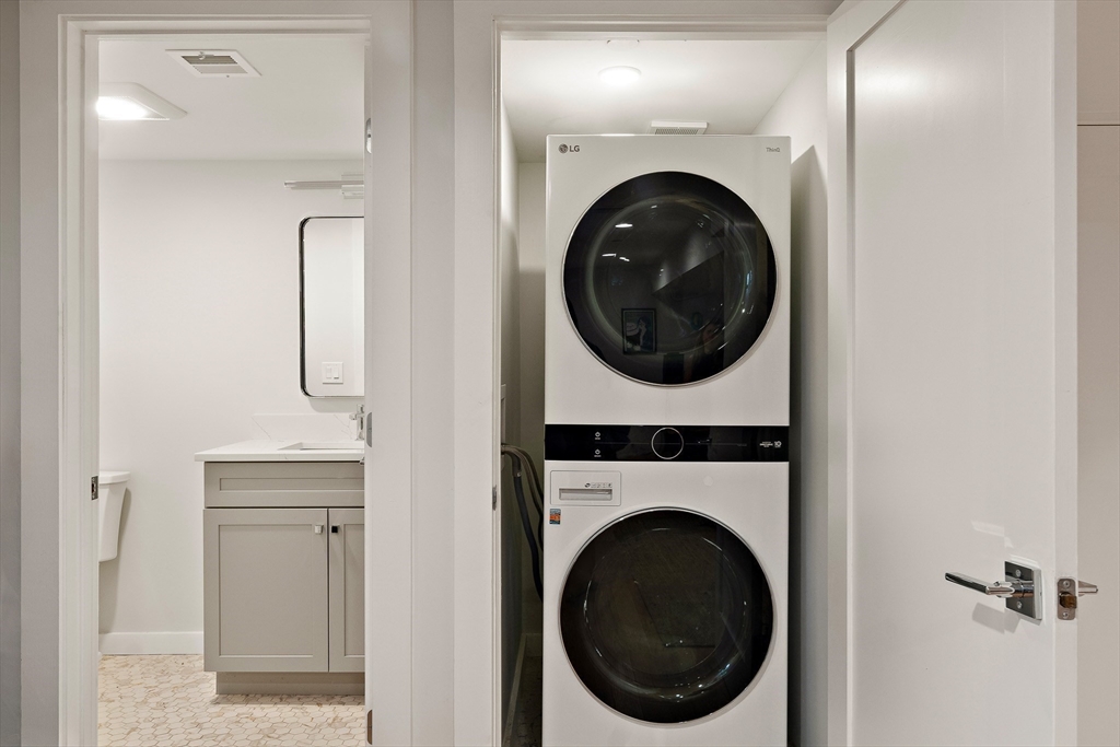 This modern 2-bedroom, 2.5-bath condominium was fully renovated in 2022 and offers 1,801 square feet of thoughtfully designed space across two levels, including a fully finished basement. The main level features an open living and dining area and a chef's kitchen with shaker-style soft-close cabinets and drawers, quartz countertops, a center island, stainless steel appliances, and a tiled backsplash. The primary en-suite and guest bath are finished with high-end tile and fixtures. The lower level offers flexible space ideal for a family room, office, gym, or playroom, along with laundry, storage, and a half bath. Central air throughout. Outside, there's a private rear stone deck and one deeded parking space.
