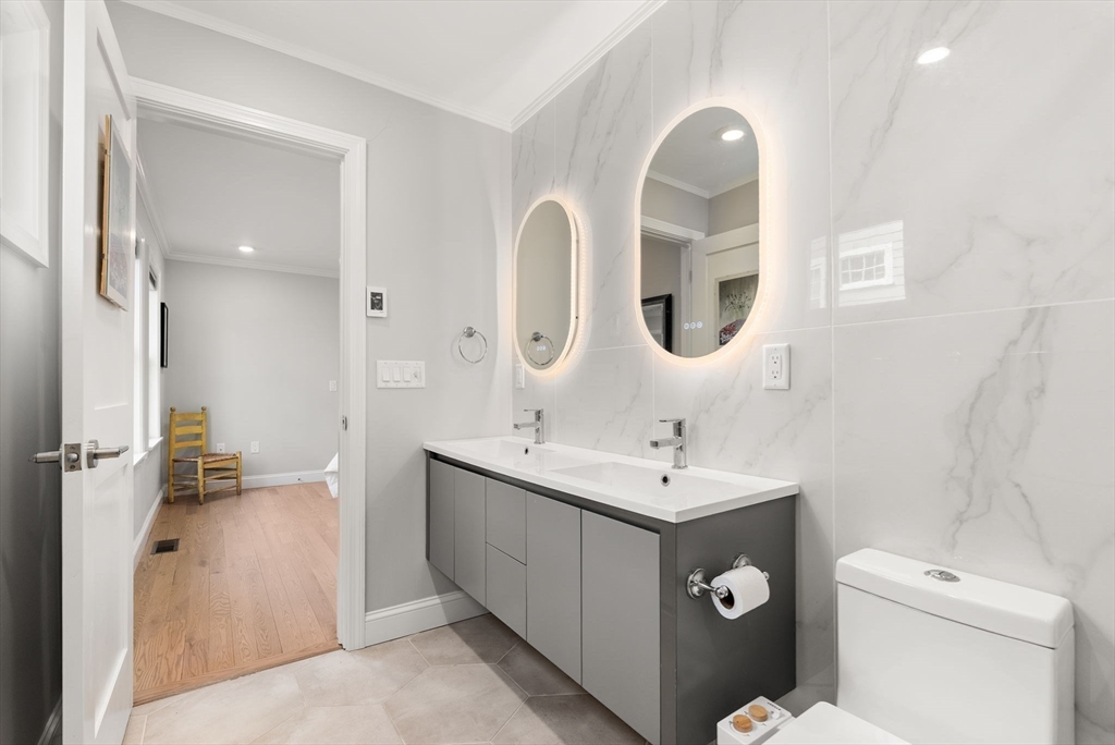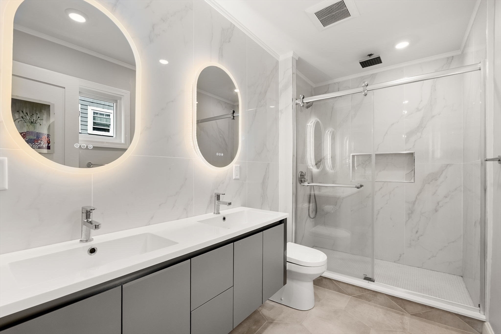 Beautifully renovated in 2023, this 4-bed, 3-bath duplex condo combines modern elegance and thoughtful design. A welcoming foyer leads to a sun-filled open layout that seamlessly connects the living, dining and kitchen areas. The kitchen is designed to satisfy even the most discerning home chef, w/custom cabinets, large island w/breakfast bar, high quality appliances. The primary bedroom suite features walk-in closet and spa-inspired bathroom. A second bedroom and gorgeous full bathroom complete the main level. The walk-out lower level offers 2 bedrooms, stunning full bathroom, and over-sized family room. The family room opens to a large private patio perfect for hosting gatherings or enjoying a serene garden setting. Private deck off the living room, storage shed, and driveway parking w/EV outlet. Located on a lush, tree-lined street near schools, parks, and shops/restaurants of Arsenal Yards, this exceptional home delivers high-end style and functionality in a very desirable setting.