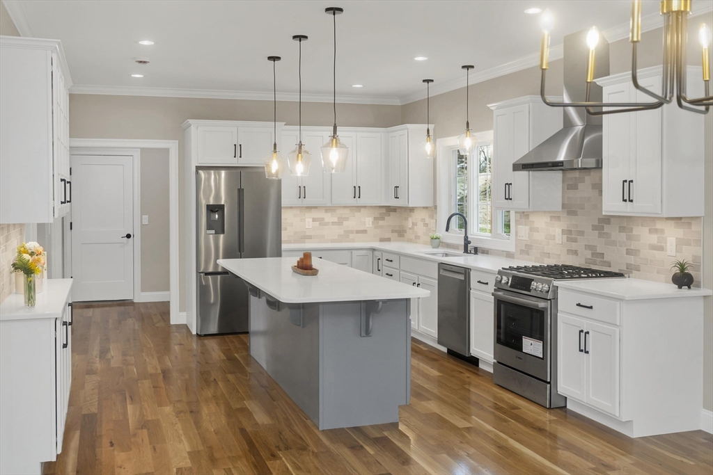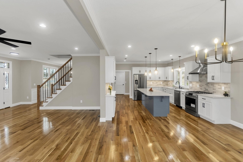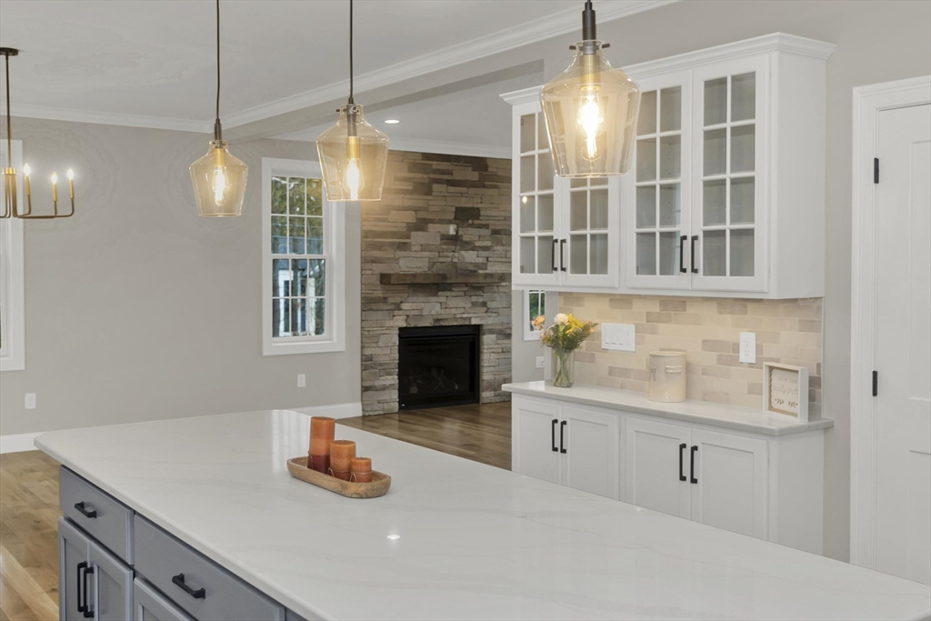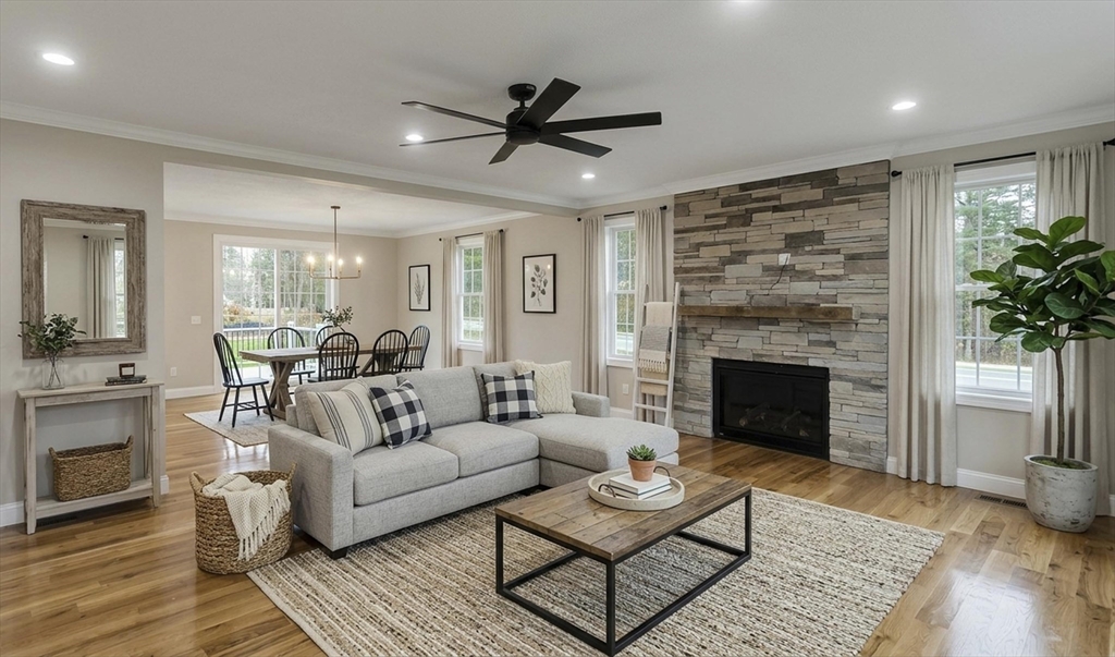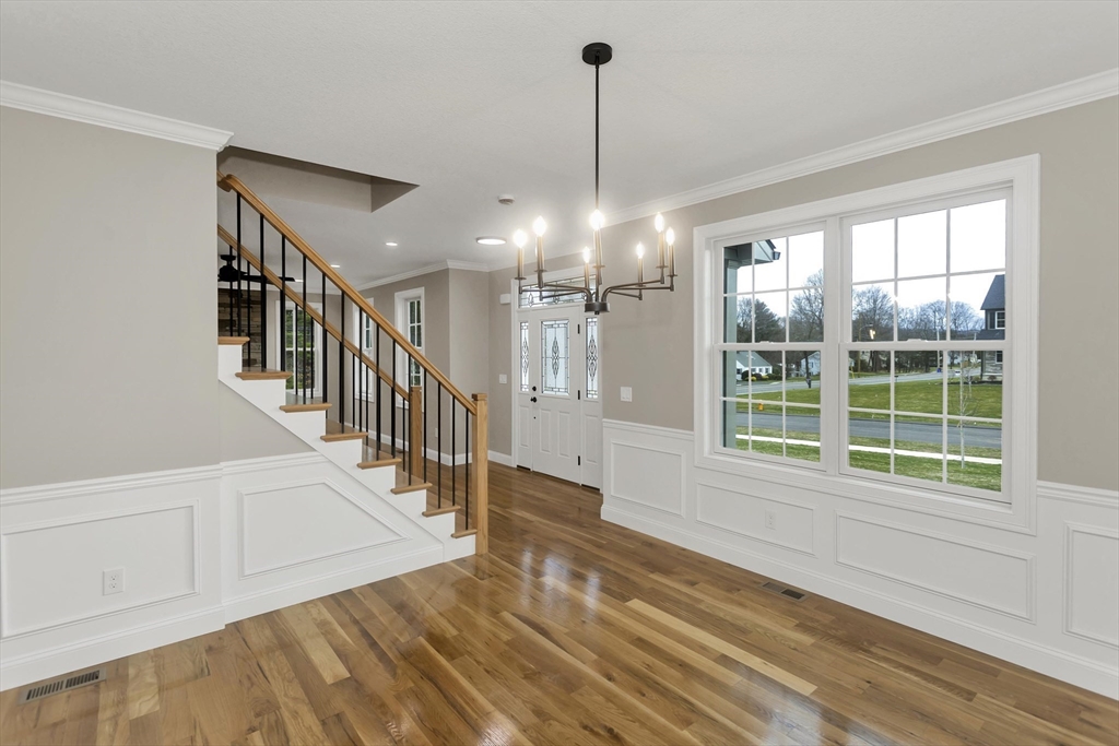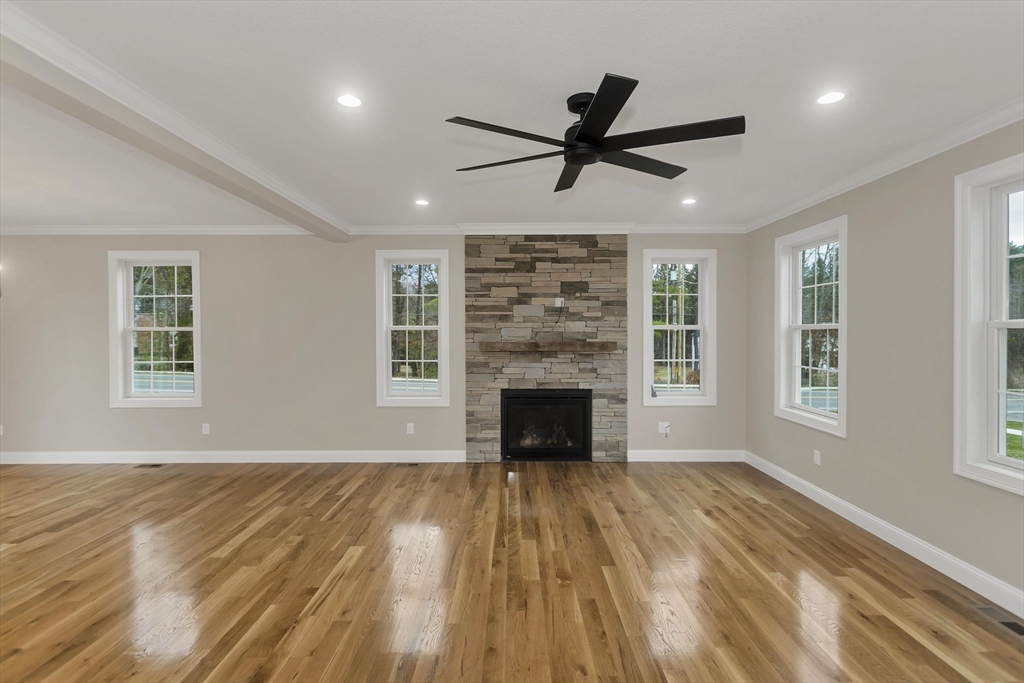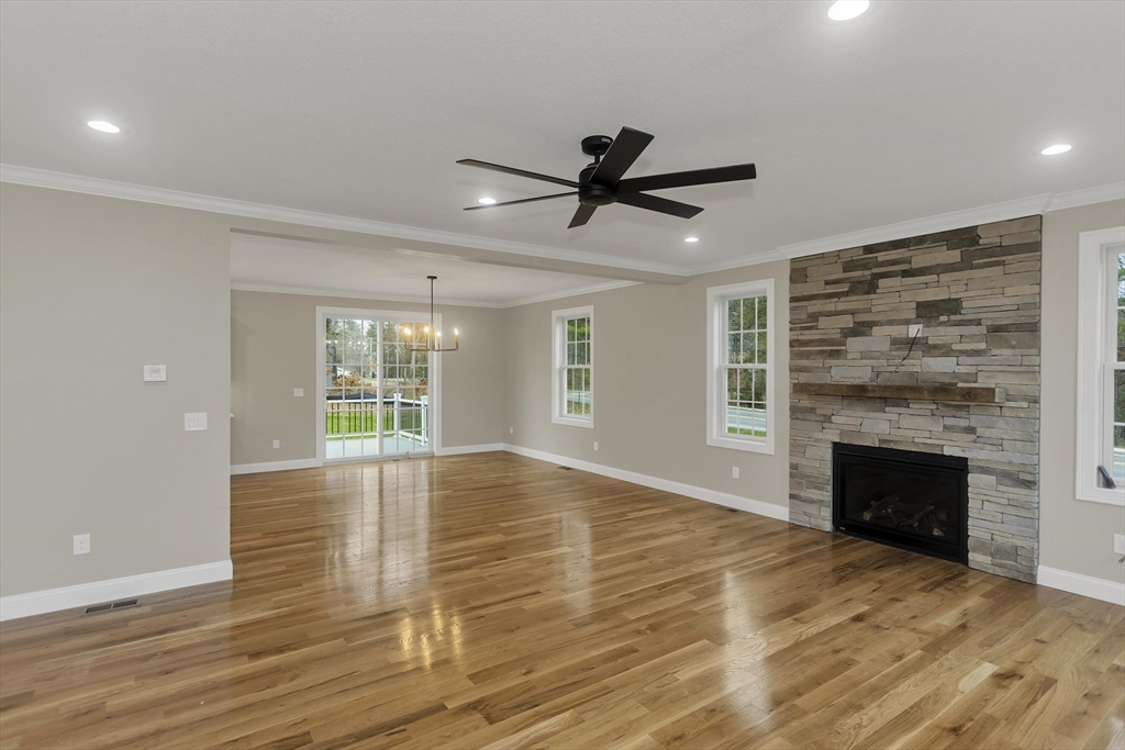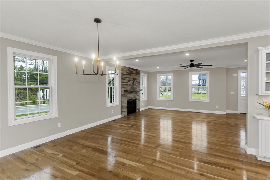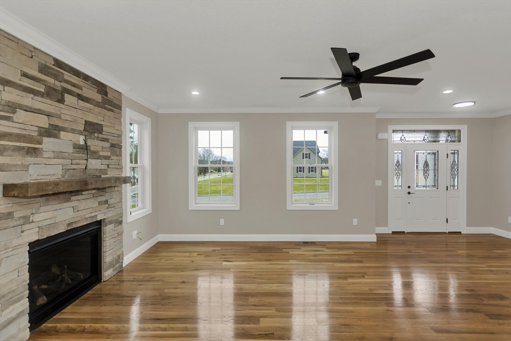 This spacious 5-bedroom NEW CONSTRUCTION home offers stunning white oak hardwood floors throughout the open floor plan. Off the two-car garage is a large coat closet. The living room features a stone floor-to-ceiling gas fire place, and lovely mantel. The kitchen is highlighted by a grey-toned large center island, plenty of cabinets, and elegant crown molding, which continues throughout the home. Adjacent to the kitchen is a formal dining room, perfect for those home cooked meals. Upstairs, the home offers five spacious bedrooms and well-appointed bathrooms featuring tile in both showers. Additional conveniences include a laundry room with cabinetry and a utility sink, as well as a linen closet providing extra storage. The primary bedroom features the same white-oak hardwood floors, two custom walk-in closets and a stunning primary bath with marble floor and marble tiled shower. This home is among the first homes offered in the newest East Longmeadow Subdivision.