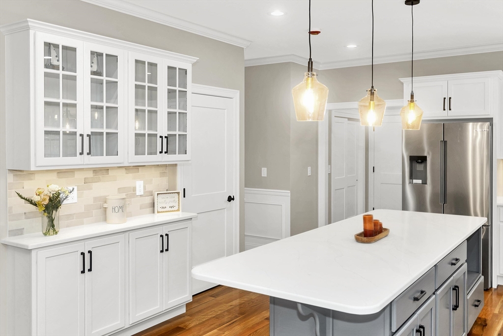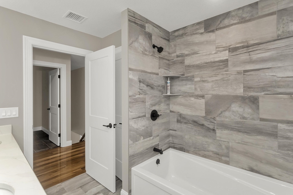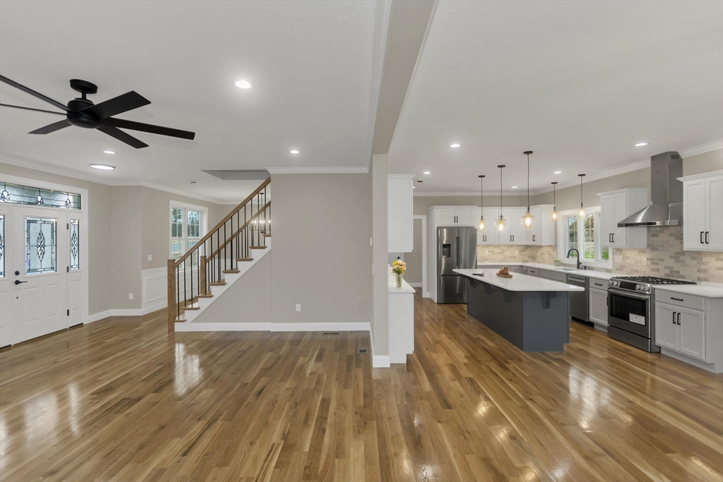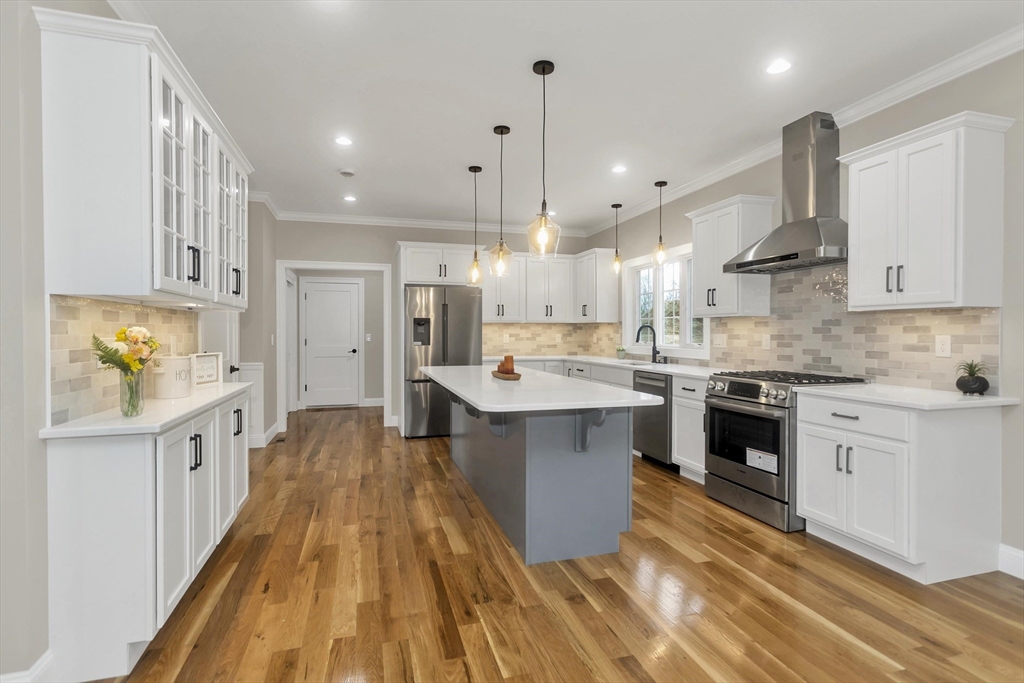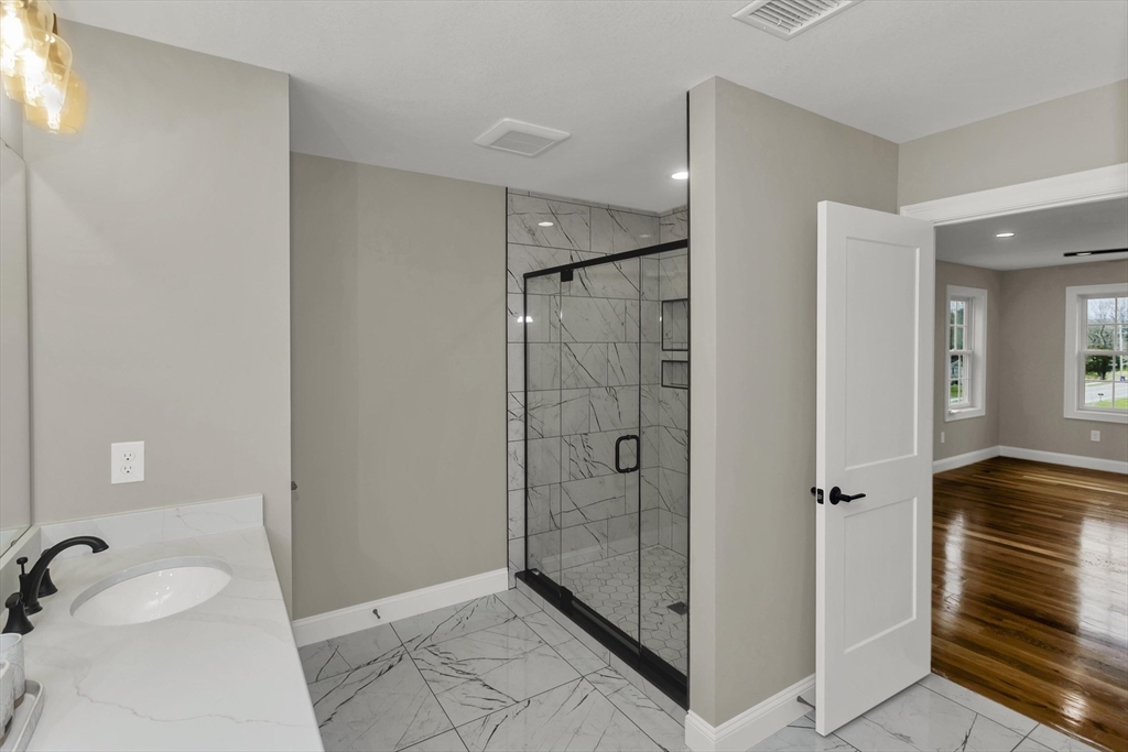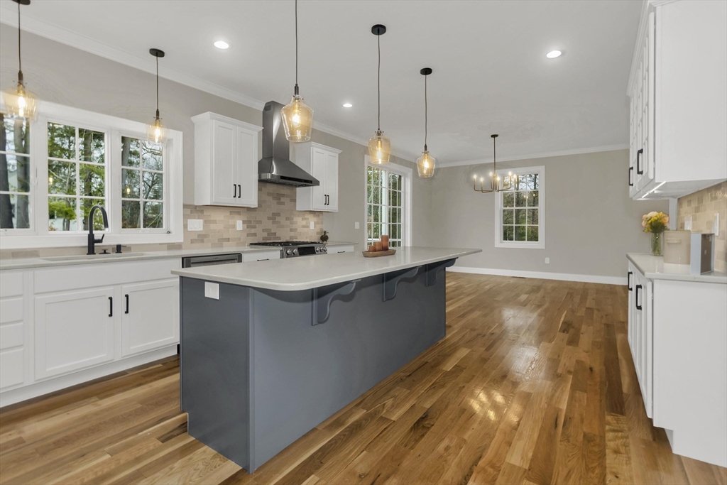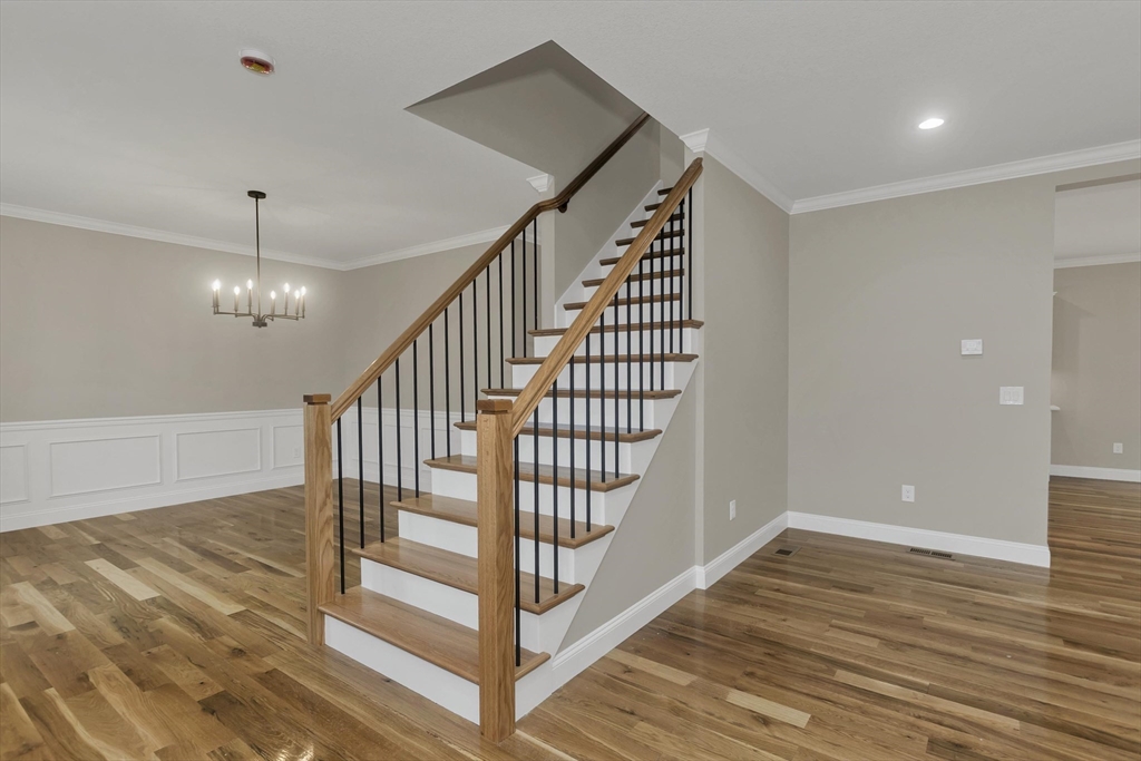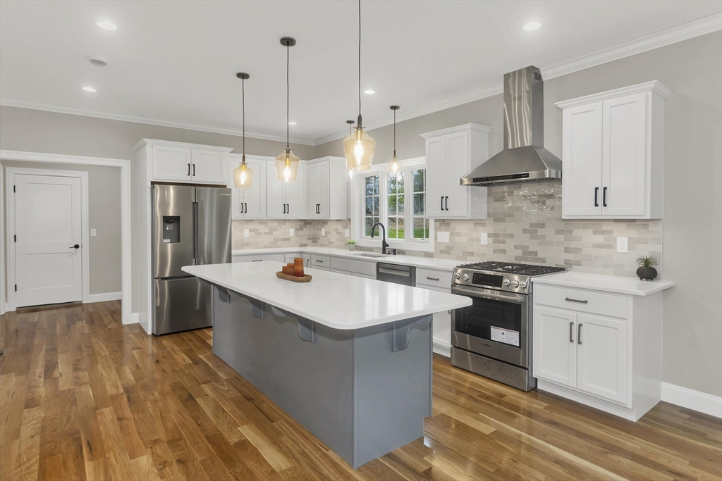 This spacious 5-bedroom NEW CONSTRUCTION home offers stunning white oak hardwood floors throughout the open floor plan. Off the two-car garage is a large coat closet. The living room features a stone floor-to-ceiling gas fire place, and lovely mantel. The kitchen is highlighted by a grey-toned large center island, plenty of cabinets, and elegant crown molding, which continues throughout the home. Adjacent to the kitchen is a formal dining room, perfect for those home cooked meals. Upstairs, the home offers five spacious bedrooms and well-appointed bathrooms featuring tile in both showers. Additional conveniences include a laundry room with cabinetry and a utility sink, as well as a linen closet providing extra storage. The primary bedroom features the same white-oak hardwood floors, two custom walk-in closets and a stunning primary bath with marble floor and marble tiled shower. This home is among the first homes offered in the newest East Longmeadow Subdivision.