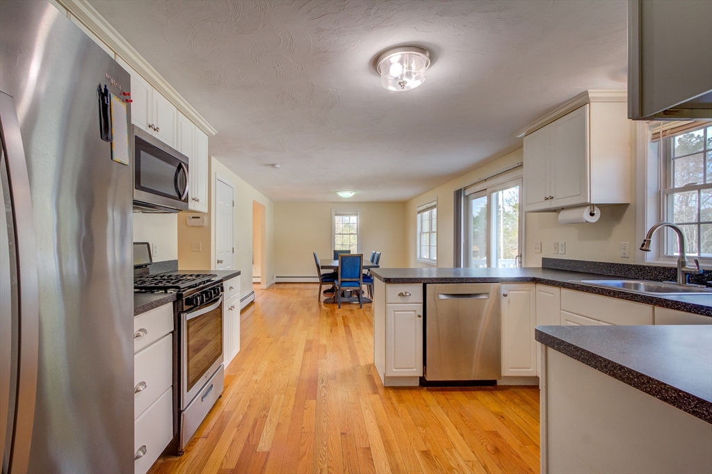 Impeccable, 4 bedroom, 2.5 bath culdesac colonial home! Enter through the lovely covered farmer's porch into the central hallway w/ oversized closet. Beyond is the open, spacious stainless kitchen w/ beautiful white cabinetry & breakfast bar. Multiple floor plan options include rear dining area or LR w/ sliders to the massive Trex back deck overlooking the fully fenced yard. Either front room will serve as den, dining room or LR. The main level has gleaming hardwood throughout & a tiled half bath for guests. Upstairs, the main suite has double closets, cathedral ceilings, transom window & private, newly renovated full bath! The other 3 ample bedrooms have ceiling fans & a gorgeous, shared ceramic tile full bath. Extras incl. the finished heated basement room, 4 splits, all appliances, laundry, window treatments, Generac & jungle gym. Close to Swifts beach & abutting 118 acre conservation area w/ walking paths & pond. 1st showings at Open House, Sunday 4/12 from 2 to 3, hope to see you!