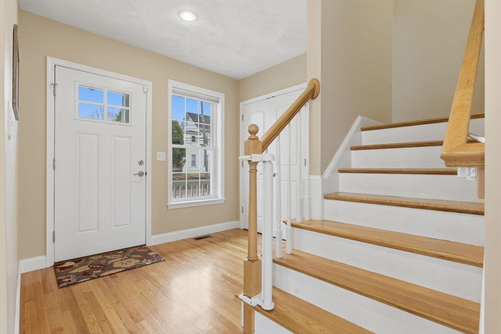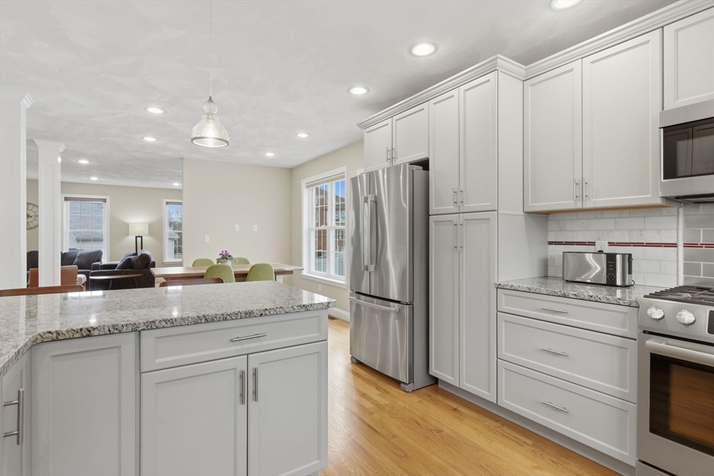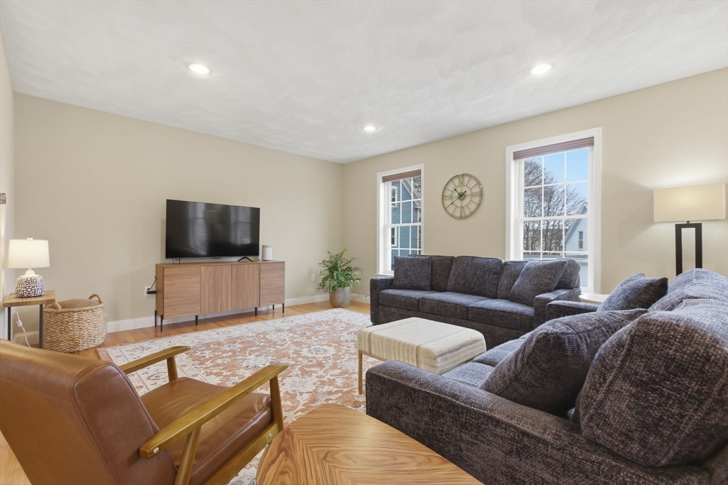 Welcome to 36 Pleasant Street, a thoughtfully designed townhouse in Stoneham offering four levels of bright, versatile living space with exceptional storage throughout. The main level features hardwood floors and a seamless layout with great flow for everyday living and entertaining. A comfortable living room with gas fireplace opens to the dining area with wet bar, while sliders lead to a private, fenced patio—perfect for relaxing or hosting. The kitchen is equipped with granite countertops, stainless appliances, and a breakfast bar. A half bath completes the level. Upstairs, the primary suite includes a walk-in closet and well-appointed bath, along with two additional bedrooms, a full bath, and a separate laundry room. The top floor offers flexible space for a fourth bedroom, office, or gym, with plumbing in place for a future bath. Mudroom access from the two-car garage adds convenience. Well located near shops, dining, and major routes.