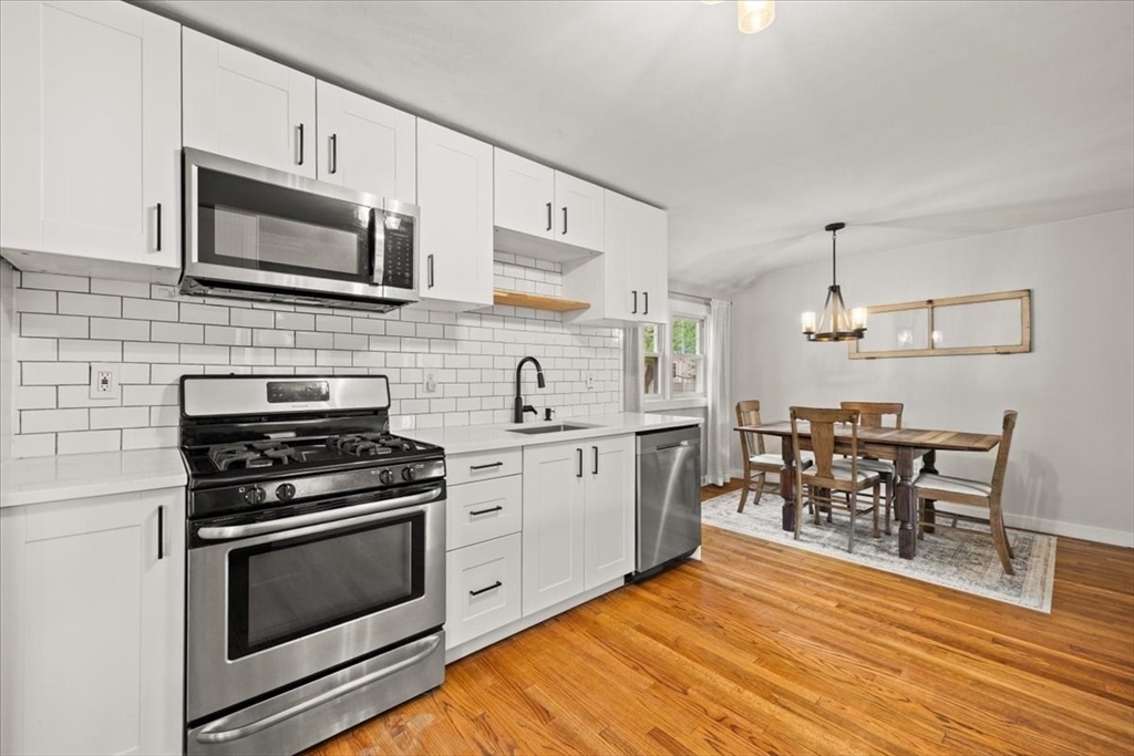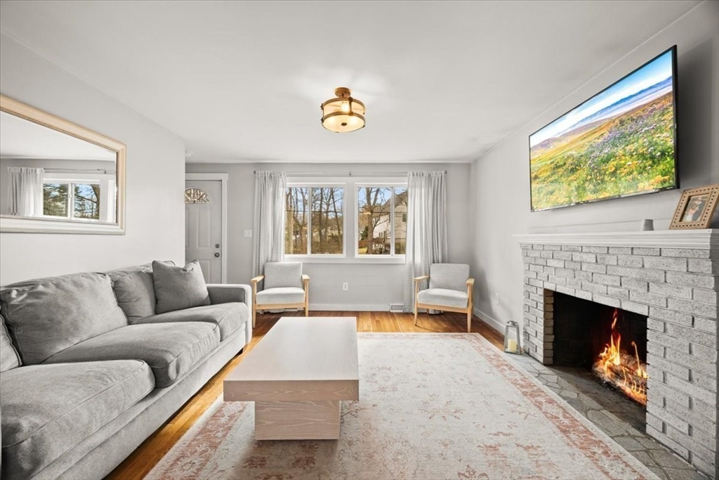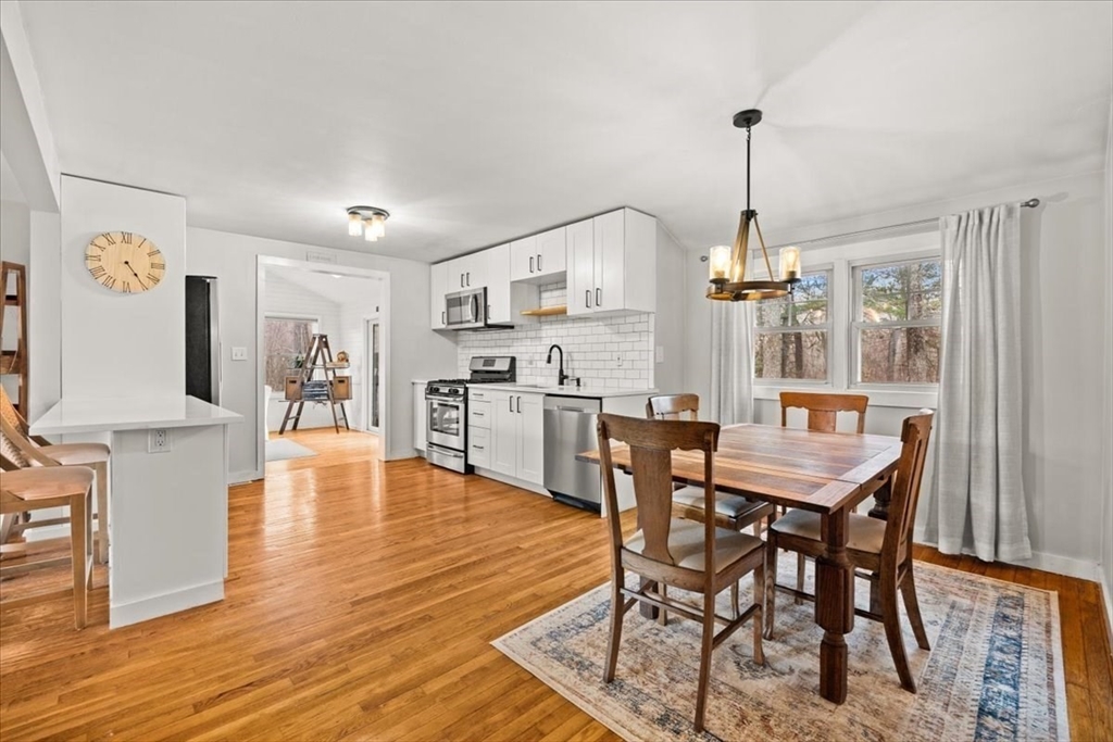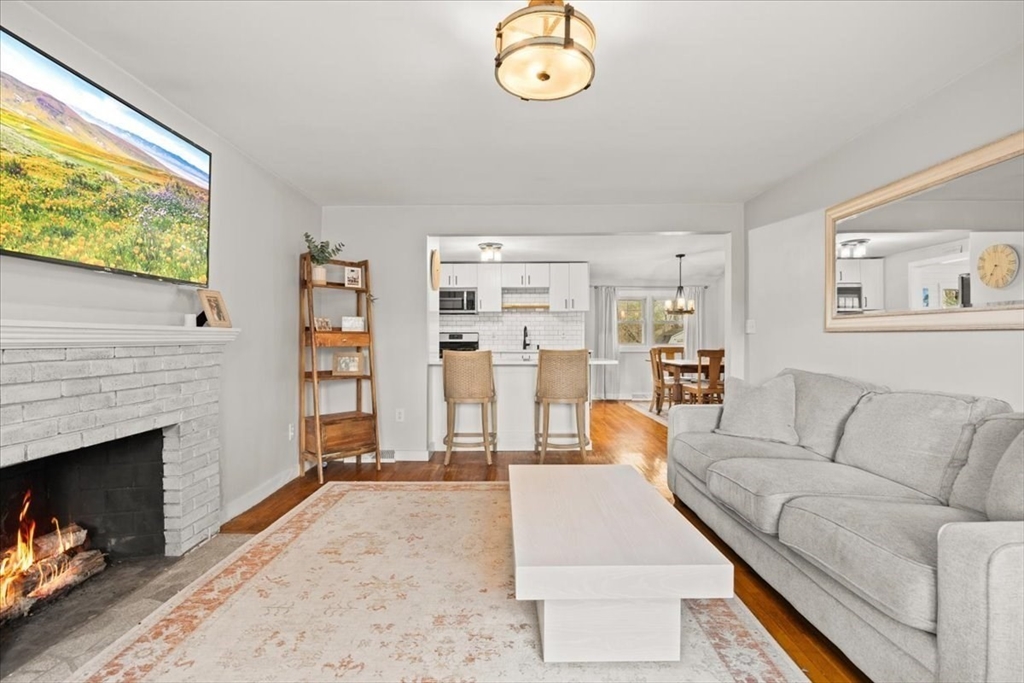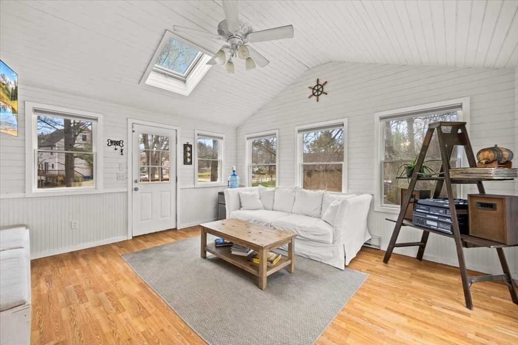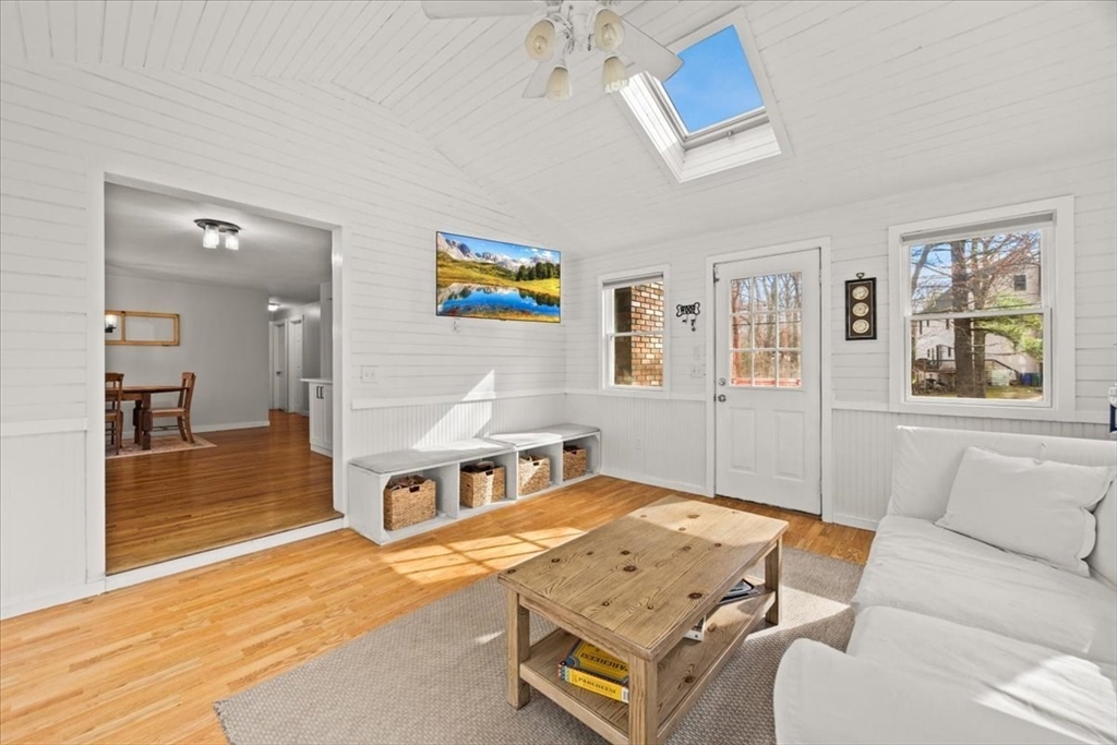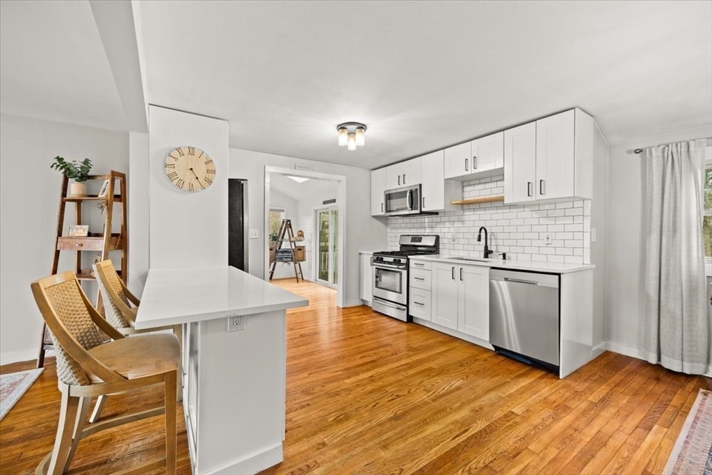 Welcome to 34 Hitchcock Lane in Attleboro! Tucked away at the end of a quiet street, this loved home offers 3 bedrooms, 1 full and 2 half baths, and a flexible layout perfect for everyday living and entertaining. Inviting family room/sunroom featuring a cathedral ceiling, skylights, and slider leading to a spacious deck. The updated kitchen boasts quartz countertops, stainless steel appliances, a peninsula island, and a dedicated dining area. A second living area offers hardwood floors and a cozy wood-burning fireplace. The main bedroom features hardwood floors and a convenient half bath, while two additional bedrooms also offer hardwood flooring and updated full bath completes the main living area! The finished lower level includes a family room, half bath, laundry area, and ample storage, lots of recess lighting and walk-out access to a private, fenced-in backyard. Gas heat, Central Air and Pass Title V in hand!