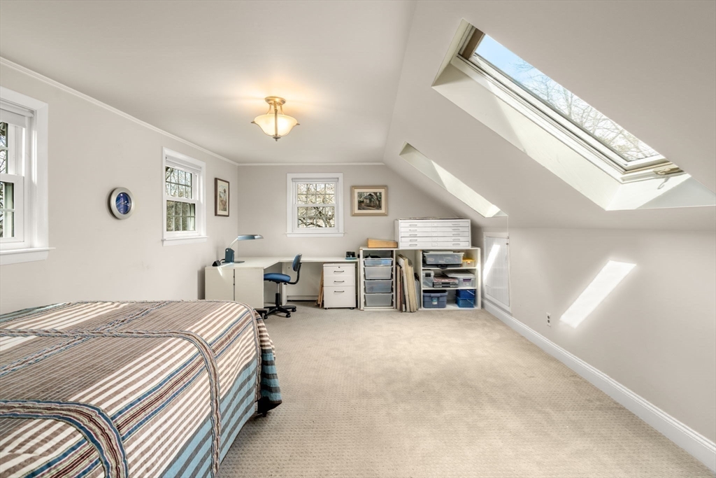 Set on over 12,000 sq foot lot on a cul-de-sac in the desirable village of Waban, this 1940's brick front colonial features pride of ownership, inside & out. Maintaining the era of the home, there is a formal dining room, front to back living room w/working wood burning fireplace & a sunroom. A 2001 addition to the home offers another living area/family room with beautiful sunlight, cathedral ceiling, skylights & extends the lovely kitchen with open island. Eat-in-kitchen, pantry, mudroom & half bath round out this level. On the 2nd floor there are 3 generous sized bedrooms, including the primary which has a walk-in closet. Two full baths, 1 with a jetted tub & central air on this level only. The partially finished basement has a wood burning fireplace, knotty pine walls and has multiple uses. The lovely yard is accessed from the family room, with a deck and a fully fenced yard, & extended beyond is a side yard with large storage shed. A 1 car garage & plenty of parking! Come see!