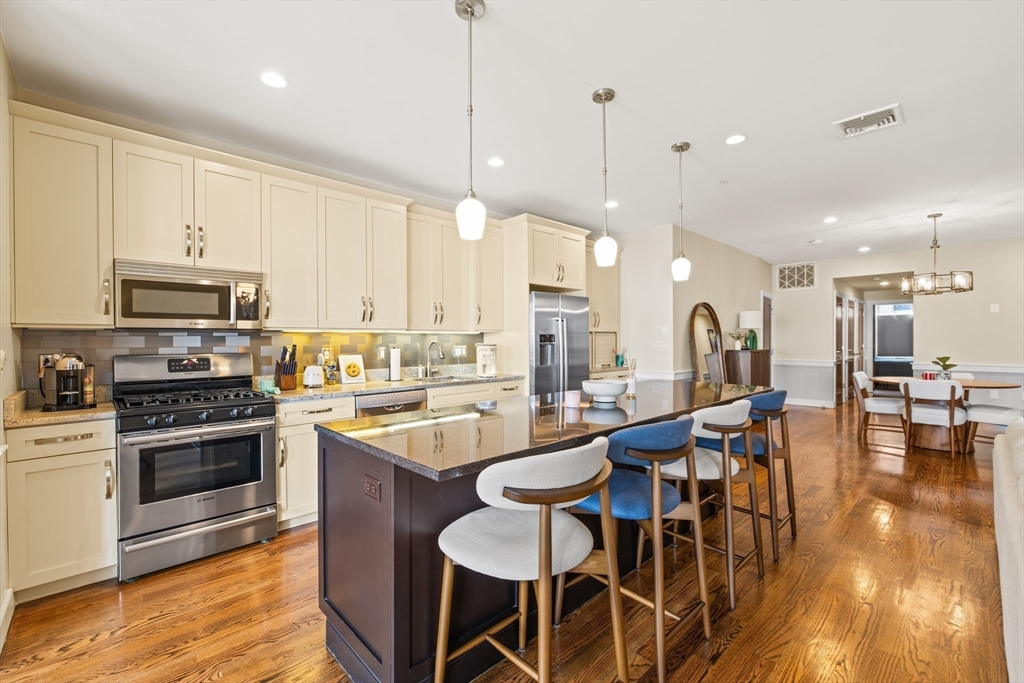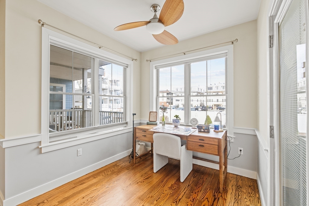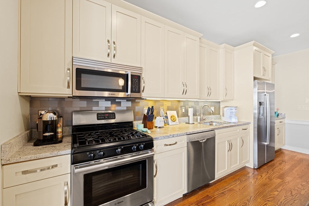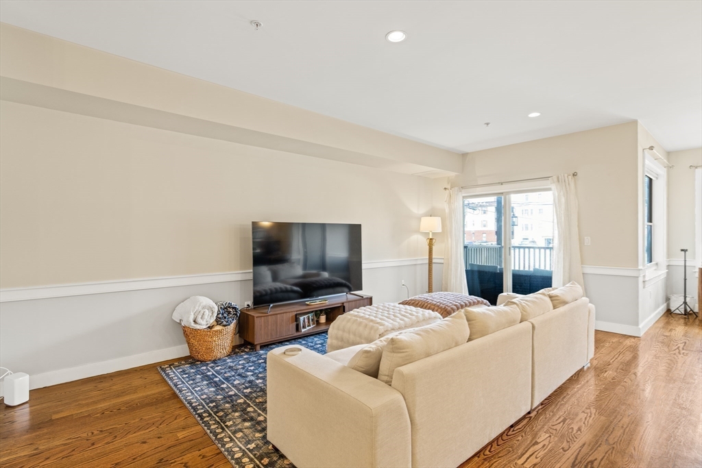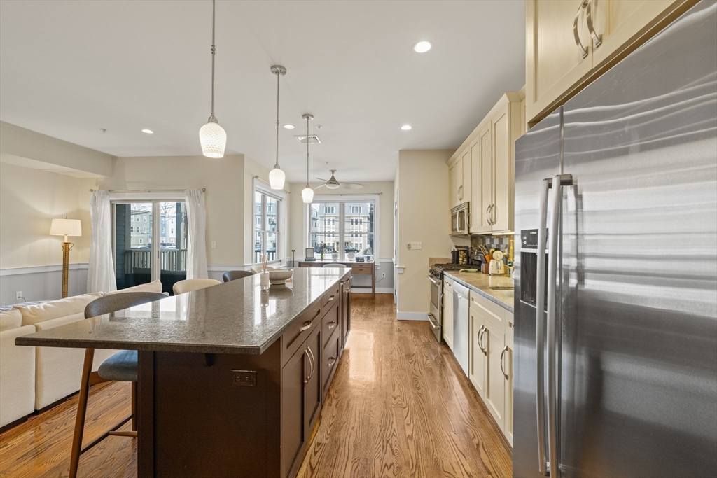 Oversized and thoughtfully designed, this home offers a rare combination of space and flexibility, including a private attached two-car heated garage with visitor parking options. The main level features an open-concept layout with 9’ ceilings and oak hardwood floors throughout. A spacious living and dining area flows into a chef’s kitchen equipped with a Bosch appliance package, abundant cabinetry, and a large granite island ideal for everyday living and entertaining. A dedicated home office nook, half bath, in-unit laundry, and generous front hall closet complete the level. The bedroom is bright and expansive, offering both a double-wide closet and a walk-in, along with an en-suite bath featuring a large glass shower. Just off the living space, enjoy a private covered mahogany deck, perfect for year-round use. A second-level bonus room adds exceptional versatility, ideal for a home office, gym, or additional living space, with a large closet for added storage.