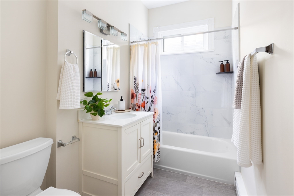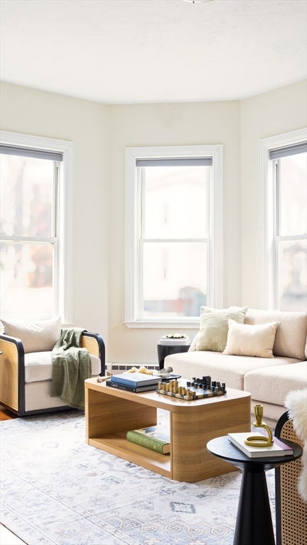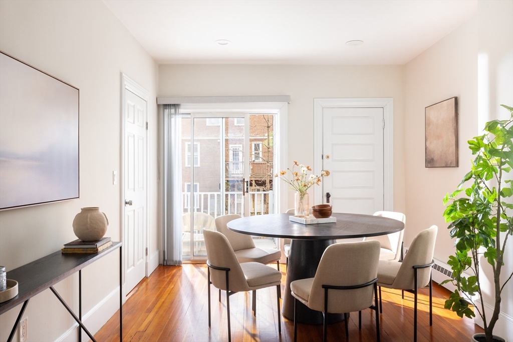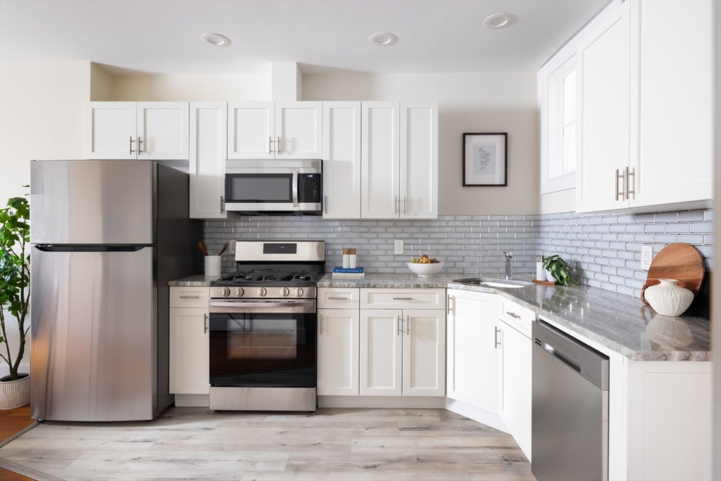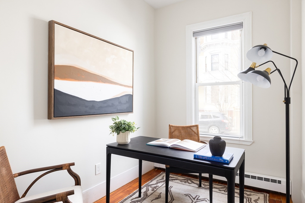 Ideally located in Mid-Cambridge, this floor-through residence maximizes every inch of an expansive layout featuring two bonus rooms, private outdoor space, and tasteful modern updates. High ceilings and hardwood floors lead to a living room with a 4-exposure bay window and decorative fireplace with ornate detailing and mantel. The primary suite offers a quiet retreat with a bay window and en-suite bath, while two additional bedrooms flank a full bath with a marble-style quartz surround. A standout benefit is the dual flex spaces—perfect for a home office, gym, or walk-in closet. The updated eat-in kitchen accommodates a table for six and features white cabinetry and premium 2021 Samsung/LG stainless appliances. A sliding door opens to a private covered rear deck, seamlessly extending indoor/outdoor living.In-unit laundry, Central AC, and storage complete the home, while proximity to Whole Foods, the T, and icons like Life Alive and Little Donkey places you at the center of it all.