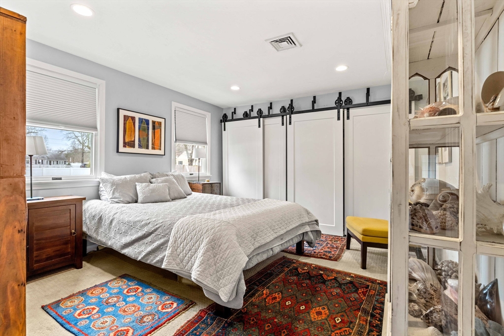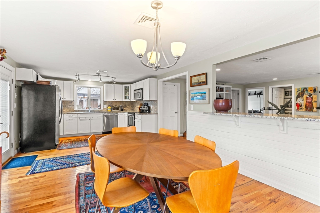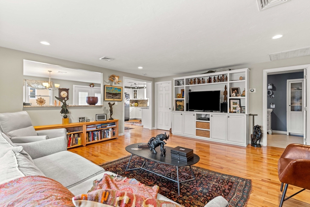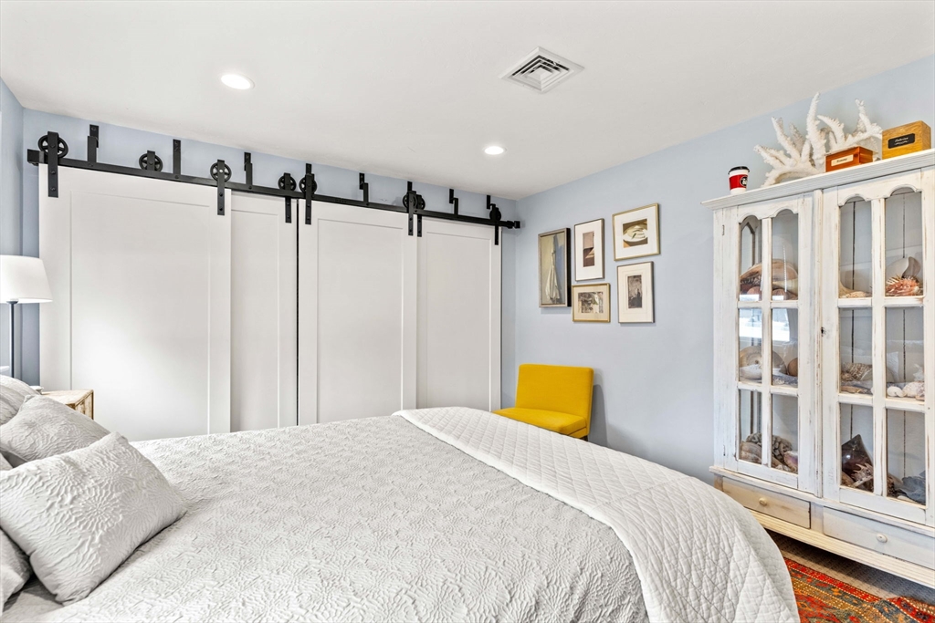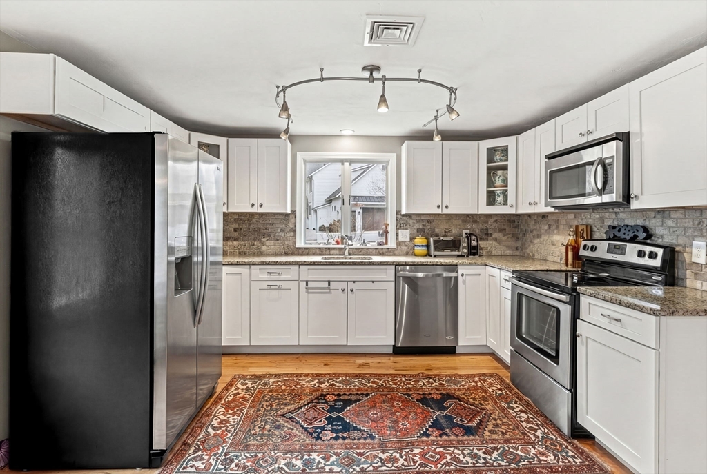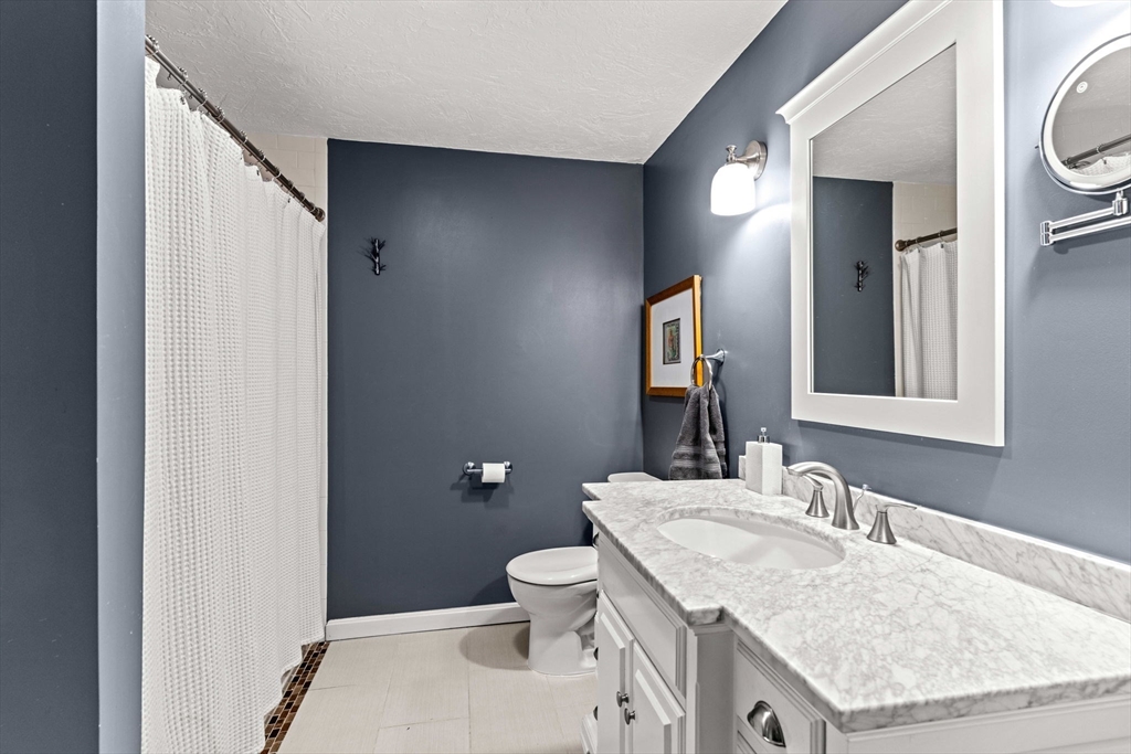 Experience refined living in this elegant second-level condominium, ideally situated just minutes from the vibrant waterfront, boutique shopping, and acclaimed dining of downtown Newburyport. This thoughtfully designed home features rich hardwood flooring, a sunlit living room with custom built-ins and paneled detail, and a sophisticated dining area perfect for entertaining. The kitchen is beautifully appointed with granite countertops, stainless steel appliances, and recessed lighting, blending style with everyday functionality. Two spacious bedrooms offer well sized closets and modern lighting, complemented by a full bath with tilework and a marble vanity. Additional highlights include in-unit laundry, ample storage, direct access to a private deck overlooking an enclosed yard and patio, and generous off-street parking. With easy access to major routes and nearby commuter options, this residence offers a seamless balance of luxury, location, and lifestyle.