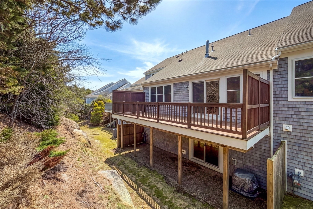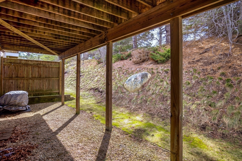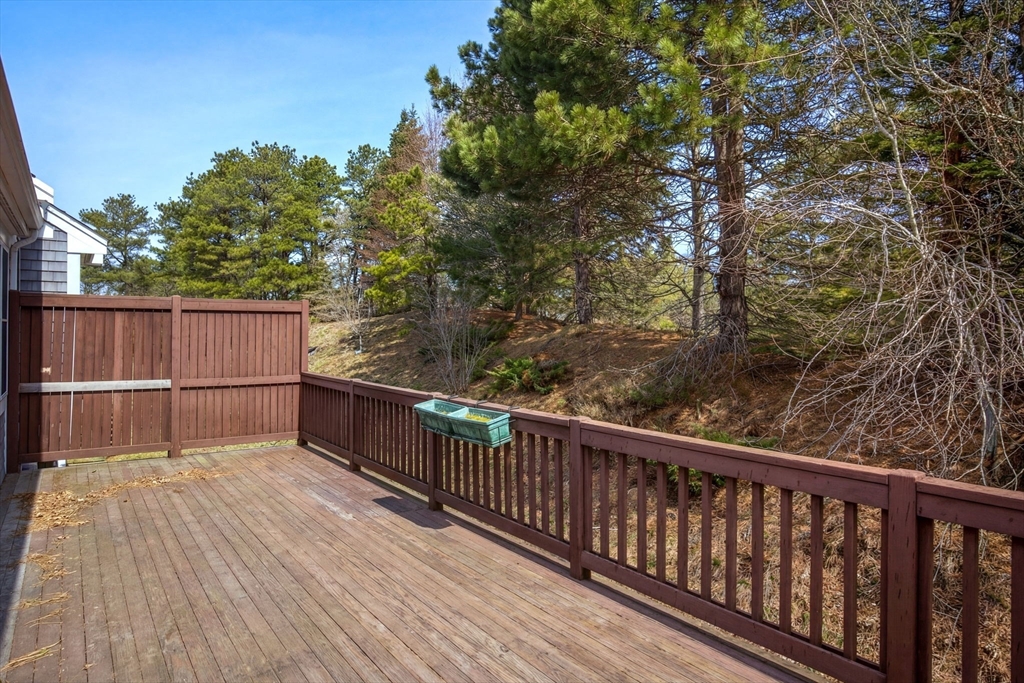 Fantastic one level living "R" style townhome in Winslowe's View at The Pinehills. Enter the courtyard with pavers and plantings through your picket fence. The living room/dining room has a fireplace that leads to a slider out to the expanded deck for outdoor enjoyment. There is a kitchen with a combination den; great for entertaining. Large primary suite with wooded views, a walk-in closet and an ensuite bathroom with double vanity and shower. A guest bedroom with access to a full bath is located on the main floor and a laundry with a 2-car garage that completes this home. Outdoors there is a large, newly replaced deck overlooking a private majestic, wooded view. The HOA includes two pools, pickle ball courts, exterior maintenance, snow and trash removal, plus the Stonebridge Club tennis, pools, exercise and an abundance of clubs.