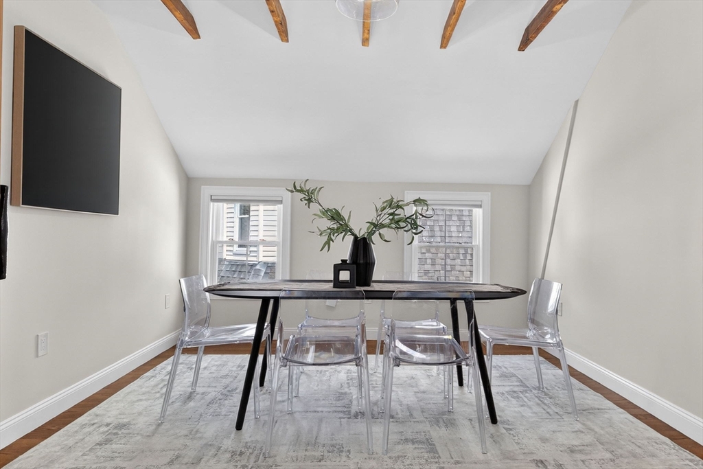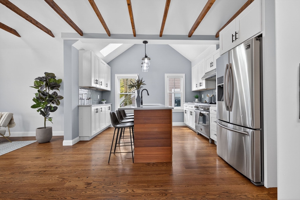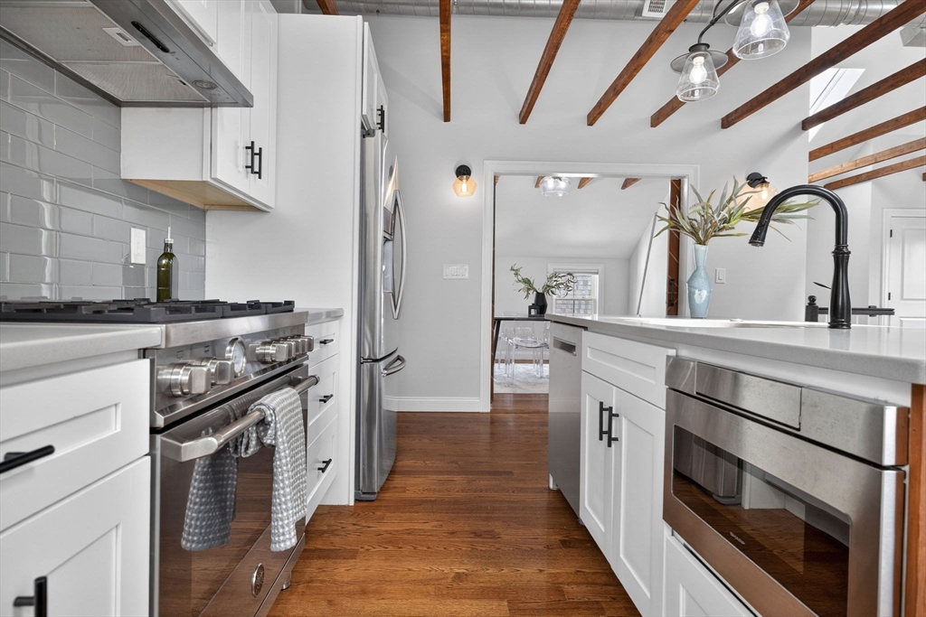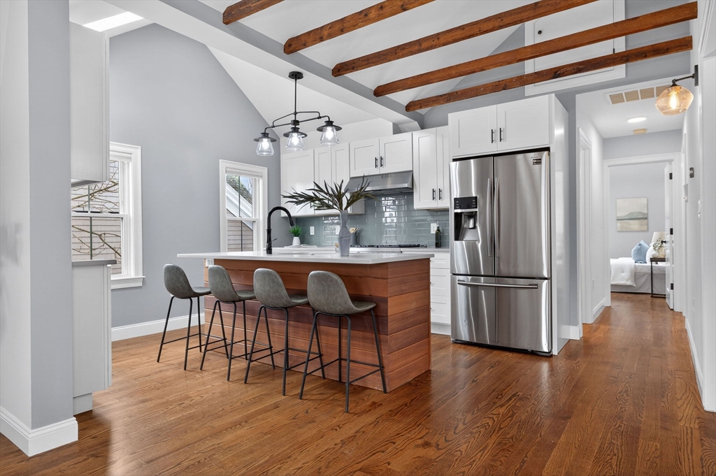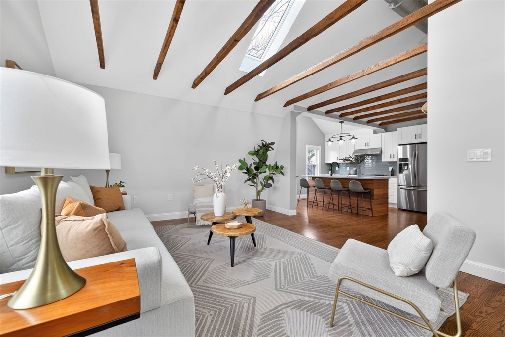 Welcome to this top-floor loft style penthouse set on a quiet, tree-lined street in one of the most sought-after pockets of Somerville. An open, airy layout with restored wood beams and natural light flooding through several skylights defines the home. Inside, you'll find a fully renovated interior grounded in clean & timeless finishes. The kitchen is composed of custom cabinetry, quartz surfaces, stainless steel appliances, and a Bertazzoni range. The intentional kitchen design opens seamlessly into the main living area, creating a perfect space for hosting. Modern comforts include central air, in-unit laundry, a private deck, basement storage, and deeded parking. Positioned just moments from the community path, the Ball Square Green Line, and the evolving mix of restaurants/shops in Ball and Davis Square, the location offers a distinctly Somerville balance of calm residential setting and immediate access to the city. This home won't be available for long!