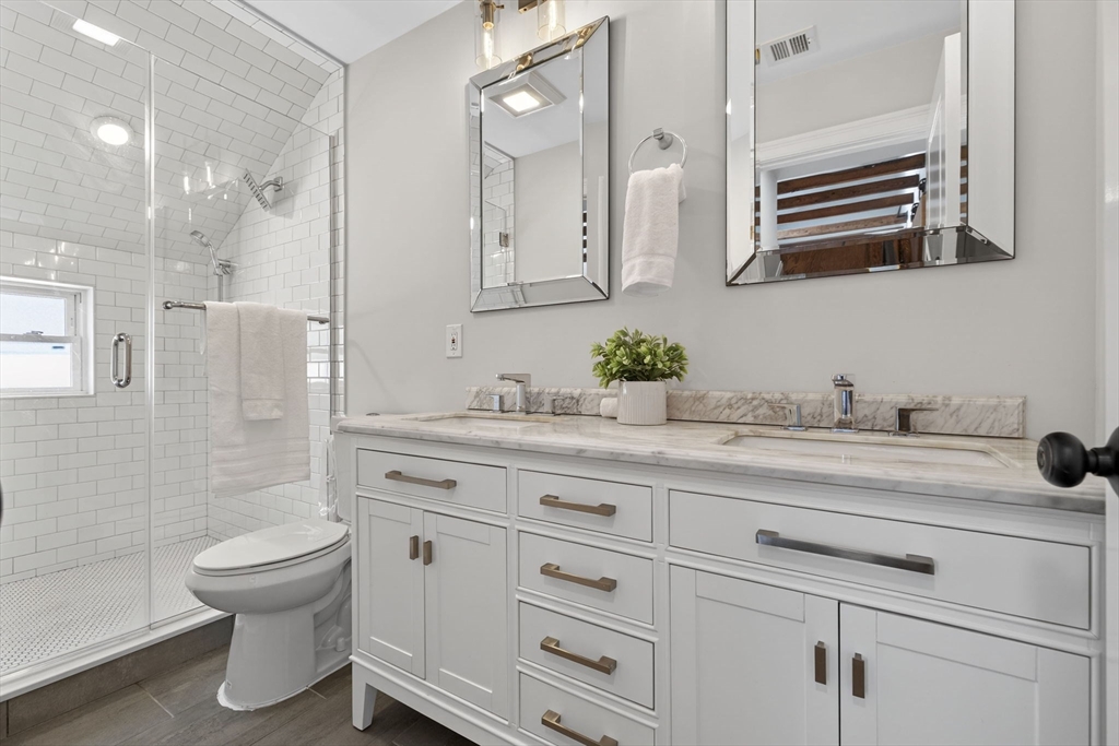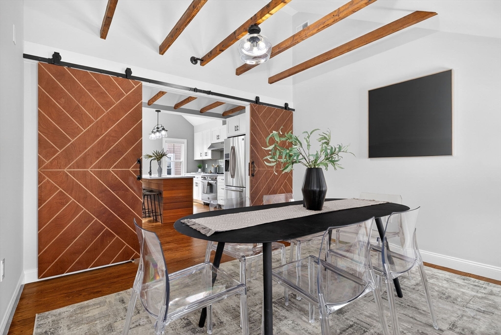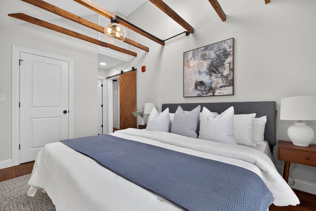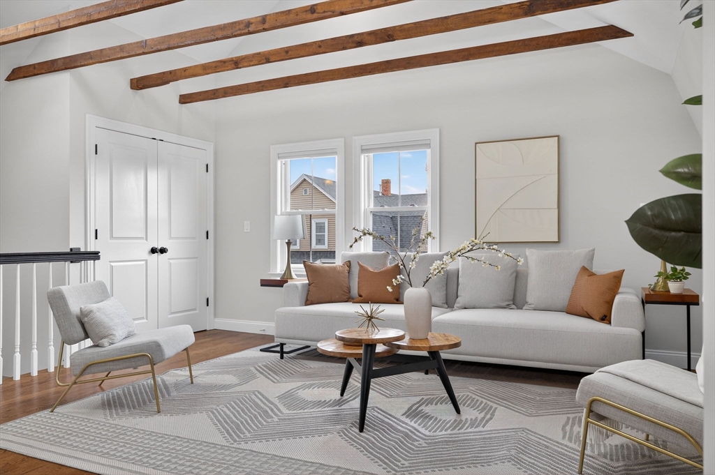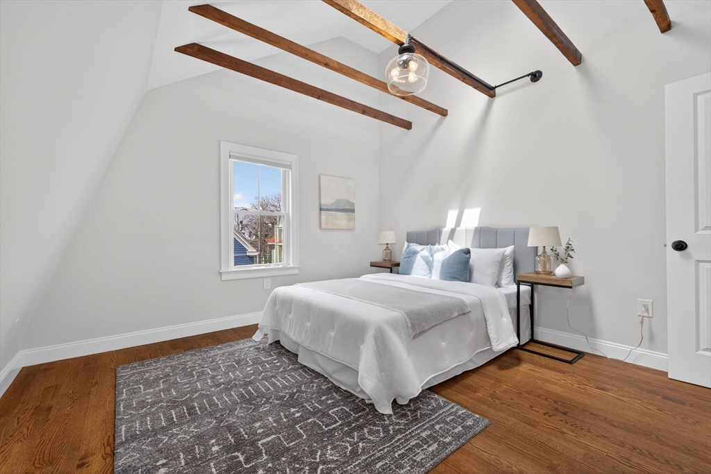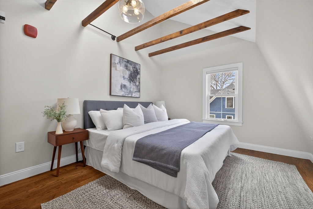 Welcome to this top-floor loft style penthouse set on a quiet, tree-lined street in one of the most sought-after pockets of Somerville. An open, airy layout with restored wood beams and natural light flooding through several skylights defines the home. Inside, you'll find a fully renovated interior grounded in clean & timeless finishes. The kitchen is composed of custom cabinetry, quartz surfaces, stainless steel appliances, and a Bertazzoni range. The intentional kitchen design opens seamlessly into the main living area, creating a perfect space for hosting. Modern comforts include central air, in-unit laundry, a private deck, basement storage, and deeded parking. Positioned just moments from the community path, the Ball Square Green Line, and the evolving mix of restaurants/shops in Ball and Davis Square, the location offers a distinctly Somerville balance of calm residential setting and immediate access to the city. This home won't be available for long!