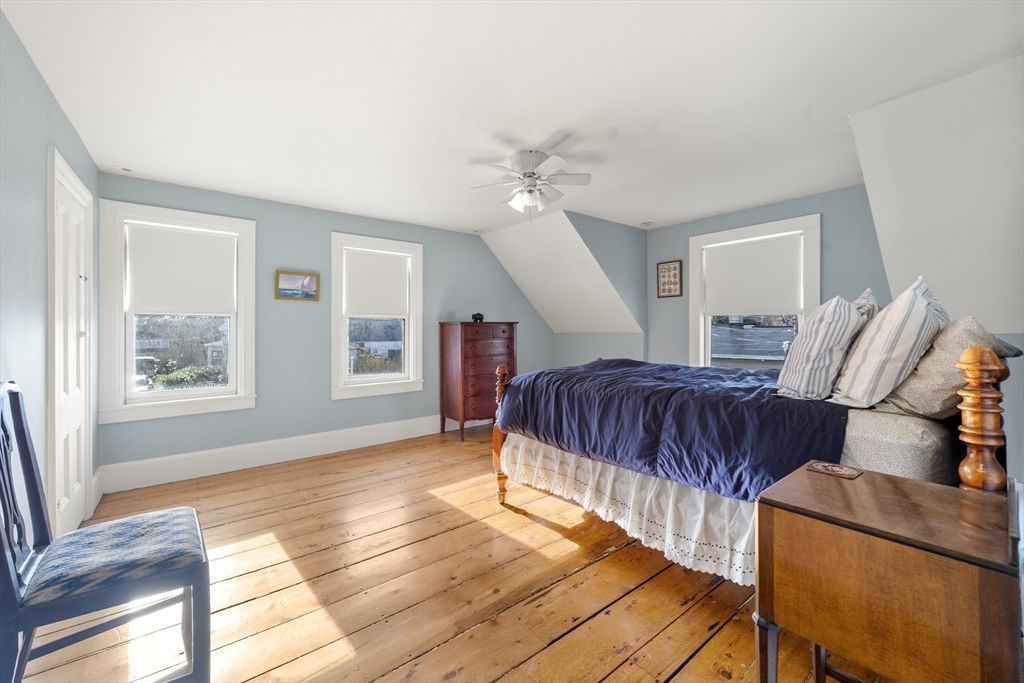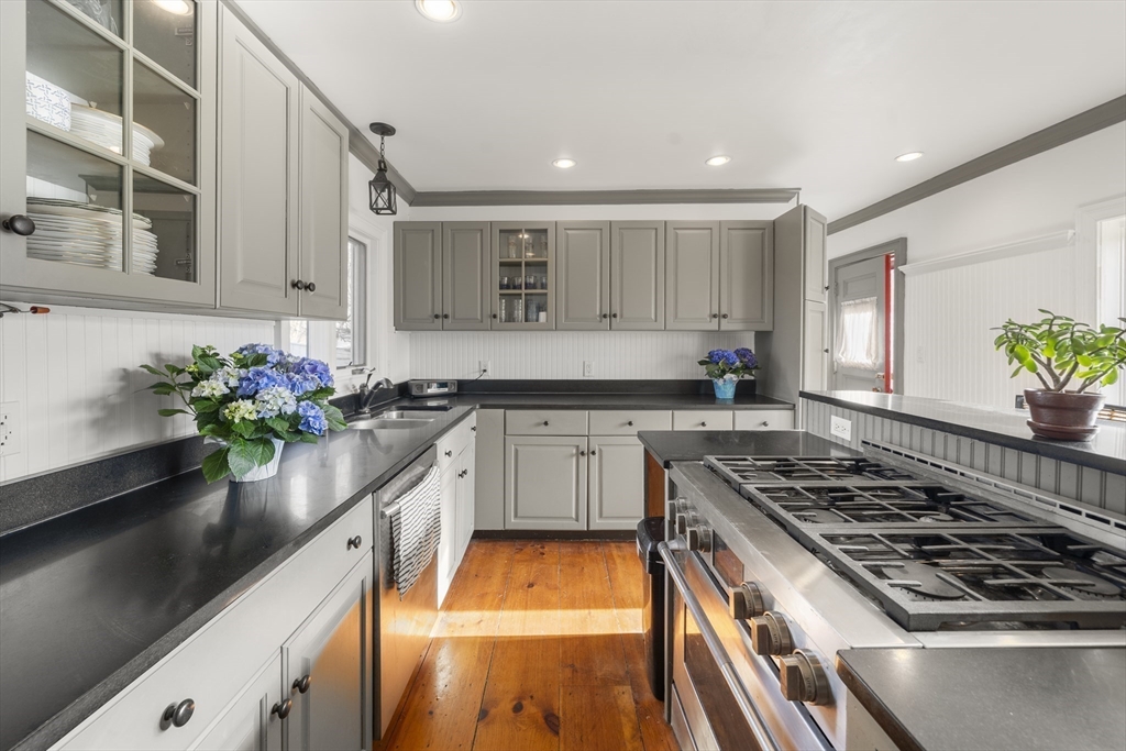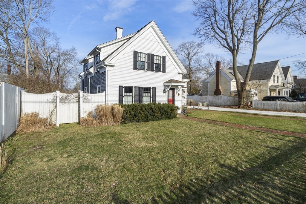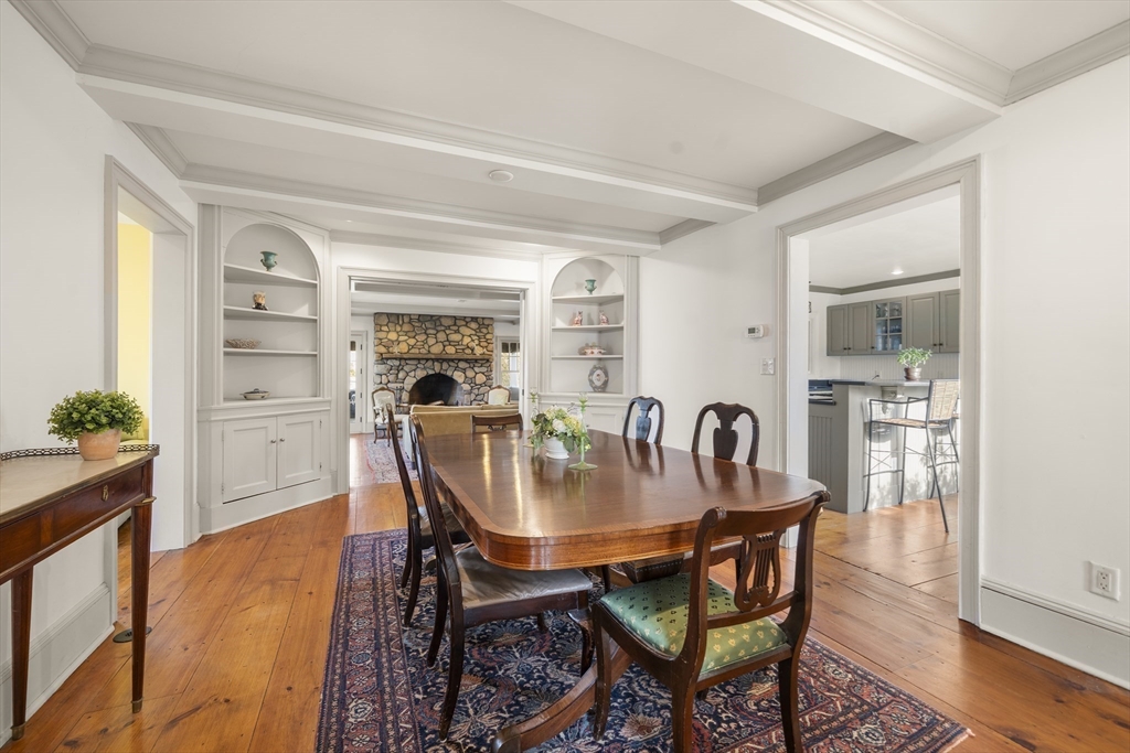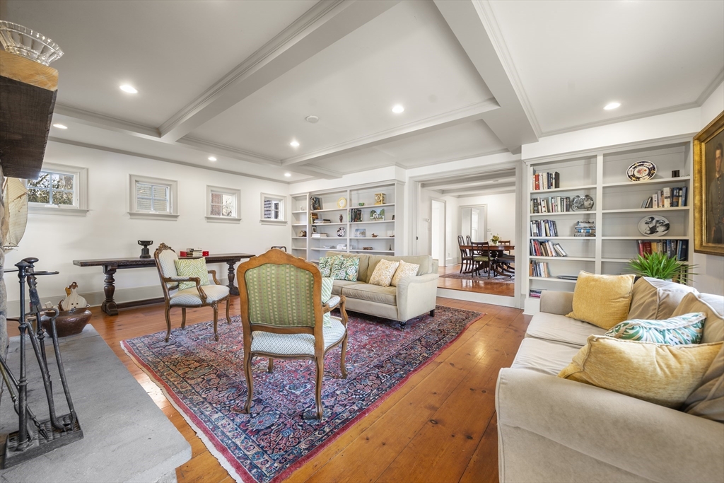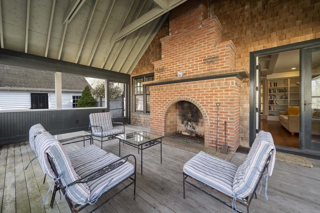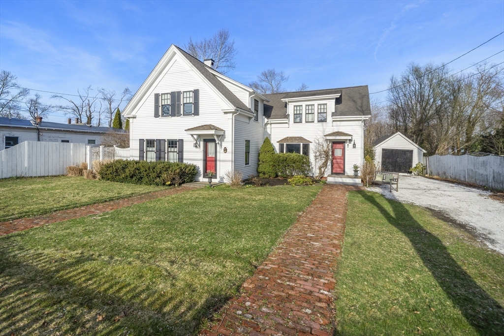 Charming colonial farm house built in 1900 with many modern updates in prime Duxbury village location at Hall’s Corner. Walk to grocery store, restaurants & town shops. 4 bedrooms, 3 full baths, high ceilings & wide pine floors throughout. A 2 story addition in 2007 added a second floor primary bedroom suite & a first floor step down oversize family room with floor to ceiling fieldstone fireplace with beautiful windows, moldings & built in bookshelves, perfect for large family gatherings! French doors from the family room lead to a cathedral covered three season porch with its own brick fireplace, overlooking the beautiful back yard with stone wall garden, brick patio, & mature plantings. Sunny kitchen with granite countertops, & a Jenn-Air six burner commercial oven. Separate Dining Room, & first floor office/den. Also has two zoned central air, & a Kohler whole house generator. The 5 bedroom septic system offers expansion possibilities through the existing shed or separate ADU.