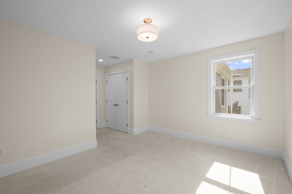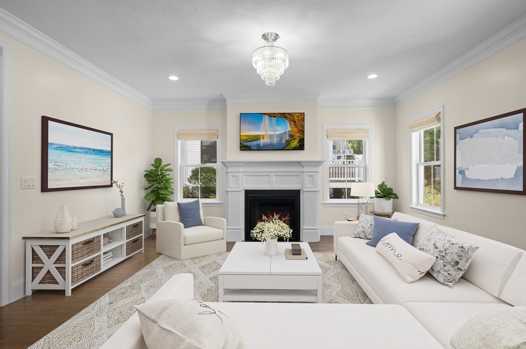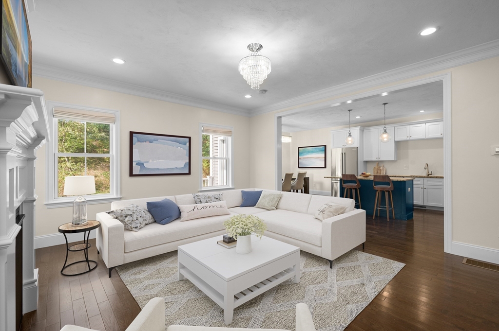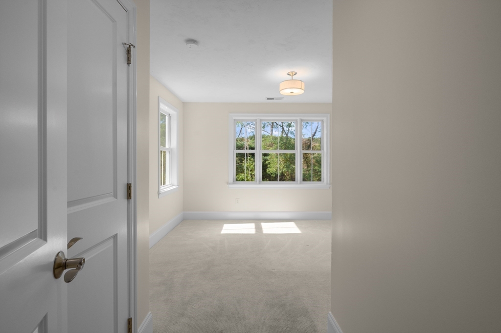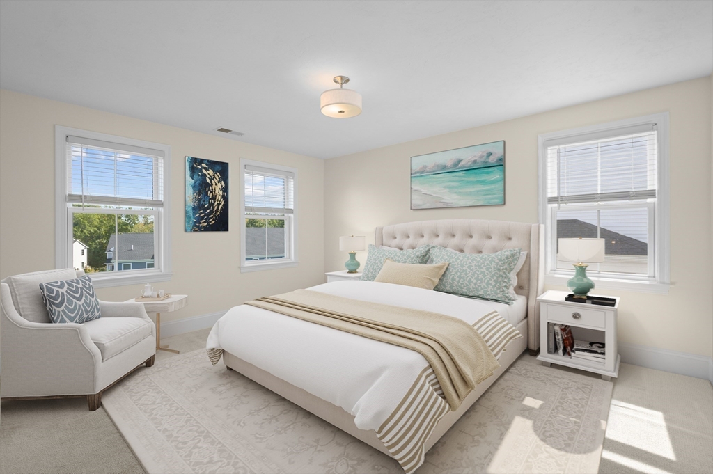 Welcome to The Village at Bailey's Pond—a sought-after townhome community in Amesbury. Enjoy maintenance free living in this beautifully maintained 3-bedroom, 2.5 bath end unit that offers abundant natural light, tree-lined views, and a desirable setting at the top of the community. The main level features 9-foot ceilings, hardwood floors, and a gas fireplace with custom millwork. The kitchen offers ample cabinet space, granite countertops, and stainless steel Bosch appliances, centered on an island perfect for everyday living or entertaining.Upstairs, the primary suite features hardwood floors and two spacious closets (one walk-in). Two guest bedrooms, a full bath, and laundry complete the second floor. The unfinished lower level is pre-plumbed for a full bath, offering expansion potential.Enjoy a private patio, two-car garage, clubhouse, nature trail, and proximity to downtown Amesbury, Newburyport, and major routes. The kitchen, living, bedrooms, and patio have been virtually staged