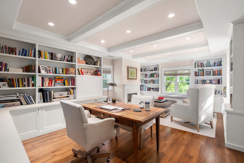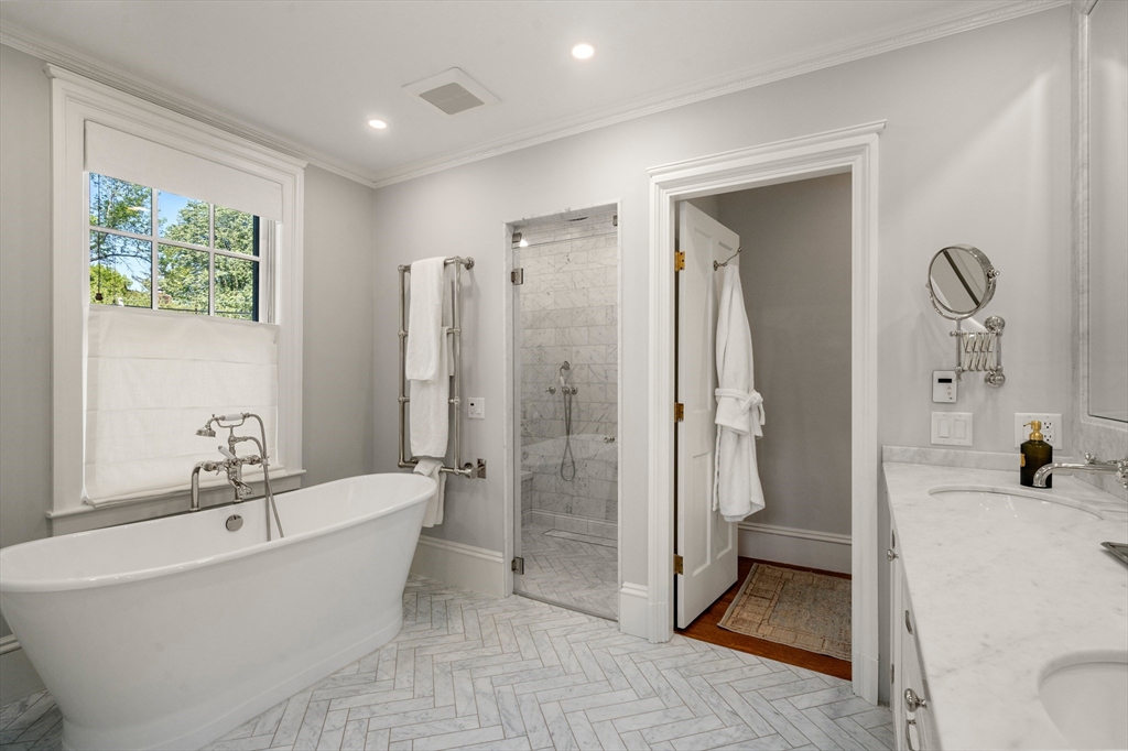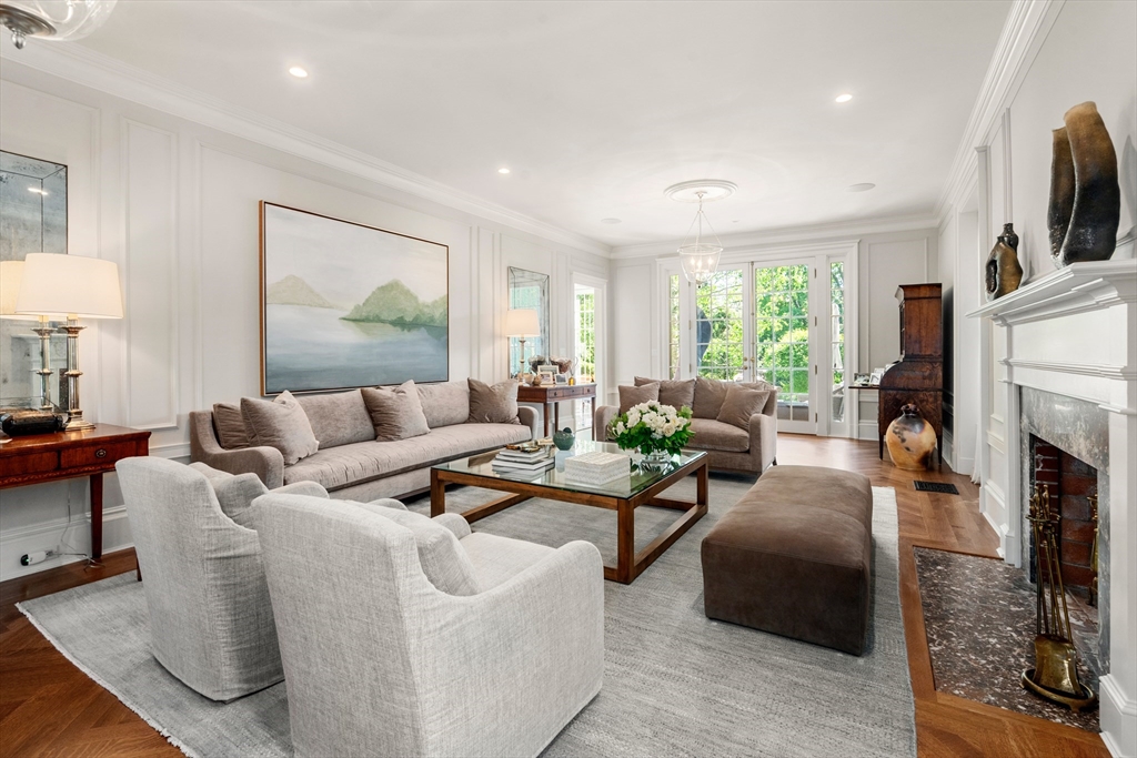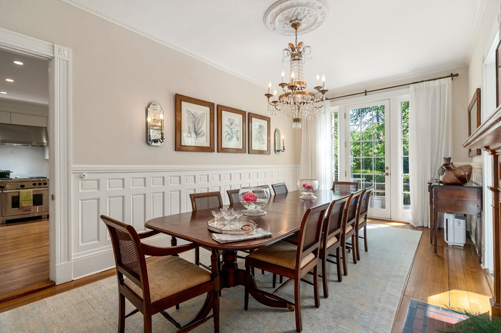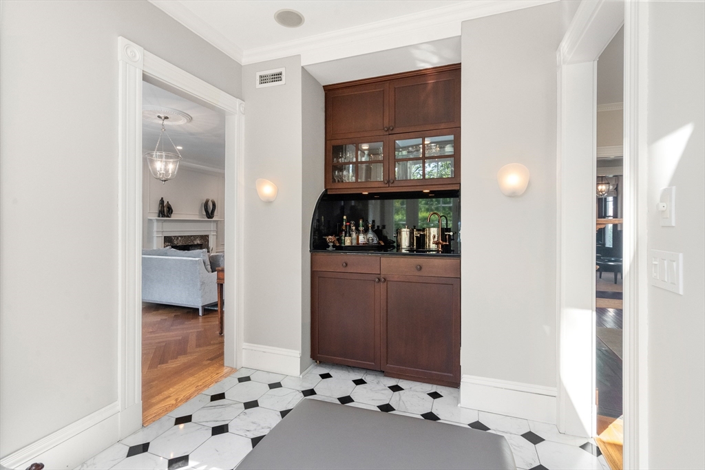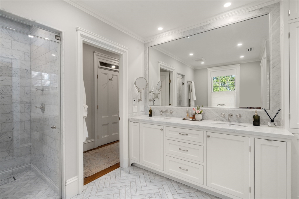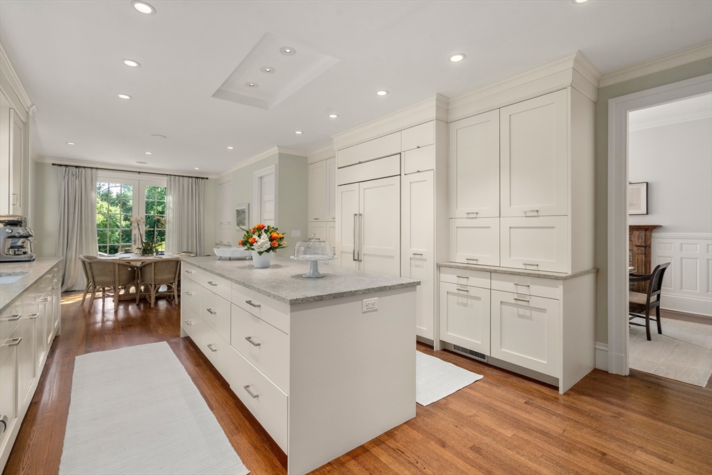 Thoughtfully renovated with the utmost attention to preservation & luxury living, this breathtaking property offers expansive space surrounded by park-like grounds. Designed for grand-scale entertaining, the first floor offers soaring ceilings with sound throughout, fireplaces, custom millwork, bay windows, herringbone floors, a bar, and flow to the bluestone patio that runs the length of the house. A true chef's kitchen showcases SubZero & Wolf appliances, leathered granite countertops, matte glass backsplash, and appliance garages. Upstairs, there is a lux 21' primary suite with a spa-like marble bath, 2 additional suites, and a fully-outfitted office/family room. The top floor guest quarters offers a kitchen, living room, and 2 suites. Deluxe wine cellar on lower level. Professionally landscaped multi-level gardens leading down to a peaceful stream. Under a mile to Newton Country Day, Bigelow, and Underwood. Within 15 minutes of Shady Hill School, BB&N, Boston, and The Shops.